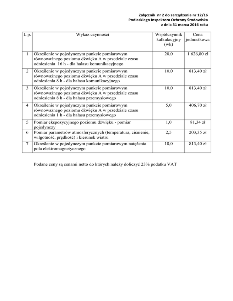 Załącznik nr 2 do zarządzenia nr 12/16 Podlaskiego Inspektora Ochrony Środowiska z dnia 31 marca 2016 roku L.p. Wykaz czynności Współczynnik Cena kalkulacyjny jednostkowa (wk) 1 Określenie w pojedynczym punkcie pomiarowym równoważnego poziomu dźwięku A w przedziale czasu odniesienia 16 h - dla hałasu komunikacyjnego 20,0 1 626,80 zł 2 Określenie w pojedynczym punkcie pomiarowym równoważnego poziomu dźwięku A w przedziale czasu odniesienia 8 h - dla hałasu komunikacyjnego 10,0 813,40 zł 3 Określenie w pojedynczym punkcie pomiarowym równoważnego poziomu dźwięku A w przedziale czasu odniesienia 8 h - dla hałasu przemysłowego 10,0 813,40 zł 4 Określenie w pojedynczym punkcie pomiarowym równoważnego poziomu dźwięku A w przedziale czasu odniesienia 1 h - dla hałasu przemysłowego 5,0 406,70 zł 5 Pomiar ekspozycyjnego poziomu dźwięku - pomiar pojedynczy Pomiar parametrów atmosferycznych (temperatura, ciśnienie, wilgotność, prędkość) i kierunek wiatru 1,0 81,34 zł 2,5 203,35 zł Określenie w pojedynczym punkcie pomiarowym natężenia pola elektromagnetycznego 10,0 813,40 zł 6 7 Podane ceny są cenami netto do których należy doliczyć 23% podatku VAT