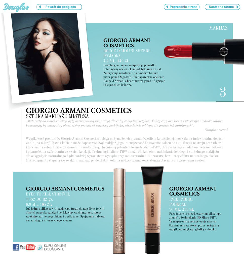 HTMLlink Vorigelink Poprzednia strona Powrót do podgl¹du Nastepna strona Naechstelink makijaż giorgio armani cosmetics Rouge d’Armani Sheers, POMADKA, 4,2 ML, 140 ZŁ Rewolucyjna, nowa kompozycja pomadki. Intensywny odcień i komfort balsamu do ust. Zatrzymuje nawilżenie na powierzchni ust przez ponad 8 godzin. Transparentne odcienie Rouge d’Armani Sheers tworzy gama 12 żywych i eleganckich kolorów. 3 GIORGIO ARMANI cosmetics SZTUKA MAKIJAŻU mistrza „Materiały do moich kolekcji były bezpośrednią inspiracją dla całej gamy kosmetyków. Pokrywają one twarz i ukrywają niedoskonałości. Pozwalają, by naturalny blask skóry przenikał warstwy makijażu, niezależnie od tego, ile zostało ich nałożonych”. Giorgio Armani Wyjątkowość produktów Giorgio Armani Cosmetics polega na tym, że ich płynna, świetlista konsystencja pozwala na indywidualne dopasowanie „na miarę”. Każda kobieta może dopasować swój makijaż, jego intensywność i nasycenie koloru do aktualnego nastroju oraz ubioru, który ma na sobie. Dzięki zastosowaniu unikatowej, chronionej patentem formuły Micro-FilTM, Giorgio Armani nadał kosmetykom lekkość i płynność, na wzór tkanin ze swoich kolekcji. Technologia Micro-FilTM umożliwia kobietom nakładanie lekkiego i subtelnego makijażu dla osiągnięcia naturalnego bądź bardziej wyrazistego wyglądu przy zastosowaniu kilku warstw, bez utraty efektu naturalnego blasku. Mikropigmenty stapiają się ze skórą, nadając jej delikatny kolor, a nadzwyczajna konsystencja otacza twarz zwiewnym woalem. giorgio armani cosmetics EYES TO KILL STRETCH, TUSZ DO RZĘS, 6,9 ml, 165 zł Już jedna aplikacja wydłużającego tuszu do rzęs Eyes to Kill Stretch pozwala uzyskać perfekcyjny wachlarz rzęs. Rzęsy są ekstremalnie pogrubione i wydłużone. Spojrzenie nabiera wyrazistego i intensywnego wyrazu. giorgio armani cosmetics FACE FABRIC, Podkład, 30 ML, 215 ZŁ Face fabric to niewidoczny makijaż typu „nude” z technologią 3D Micro-Fil™. Transparentna konsystencja niczym tkanina muska skórę, pozostawiając ją wyjątkowo miękką i gładką w dotyku.