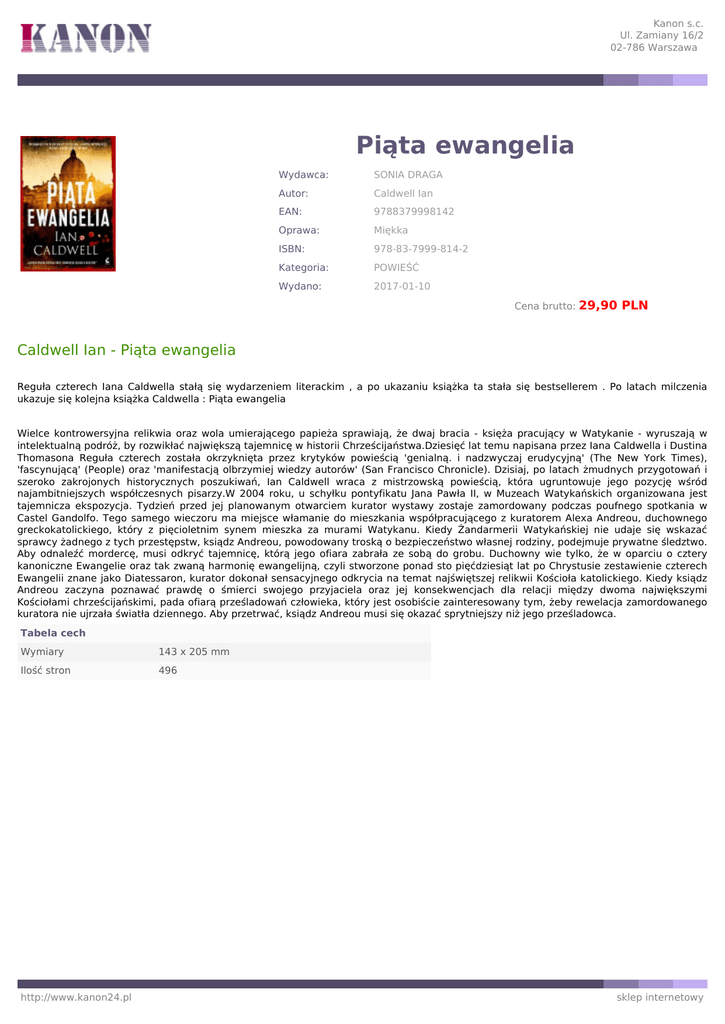 Kanon s.c. Ul. Zamiany 16/2 02-786 Warszawa Piąta ewangelia Wydawca: SONIA DRAGA Autor: Caldwell Ian EAN: 9788379998142 Oprawa: Miękka ISBN: 978-83-7999-814-2 Kategoria: POWIEŚĆ Wydano: 2017-01-10 Cena brutto: 29,90 PLN Caldwell Ian - Piąta ewangelia Reguła czterech Iana Caldwella stałą się wydarzeniem literackim , a po ukazaniu książka ta stała się bestsellerem . Po latach milczenia ukazuje się kolejna książka Caldwella : Piąta ewangelia Wielce kontrowersyjna relikwia oraz wola umierającego papieża sprawiają, że dwaj bracia - księża pracujący w Watykanie - wyruszają w intelektualną podróż, by rozwikłać największą tajemnicę w historii Chrześcijaństwa.Dziesięć lat temu napisana przez Iana Caldwella i Dustina Thomasona Reguła czterech została okrzyknięta przez krytyków powieścią 'genialną. i nadzwyczaj erudycyjną' (The New York Times), 'fascynującą' (People) oraz 'manifestacją olbrzymiej wiedzy autorów' (San Francisco Chronicle). Dzisiaj, po latach żmudnych przygotowań i szeroko zakrojonych historycznych poszukiwań, Ian Caldwell wraca z mistrzowską powieścią, która ugruntowuje jego pozycję wśród najambitniejszych współczesnych pisarzy.W 2004 roku, u schyłku pontyfikatu Jana Pawła II, w Muzeach Watykańskich organizowana jest tajemnicza ekspozycja. Tydzień przed jej planowanym otwarciem kurator wystawy zostaje zamordowany podczas poufnego spotkania w Castel Gandolfo. Tego samego wieczoru ma miejsce włamanie do mieszkania współpracującego z kuratorem Alexa Andreou, duchownego greckokatolickiego, który z pięcioletnim synem mieszka za murami Watykanu. Kiedy Żandarmerii Watykańskiej nie udaje się wskazać sprawcy żadnego z tych przestępstw, ksiądz Andreou, powodowany troską o bezpieczeństwo własnej rodziny, podejmuje prywatne śledztwo. Aby odnaleźć mordercę, musi odkryć tajemnicę, którą jego ofiara zabrała ze sobą do grobu. Duchowny wie tylko, że w oparciu o cztery kanoniczne Ewangelie oraz tak zwaną harmonię ewangelijną, czyli stworzone ponad sto pięćdziesiąt lat po Chrystusie zestawienie czterech Ewangelii znane jako Diatessaron, kurator dokonał sensacyjnego odkrycia na temat najświętszej relikwii Kościoła katolickiego. Kiedy ksiądz Andreou zaczyna poznawać prawdę o śmierci swojego przyjaciela oraz jej konsekwencjach dla relacji między dwoma największymi Kościołami chrześcijańskimi, pada ofiarą prześladowań człowieka, który jest osobiście zainteresowany tym, żeby rewelacja zamordowanego kuratora nie ujrzała światła dziennego. Aby przetrwać, ksiądz Andreou musi się okazać sprytniejszy niż jego prześladowca. Tabela cech Wymiary 143 x 205 mm Ilość stron 496 http://www.kanon24.pl sklep internetowy