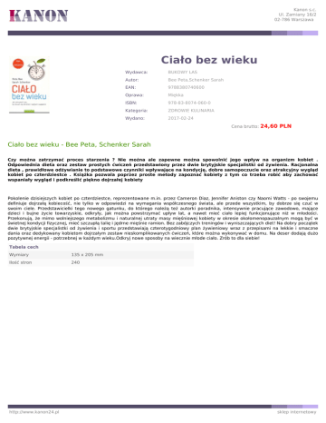 Kanon s.c. Ul. Zamiany 16/2 02-786 Warszawa Ciało bez wieku Wydawca: BUKOWY LAS Autor: Bee Peta,Schenker Sarah EAN: 9788380740600 Oprawa: Miękka ISBN: 978-83-8074-060-0 Kategoria: ZDROWIE KULINARIA Wydano: 2017-02-24 Cena brutto: 24,60 PLN Ciało bez wieku - Bee Peta, Schenker Sarah Czy można zatrzymać proces starzenia ? Nie można ale zapewne można spowolnić jego wpływ na organizm kobiet . Odpowiednia dieta oraz zestaw prostych ćwiczeń przedstawiony przez dwie brytyjskie specjalistki od żywienia. Racjonalna dieta , prawidłowe odżywianie to podstawowe czynniki wpływające na kondycję, dobre samopoczucie oraz atrakcyjny wygląd kobiet po czterdziestce . Książka pozwala poprzez proste metody zapoznać kobiety z tym co trzeba robić aby zachować wspaniały wygląd i podkreślić piękno dojrzałej kobiety Pokolenie dzisiejszych kobiet po czterdziestce, reprezentowane m.in. przez Cameron Diaz, Jennifer Aniston czy Naomi Watts - po swojemu definiuje dojrzałą kobiecość, nie tylko w odpowiedzi na wymagania współczesnego świata, ale przede wszystkim, by dobrze się czuć w swoim ciele. Przedstawicielki tego nowego gatunku, do którego należą też autorki poradnika, intensywnie pracujące zawodowo, mające dzieci i bujne życie towarzyskie, odkryły, jak można powstrzymać upływ lat, a nawet mieć ciało lepiej funkcjonujące niż w młodości. Przekonują, że mimo wolniejszego metabolizmu i naturalnej utraty masy mięśniowej kobiety w okresie okołomenopauzalnym mogą być w świetnej kondycji fizycznej, mieć szczupłą talię i jędrne mięśnie ramion. Bez zabójczych treningów i wyniszczających diet! Na dobry początek dwie brytyjskie specjalistki od żywienia i sportu przedstawiają czterotygodniowy plan żywieniowy wraz z przepisami na lekkie i smaczne dania oraz dedykowany kobietom dojrzałym zestaw nieskomplikowanych ćwiczeń, które można wykonywać w domu. Na deser dodają dużo pozytywnej energii - potrzebnej w każdym wieku.Odkryj nowe sposoby na wiecznie młode ciało. Zrób to dla siebie! Tabela cech Wymiary 135 x 205 mm Ilość stron 240 http://www.kanon24.pl sklep internetowy