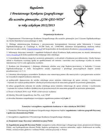 Regulamin I Powiatowego Konkursu Geograficznego dla uczniów gimnazjów „GIM-GEO-WIN” w roku szkolnym 2012/2013 §1 Organizacja Konkursu 1. Organizatorem I Powiatowego Konkursu Geograficznego dla uczniów gimnazjów jest I Liceum Ogólnokształcące im. Króla Stanisława Leszczyńskiego w Jaśle 2. Obsługę administracyjną Konkursu i przyjmowanie korespondencji listownej pełni Sekretariat I Liceum Ogólnokształcącego ul. Czackiego 4, 38-200 Jasło, tel. 134463464, natomiast korespondencję mailową należy kierować na adres szkoły [email protected] lub bezpośrednio do koordynatora Konkursu [email protected]. 3. Informacje dotyczące tematyki i zagadnień kolejnych edycji Konkursu będą umieszczane na stronie internetowej www.1lo.jaslo.pl do końca października kolejnego roku szkolnego. 4. Uczestnikami Konkursu mogą być uczniowie gimnazjów, a ich udział w Konkursie jest dobrowolny. Osoby biorące udział w Konkursie wyrażają zgodę na upublicznianie ich imienia i nazwiska oraz uzyskanego wyniku na stronie internetowej I LO w celu ogłoszenia wyników. 5. Konkurs jest dwuetapowy i obejmuje eliminacje szkolne oraz etap finałowy/powiatowy w budynku I Liceum Ogólnokształcącego w Jaśle. Szczegółowe zasady organizacji i przebiegu poszczególnych etapów zostały przedstawione w § 3 i 4. 6. Literaturę obowiązującą uczestników Konkursu oraz stanowiącą pomoc dla nauczyciela w przygotowaniu uczniów na wszystkich etapach konkursu stanowią: a) podręczniki dopuszczone do użytku szkolnego przez ministra właściwego do spraw oświaty i wychowania i wpisane do wykazu podręczników szkolnych przeznaczonych do nauczania geografii na poziomie gimnazjum; b) atlasy geograficzne zalecane do użytku szkolnego przez ministra właściwego do spraw oświaty i wychowania i wpisane do wykazu środków dydaktycznych przeznaczonych do nauczania geografii na poziomie gimnazjum; c) Świat w liczbach 2010, wyd. WSiP; (i/lub nowsze wydania) d) Szkolny Słownik Geograficzny Jan Flis, wyd. WSiP e) dowolna literatura uzupełniająca rozwijająca zagadnienia podane w § 2 pkt. 2 §2 Tematyka i szczegółowe zagadnienia konkursu w roku szkolnym 2012/2013 1. Tematyka I Powiatowego Konkursu Geograficznego obejmować będzie zagadnienia z zakresu geografii fizycznej i społeczno-ekonomicznej Polski 2. Szczegółowe zagadnienia I Powiatowego Konkursu Geograficznego obejmują: a) Znajomość mapy fizycznej i administracyjnej Polski b) Zagadnienia geografii fizycznej Polski: następstwa ruchu obrotowego i obiegowego ziemi, przejściowość klimatu Polski, sieć hydrograficzna obszaru Polski, budowa geologiczna i surowce mineralne, wpływ zlodowaceń na rzeźbę Polski, zróżnicowanie glebowe i roślinne Polski, ochrona przyrody w Polsce c) Zagadnienia geografii społeczno-ekonomicznej Polski: demografia i osadnictwo – rozmieszczenie ludności, piramida wieku i płci społeczeństwa polskiego, zróżnicowanie narodowościowe i religijne w Polsce, hierarchia miast, historyczna geneza miast i współczesne procesy urbanizacyjne; gospodarka – warunki rozwoju rolnictwa i główne obszary uprawy i hodowli w Polsce, energetyka i przemysł – przemiany, problemy, główne okręgi przemysłowe, transport, turystyka – najważniejsze zabytki i walory turystyczne d) Przynależność Polski do organizacji międzynarodowych oraz procesy integracyjne – euroregiony, regiony kulturowe §3 I etap Konkursu – eliminacje szkolne 1. Uczniowie zainteresowani uczestnictwem w eliminacjach szkolnych zgłaszają się lub są typowani przez nauczycieli uczących geografii - liczba uczestników jest dowolna i ustala ją nauczyciel/zespół koordynujący ten etap w szkole. 2. Termin przeprowadzenia testu w szkołach ustala się na 14 marca 2013 r. Zastrzega się ujawniania młodzieży treści zadań zawartych w teście przed datą rozpoczęcia konkursu. 3. Uczestnicy rozwiązują test sprawdzający wiedzę i umiejętności geograficzne w czasie 45 min. Mogą podczas rozwiązywania zadań korzystać z przyborów kreślarskich i kalkulatora prostego. 4. Nauczyciele poprawiają test według przesłanego wraz z regulaminem i zestawem testowym klucza odpowiedzi i tworzą ranking uczniów w swojej szkole. 5. Listę rankingową uczniów w formie elektronicznej (zawierającą imię i nazwisko ucznia, nazwę szkoły, klasę, nazwisko nauczyciela oraz liczbę zdobytych punktów) nauczyciele koordynujący eliminacje szkolne przesyłają na adres mailowy koordynatora konkursu powiatowego Sebastiana Styczyńskiego - [email protected] do dnia 21 marca 2013 r. W przypadku otrzymania korespondencji będzie wysyłany mail zwrotny z informacją o skuteczności doręczenia listy rankingowej. 6. Na podstawie wszystkich list rankingowych, które spłyną do koordynatora powiatowego ustalony zostanie próg punktowy kwalifikujący uczniów z najlepszymi wynikami do etapu finałowego. 7. Ostateczna lista osób zakwalifikowanych do etapu finałowego/powiatowego zostanie opublikowana na stronie I Liceum Ogólnokształcącego w Jaśle www.1lo.jaslo.pl do dnia 28 marca 2013 r. oraz drogą mailową zostaną poinformowane szkoły, z których uczniowie zakwalifikowali się do powiatowego etapu finałowego Konkursu. §4 II etap Konkursu – finał powiatowy konkursu 1. Etap finałowy Konkursu przeprowadzony zostanie w auli I Liceum Ogólnokształcącego w Jaśle dnia 5 kwietnia 2013 r. o godz. 1000. 2. Koszty związane z uczestnictwem w etapie finałowym Konkursu (np. dojazd) ponoszą szkoły macierzyste. 3. Test etapu finałowego będzie miał zbliżoną formę do etapu szkolnego i trwał będzie 45 min. 4. Lista rankingowa najlepszych uczniów w tym laureatów (miejsca od 1 do 10) zostanie ogłoszona w przeciągu 5 dni roboczych od daty przeprowadzenia konkursu i ukaże się na stronie internetowej szkoły – www.1lo.jaslo.pl . 5. Wszystkim laureatom zostaną wysłane pamiątkowe dyplomy natomiast laureaci trzech pierwszych miejsc opróc