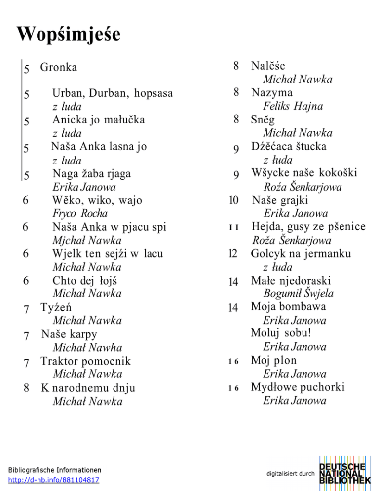 Wopśimjeśe 5 Gronka 5 5 5 5 6 6 6 6 7 7 7 8 Urban, Durban, hopsasa z luda Anicka jo małučka z luda Naša Anka lasna jo z luda Naga žaba rjaga Erika Janowa Wĕko, wiko, wajo Fryco Rocha Naša Anka w pjacu spi Mjchał Nawka Wjelk ten sejźi w lacu Michał Nawka Chto dej łojś Michał Nawka Tyźeń Michał Nawka Naše karpy Michał Nawha Traktor pomocnik Michał Nawka K narodnemu dnju Michał Nawka http://d-nb.info/881104817 8 8 8 9 9 10 I I 12 14 14 16 16 Nalĕśe Michał Nawka Nazyma Feliks Hajna Snĕg Michał Nawka Dźĕćaca štucka z łuda Wšycke naše kokoški Roźa Šenkarjowa Naše grajki Erika Janowa Hejda, gusy ze pšenice Roža Šenkarjowa Golcyk na jermanku z łuda Małe njedoraski Bogumił Šwjela Moja bombawa Erika Janowa Moluj sobu! Erika Janowa Moj plon Erika Janowa Mydłowe puchorki Erika Janowa Dešć Fryttf Rocha *8 Ruprajcht se pora Marjana Domaškojc Zapust 19 Fryco Rocha 19 Wjasołe camprowarje Hilda Kutšankowa 2 0 N a camprowanje Erika Janowa 2 0 Srocyna swajźba Michal Nawka 21 Narjony Fryco Erika Janowa 22 Wonychojski coo Erika Janowa 24 Witaj do šule! Erika Janowa 24 Źĕśi wuknu Michał Nawka 25 Co Michał kśĕł byś Erika Janowa 2 6 Trariram, prozniny su tam! Roźa Šenkarjowa 27 Do lĕgwa Płomjenja Erika Janowa 17 Na źeń źĕśi Erika Janowa 28 Halo, Danka! Erika Janowa Narodniny 2 9 Roža Šenkarjowa N a reju 3 0 Er'tka Janowa Wandrarski spĕw 3i Hendrich Jordan Mamje k dnju žeńskich 32 Erika Janowa Našym wucabnikam 32 Feliks Hajna Wjele gluki žycymy 33 Erika Janowa Luba knĕni wucabnica! 33 Erika Janowa 34 Źĕk wucabnikoju Erika Janowa 34 Prĕdny maj Erika Janowa 35 Swĕźeń republiki Erika Janowa 35 Republika, lic ty ze mnu! Erika Janowa 27 36 36 37 38 38 40 41 42 43 44 45 45 46 Źĕłaśerskej stronje Alfons Handrik Derbstwo Thalmanna Erika Janowa Duch Thalmanna Erika Janowa Moj bratš jo wojak Erika Janowa Žycenja Erika Janowa Mama, co jo carny dešć? Erika Janowa Twoje statki rozsuźe Erika Janowa Nazgonjenja wo wojnach Ktto Lorenc Njestoj! Mina Witkojc Stoj sam! Mina Withojc Nalĕto Fryco Rocha To nalĕto jo pśišło Fryco Rocha Nalĕto Mato Kosyk Nalĕśe Hync Rychtar Nalĕśe 48 Marjana Domaškojc Głose ptaškow w nalĕśu 49 Hendrich Jordan W nalĕśu 50 Mina Witkojc 50 Maj Fryco Rocha 5i Majska noc Mina Witkojc 5i Łokaśinki Mato Kosyk 52. Pcołka Fryco Rocha 52 Bośon Hendrich Jordan 53 Lĕśe Fryco Rocha Swĕś, słyńcko 54 Mina Witkojc 55 Žnjowe wjasele Fryco Rocha Nazymje ako molař a tkalc 55 Fryco Rocha 47 Nazymska pĕseń Juro Surowin 57 Cakaj, luba zyma, cakaj! Erika Janowa 58 Marznu ptaški - marznu ja! Erika Janowa -59 Ptaški w zymje Mina Witkojc 59 Zmil se! Fryco Rocha 6o Zymje w Błotach Mato Kosyk 6 i Zymje božemje Erika Janowa 6 i Pojź sobu do Serbow! Fryco Rocha 6 2 Błota Fryco Rocha 62 Pilne Błośanarje Hilda Kutšankowa 63 Naša rĕdna domownja Ingrid Nagelowa 63 Spĕwanja moc Mato Rizo 64 Serbski narod Mina Witkojc 56 64 Wo bomje serbstwa Mato Kosyk 65 Požedanje za domom Mato Kosyk 66 Serbska zemja Fryco Rocha 67 Źo hyšći Serby bydle? Fryco Rocha 68 Źož som ja roźony Hendrich Jordan 68 Roztyla Juro Surowin Naša droga 69 Erika Janowa Graśa 70 N a jsy nam se spodoba 70 Hilda Kutšankowa Camprowarje 7i Erika Janowa Spĕwarski swĕźeń ptaškow 74 Werner Meškank Liška a kružk 79 Erika Janowa 81 Juro - mejstař w kuchni Erika Janowa