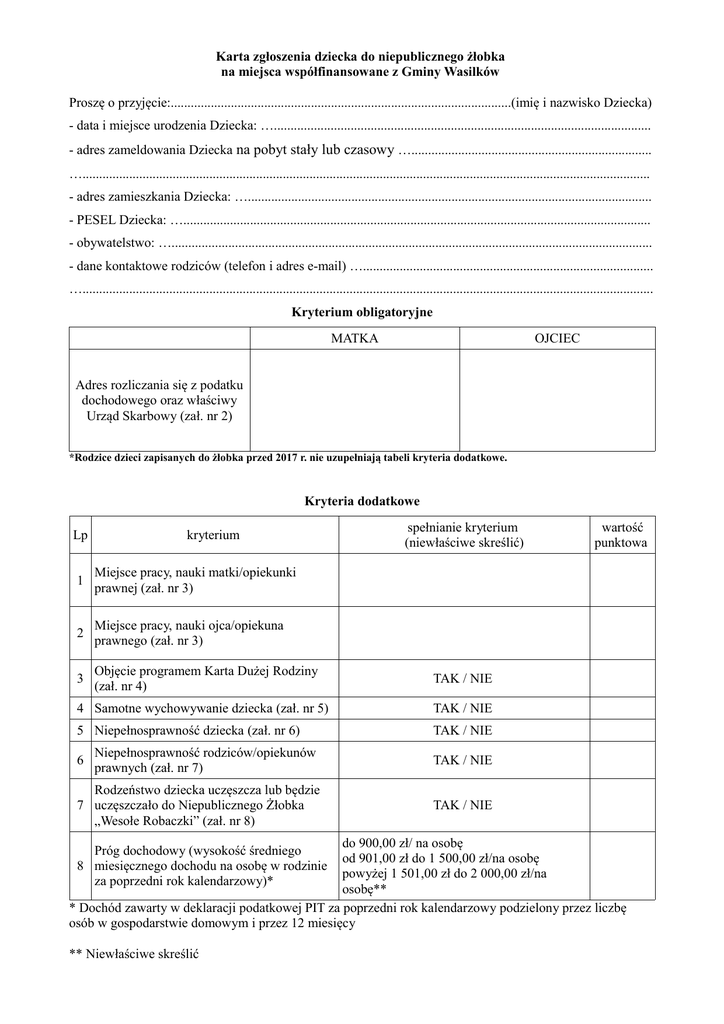 Karta zgłoszenia dziecka do niepublicznego żłobka na miejsca współfinansowane z Gminy Wasilków Proszę o przyjęcie:......................................................................................................(imię i nazwisko Dziecka) - data i miejsce urodzenia Dziecka: …................................................................................................................. - adres zameldowania Dziecka na pobyt stały lub czasowy …........................................................................ ….......................................................................................................................................................................... - adres zamieszkania Dziecka: …......................................................................................................................... - PESEL Dziecka: …............................................................................................................................................ - obywatelstwo: …................................................................................................................................................ - dane kontaktowe rodziców (telefon i adres e-mail) …....................................................................................... …........................................................................................................................................................................... Kryterium obligatoryjne MATKA OJCIEC Adres rozliczania się z podatku dochodowego oraz właściwy Urząd Skarbowy (zał. nr 2) *Rodzice dzieci zapisanych do żłobka przed 2017 r. nie uzupełniają tabeli kryteria dodatkowe. Kryteria dodatkowe Lp kryterium spełnianie kryterium (niewłaściwe skreślić) 1 Miejsce pracy, nauki matki/opiekunki prawnej (zał. nr 3) 2 Miejsce pracy, nauki ojca/opiekuna prawnego (zał. nr 3) 3 Objęcie programem Karta Dużej Rodziny (zał. nr 4) TAK / NIE 4 Samotne wychowywanie dziecka (zał. nr 5) TAK / NIE 5 Niepełnosprawność dziecka (zał. nr 6) TAK / NIE Niepełnosprawność rodziców/opiekunów prawnych (zał. nr 7) TAK / NIE Rodzeństwo dziecka uczęszcza lub będzie 7 uczęszczało do Niepublicznego Żłobka „Wesołe Robaczki” (zał. nr 8) TAK / NIE 6 wartość punktowa do 900,00 zł/ na osobę od 901,00 zł do 1 500,00 zł/na osobę powyżej 1 501,00 zł do 2 000,00 zł/na osobę** * Dochód zawarty w deklaracji podatkowej PIT za poprzedni rok kalendarzowy podzielony przez liczbę osób w gospodarstwie domowym i przez 12 miesięcy Próg dochodowy (wysokość średniego 8 miesięcznego dochodu na osobę w rodzinie za poprzedni rok kalendarzowy)* ** Niewłaściwe skreślić ZAŁĄCZNIKI: 1. Oświadczenie o przetwarzaniu danych osobowych. 2. Zeznanie podatkowe obojga rodziców (dokument wskazujący adres rozliczania się w Gminie Wasilków): a) kopia pierwszej strony zeznania podatkowego opatrzonego prezentatą urzędu skarbowego, w którym zostało złożone zeznanie lub, b) zaświadczenie z urzędu skarbowego potwierdzające fakt złożenia zeznania o wysokości osiągniętego dochodu (poniesionej straty) lub, c) urzędowe poświadczenie odbioru wydane przez elektroniczną skrzynkę podawczą systemu teleinformatycznego administracji podatkowej UPO lub, d) oświadczenia o prowadzeniu działalności rolniczej lub, e) ZAP-3 dokument poświadczający zamiar rozliczania się w II Urzędzie Skarbowym ze wskazaniem adresu z Gminy Wasilków w przypadku osób fizycznych, oświadczenie o zmianie w CEIDG adresu zamieszkania osoby prowadzącej działalność gospodarczą pod rygorem odpowiedzialności karnej. 3. Oświadczenie rodziców o zatrudnieniu/studiowaniu w trybie dziennym. 4. Kopia uprawnienia do korzystanie z samorządowego programu Karta Dużej Rodziny. 5. Kopia dokumentów potwierdzająca samotne wychowanie dziecka (oświadczenie/wyrok sądu/ akt urodzenia, inne dokumenty potwierdzające samotne wychowywanie dziecka). 6. Kopia orzeczenia o niepełnosprawności dziecka. 7. Kopia orzeczenia o niepełnosprawności rodziców/opiekunów prawnych. 8. Oświadczenie rodzica, że rodzeństwo będzie uczęszczało do Niepublicznego Żłobka „Wesołe Robaczki”. Oświadczenie: Świadom/-i odpowiedzialności karnej przewidzianej w art. 223 § 1 i 2 ustawy z dnia 6 czerwca 1997 Kodeks karny (t.j Dz. U. Z 2016 r. poz. 1137 z późn. zm.), oświadczam, iż wszystkie przekazane informacje są zgodne ze stanem faktycznym i prawnym. Wasilków, dnia ........................ 1. …............................................................. (data złożenia karty zgłoszenia) 2. …............................................................. (czytelny podpis rodziców/opiekunów prawnych) Wypełnia komisja Zaświadczam, iż brat/siostra …........................................................... od dnia …............... nr umowy ….......... (imię i nazwisko dziecka) uczęszcza do Niepublicznego Żłobka „Wesołe Robaczki” w Wasilkowie . Lp. Kryteria obligatoryjne Spełnienie kryterium 1 zameldowanie na pobyt stały lub czasowy dziecka TAK / NIE 2 rodzice/opiekunowie prawni dziecka rozliczają się z podatku dochodowego od osób fizycznych w Drugim Urzędzie Skarbowym w Białymstoku TAK / NIE 3 wiek dziecka zgodny z ustawą z dnia 4 lutego 2011 r. o opiece nad dziećmi w wieku do lat 3 (t. j. Dz. U. z 2016 r. poz. 157) TAK / NIE *Jeżeli nie spełnia jednego z kryteriów obligatoryjnych, punkty nie są zliczane w kryteriach dodatkowych. Przyznana ilość punktów (kryteria dodatkowe) : …............... Wypełnia dyrekcja decyzja o przyjęciu lub nie przyjęciu (data / TAK lub NIE) ………………………………………. (Podpis i pieczęć osoby upoważnionej do przyjęcia dziecka do żłobka)