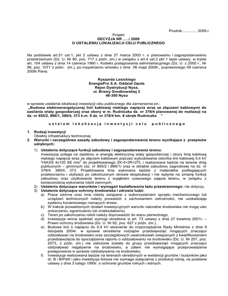 Prudnik.............. 2009 r. Projekt DECYZJA NR …../ 2009 O USTALENIU LOKALIZACJI CELU PUBLICZNEGO Na podstawie art.51 ust.1, pkt 2 ustawy z dnia 27 marca 2003 r. o planowaniu i zagospodarowaniu przestrzennym (Dz. U. Nr 80, poz. 717 z późn. zm.) w związku z art.4 ust.2 pkt 1 tejŜe ustawy, w trybie art. 104 ustawy z dnia 14 czerwca 1960 r. Kodeks postępowania administracyjnego (Dz. U. z 2000 r., Nr 98, poz. 1071 z późn. zm.), po rozpatrzeniu wniosku z dnia 06 maja 2009r., poprawionego 09 czerwca 2009r.Pana: Ryszarda Lesickiego EnergiaPro S.A. Oddział Opole Rejon Dystrybucji Nysa, ul. Bramy Grodkowskiej 2 48-300 Nysa w sprawie ustalenia lokalizacji inwestycji celu publicznego dla zamierzenia pn.: „Budowa elektroenergetycznej linii kablowej niskiego napięcia wraz ze złączami kablowymi do zasilania wiaty gospodarczej oraz obory w m. Rudniczka dz. nr 378/4 planowanej do realizacji na dz. nr 855/2, 866/1, 380/4, 373 k.m. 9 dz. nr 378/4 km. 8 obręb Rudniczka ” u s t a l a m l o k a li z a c j ę i n w e s t y c j i c e l u publicznego 1. Rodzaj inwestycji Obiekty infrastruktury technicznej. 2. Warunki i szczegółowe zasady zabudowy i zagospodarowania terenu wynikające z przepisów odrębnych: 1) Ustalenia dotyczące funkcji zabudowy i zagospodarowania terenu: Inwestycja polega na zasileniu w energię elektryczną wiaty gospodarczej i obory linią kablową niskiego napięcia wraz ze złączem kablowym poprzez wybudowanie odcinka linii kablowej 0,4 kV 2 YAKXS 4x120 SE mm do projektowanego ZK-4+2R+2TL i realizowana będzie na terenie dróg publicznych – gminnych (dz. nr 855/2 i 866/1) oraz w obrębie zabudowy zagrodowej na dz. nr 378/4, 380/4, 373. Projektowana linia wykonana będzie z materiałów podlegających przetworzeniu i utylizacji po zakończonym okresie eksploatacji i nie wpłynie na zmianę funkcji zabudowy oraz uŜytkowania terenu z wyjątkiem czasowego zajęcia terenu, w związku z koniecznością wykonania robót ziemnych; 2) Ustalenia dotyczące warunków i wymagań kształtowania ładu przestrzennego: nie dotyczy, 3) Ustalenia dotyczące ochrony środowiska i zdrowia ludzi: a) Prace ziemne oraz inne roboty związane z wykorzystaniem sprzętu mechanicznego lub urządzeń technicznych naleŜy prowadzić z zachowaniem ostroŜności, nie uszkadzając systemu korzeniowego rosnących drzew, b) W trakcie prowadzonych działań inwestycyjnych warunki naturalne środowiska nie mogą ulec zniszczeniu, ograniczeniu lub zniekształceniu, c) Teren po zakończeniu robót naleŜy doprowadzić do stanu pierwotnego, d) Inwestycja winna spełniać wymogi określone w art. 73 ustawy z dnia 27 kwietnia 2001r. – Prawo ochrony środowiska (Dz. U. Nr 62, poz. 627 z późn. zm.), e) Budowa linii o napięciu do 0,4 kV stosownie do rozporządzenia Rady Ministrów z dnia 9 listopada 2004r. w sprawie określenia rodzajów przedsięwzięć mogących znacząco oddziaływać na środowisko oraz szczegółowych uwarunkowań związanych z kwalifikowaniem przedsięwzięcia do sporządzenia raportu o oddziaływaniu na środowisko (Dz. U. Nr 257, poz. 2573, z późn. zm.) nie zaliczone zostały do grupy przedsięwzięć mogących znacząco oddziaływać negatywnie na środowisko, a zatem nie wymagające przeprowadzenia postępowania w sprawie oddziaływania na środowisko, f) Inwestycja realizowana będzie na terenach określonych w ewidencji gruntów i budynków jako dr, B i B/PsIII i jako inwestycja liniowa nie wymaga wyłączenia z produkcji rolnej, na postawie ustawy z dnia 3 lutego 1995r. o ochronie gruntów rolnych i leśnych. 4) Ustalenia dotyczące ochrony dziedzictwa kulturalnego i zabytków oraz dóbr kultury współczesnej: a) Nieruchomość, na której realizowana będzie inwestycja nie jest połoŜona na obszarze objętym obszarową ochroną konserwatorską, b) W przypadku ujawnienia podczas robót ziemnych przedmiotu, co do którego istnieje przypuszczenie, iŜ jest zabytkiem - wykonawca zobowiązany jest wstrzymać wszelkie roboty mogące go uszkodzić, zabezpieczyć odkryty przedmiot przy uŜyciu dostępnych środków oraz miejsce jego odkrycia, jak równieŜ niezwłocznie powiadomić Opolskiego Wojewódzkiego Konserwatora Zabytków lub Burmistrza Prudnika. 5) Ustalenia dotyczące obsługi w zakresie komunikacji i infrastruktury technicznej: a) Projekt linii wykonany zgodnie z obowiązującą PN, b) Warunki przyłączenia oraz korzystania z sieci energetycznej zgodnie z zasadami określonymi w ustawie z dnia 10 kwietnia 1997r. Prawo energetyczne ( Dz. U. z 2003r. Nr 153, poz. 1505 z późn. zm.), c) Umieszczanie w pasie drogowym urządzeń infrastruktury technicznej nie związanych z drogą nie moŜe naruszać elementów drogi oraz przyczyniać się do czasowego lub trwałego zagroŜenia ruchu, d) Wykonywanie robót w obrębie pasa drogowego drogi oraz umieszczanie w nich urządzeń i obiektów nie związanych z gospodarką drogową i potrzebami ruchu wymaga uzyskania zezwolenia właściwego zarządcy drogi na zajęcie pasa drogowego i umieszczenie w nim urządzeń obcych, e) W przypadku kolizji projektowanej inwestycji z istniejącymi sieciami i urządzeniami infrastruktury technicznej naleŜy je przełoŜyć lub zabezpieczyć zgodnie z obowiązującymi przepisami techniczno-budowlanymi i normami, f) Usytuowanie projektowanej inwestycji naleŜy uzgodnić w Zakładzie Uzgadniania Dokumentacji Projektowej prowadzonym przez Starostę Prudnickiego w trybie określonym w Rozporządzeniu Ministra Rozwoju Regionalnego i Budownictwa z dnia 2 kwietnia 2001r. w sprawie geodezyjnej ewidencji sieci uzbrojenia terenu oraz zespołów uzgadniania dokumentacji projektowej (Dz. U. Nr 38, poz. 455), 6) Ustalenia wymagań dotyczących ochrony interesów osób trzecich; a) Realizacja inwestycji nie moŜe spowodować uciąŜliwości na terenach sąsiednich zarówno na etapie wykonywania robót budowlanych jak i eksploatacji inwestycji, dotyczy to w szczególności uciąŜliwości powodowanych prz