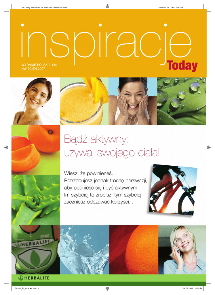 Title: Today Newsletter ID: 2217-5921-TM133-GN-Insert Proof No: 01 Date: 20/03/06 inspiracje Today WYDANIE POLSKIE 144 KWIECIEŃ 2007 Bądź aktywny: używaj swojego ciała! Wiesz, że powinieneś. Potrzebujesz jednak trochę perswazji, aby podnieść się i być aktywnym. Im szybciej to zrobisz, tym szybciej zaczniesz odczuwać korzyści... TM144_PL_wkladka.indd 1 26.03.2007 14:25:34 Bez wymówek! Często usprawiedliwiamy się, gdy zdajemy sobie sprawę, że nie jesteśmy wystarczająco aktywni: to zbyt duży wysiłek, to nie jest zabawne, zabiera zbyt wiele czasu... Ale w rzeczywistości ruch jest dla nas bardzo korzystny i może sprawić, że poczujemy się fantastycznie. Więc nie usprawiedliwiaj się wymówkami, dużo lepiej jest po prostu pogodzić się z tym i ZROBIĆ TO! ! AktywnoÊç przyniesie Ci WIELE korzyÊci... Zacznijmy od motywacji. • Chcesz mieç wi´cej energii? • Chcesz mieç wi´cej pewnoÊci siebie? • ChciałbyÊ byç szczuplejszy? • Chcesz poprawiç kondycj´? • Chcesz mieç zdrowsze serce? • ChciałbyÊ wyglàdaç młodziej? • Chcesz zredukowaç poziom stresu? • Chcesz mieç lepsze samopoczucie? TAK-TAK-TAK: oczywiÊcie, ˝e chcesz! KorzyÊci z çwiczeƒ sà niezaprzeczalne. Je˝eli masz wi´cej energii, mo˝esz wi´cej zrobiç i wygospodarowaç czas na rzeczy, które kochasz – dla rodziny, na hobby (oraz Twojà nowo odkrytà mi∏oÊç do aktywnoÊci!). Wi´cej pewnoÊci siebie oznacza, ˝e naprawd´ mo˝esz cieszyç si´ ˝yciem, a lepsze samopoczucie, to jego lepsza jakoÊç. Jednà z najwi´kszych korzyÊci jest zdolnoÊç do znacznej redukcji stresu. PoÊwi´caj 30-60 minut dziennie na aktywnoÊç fizycznà. Twoje cia∏o uwolni wtedy du˝à dawk´ endorfin (hormon szcz´Êcia) i poczujesz si´ Êwietnie – to tani, prosty, redukujàcy stres i wzmacniajàcy zdrowie sposób! Poprawa i utrzymanie lepszej kondycji fizycznej wp∏ynie na CA¸E Twoje ˝ycie. TM144_PL_wkladka.indd 2 Jeszcze wi´cej korzyÊci! Na drodze do dobrej kondycji musisz prawid∏owo zaopatrywaç swój organizm w: Bądź aktywny, żyj zdrowo! Jak 30 minut dziennie mo˝e wyd∏u˝yç Twoje ˝ycie o wiele lat? Redukcja stresu • W´glowodany – Twoje g∏ówne êród∏o energii åwiczenia powodujà wytwarza- • Bia∏ka – istotne dla wzrostu i regeneracji mi´Êni uczucie odpr´˝enia i dobrego • Niezb´dne kwasy t∏uszczowe (EFA) – wspierajà elastycznoÊç stawów i zdrowie serca cer lub szybkie çwiczenia, mogà • Antyoksydanty – wspierajà uk∏ad odpornoÊciowy i regeneracj´ po çwiczeniach • Wod´ – zapobiega odwodnieniu Lista ta jest uproszczona – Twój Osobisty Doradca Wellness Herbalife® mo˝e dobraç Ci indywidualny program, który zoptymalizuje iloÊç sk∏adników od˝ywczych i dope∏ni Twój styl ˝ycia. Kiedy zaczniesz myÊleç o dostarczaniu cia∏u „paliwa” i rozpoczniesz prac´ nad osiàgni´ciem zrównowa˝onego od˝ywiania, naprawd´ poczujesz ró˝nic´. Jemy, Êpimy i pracujemy rutynowo, wi´c dodaj do swojego planu zaj´ç jeszcze jeden zwyczaj – regularne çwiczenia. Wybierz aktywnoÊç, która sprawi Ci radoÊç. Je˝eli zdecydujesz si´ na coÊ nudnego, rzucisz to zanim poprawisz kondycj´! Je˝eli marzysz o sprawnym, zdrowym, szczup∏ym ciele i korzyÊciach, które si´ z tym ∏àczà, w∏àcz do swojego planu dnia oko∏o 30 minut aktywnoÊci fizycznej, codziennie. Cudownie! nie endorfin, które przynoszà samopoczucia. Energiczny spabyç w∏aÊnie tym, co Ci´ uspokoi Opracowa∏ Luigi Gratton, Vice President ds. Edukacji, Rada Naukowa Herbalife ds. Od˝ywiania. po stresujàcym dniu! Kontroluj swojà wag´ Zwi´kszenie aktywnoÊci fizycznej Nie ma lepszego momentu na oraz spalania kalorii sà kluczami do w∏àczenie aktywnoÊci fizycznej kontroli wagi. Dodatkowo, zrówno- do swojego ˝ycia i pozostanie wa˝ona dieta, bogata w zielone aktywnym. Bez wzgl´du na wiek warzywa, wapƒ i bia∏ko nie tylko czy kondycj´, prawie ka˝dy mo˝e pomaga w utrzymaniu wagi, ale czerpaç korzyÊci z wprowadzenia równie˝ wspiera utrzymanie zdro- çwiczeƒ do codziennego planu wych koÊci. zaj´ç. KorzyÊci sà nieograniczone. Oto trzy, które Ci´ zmotywujà. OczywiÊcie aktywny styl ˝ycia i konsekwentne przygotowywanie Silne koÊci i mi´Ênie. zdrowych posi∏ków mo˝e byç Badania kliniczne udowodni∏y, prawdziwym ˝e regularna aktywnoÊç fizyczna szcz´Êcie, ludziom zabieganym jest jednym z najlepszych spo- Herbalife oferuje wygodne i pysz- sobów, aby zachowaç zdrowe ne rozwiàzania – od Kontroli Wagi, koÊci. åwiczenia obcià˝eniowe poprzez Od˝ywianie Ukierunko- lub si∏owe takie jak chodzenie, wane do produktów energetyzu- jogging czy u˝ywanie ci´˝arków jàcych i fitness. Gama produktów pomagajà w zapobieganiu utraty Od˝ywiania Zewn´trznego pomo- masy koÊci. Budowanie masy ˝e chroniç i od˝ywiç Twojà skór´ mi´Êniowej nie tylko wspiera przez ca∏y rok. wyzwaniem. Na zdrowie koÊci, ale tak˝e spala kalorie w ciàgu dnia, pomagajàc Ci utrzymaç zdrowà wag´. Wellness jest celem, który mo˝esz osiàgnàç z Herbalife pozostajàc aktywnym przez ca∏e ˝ycie! 26.03.2007 14:25:38 #0242 #3152 #3151 #3152 #0260 #0259 Sponsorowany przez Herbalife triatlonista Olly Freeman z Wielkiej Brytanii ma szanse na zdobycie medalu na Olimpiadzie w Londynie w 2012 roku. Dieta odgrywa kluczowà rol´ w osiàganiu dobrych rezultatów. Olly udziela ludziom aktywnym wskazówek dotyczàcych od˝ywiania: Zdrowa dieta jest ró˝norodna Postaraj si´, ˝eby Twoja dieta by∏a jak najbardziej kolorowa. Niektóre produkty sà wyjàtkowo od˝ywcze, na przyk∏ad pomaraƒczowe i zielone warzywa, jagody, orzechy, nasiona, warzywa stràczkowe, pe∏ne ziarna, soja i niskot∏uszczowe produkty mleczne. Zdrowe przekàski pomi´dzy posi∏kami Intensywny program çwiczeƒ oznacza, ˝e przekàski odgrywajà wa˝nà rol´ w utrzymaniu sta∏ego poziomu energii i dostarczaniu odpowiednich sk∏adników od˝ywczych. Przyk∏ad
