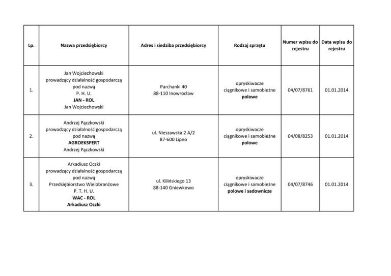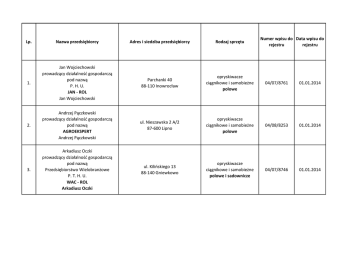 Numer wpisu do Data wpisu do rejestru rejestru Lp. Nazwa przedsiębiorcy Adres i siedziba przedsiębiorcy Rodzaj sprzętu 1. Jan Wojciechowski prowadzący działalność gospodarczą pod nazwą P. H. U. JAN - ROL Jan Wojciechowski Parchanki 40 88-110 Inowrocław opryskiwacze ciągnikowe i samobieżne polowe 04/07/8761 01.01.2014 2. Andrzej Pączkowski prowadzący działalność gospodarczą pod nazwą AGROEKSPERT Andrzej Pączkowski ul. Nieszawska 2 A/2 87-600 Lipno opryskiwacze ciągnikowe i samobieżne polowe 04/08/8253 01.01.2014 3. Arkadiusz Oczki prowadzący działalność gospodarczą pod nazwą Przedsiębiorstwo Wielobranżowe P. T. H. U. WAC - ROL Arkadiusz Oczki ul. Kilińskiego 13 88-140 Gniewkowo opryskiwacze ciągnikowe i samobieżne polowe i sadownicze 04/07/8746 01.01.2014 4. Brygida Prus prowadząca działalność gospodarczą pod nazwą Zakład Usługowo - Handlowo - Produkcyjny Brygida Prus Żurawia 24 89-240 Kcynia opryskiwacze ciągnikowe i samobieżne polowe i sadownicze 04/10/8757 01.01.2014 5. Bolesław Prus prowadzący działalność gospodarczą pod nazwą Zakład Usługowo - Handlowy Bolesław Prus Żurawia 24 89-240 Kcynia opryskiwacze ciągnikowe i samobieżne polowe i sadownicze 04/10/8769 01.01.2014 6. Jan Kaczmarek prowadzący działalność gospodarczą Gawroniec 78/8 gm. Bukowiec opryskiwacze ciągnikowe i samobieżne polowe i sadownicze 04/14/8764 01.01.2014 7. Tomasz Kaczmarek prowadzący działalność gospodarczą pod nazwą Stacja Kontroli Opryskiwaczy Tomasz Kaczmarek Gawroniec 59/2 86-122 Bukowiec opryskiwacze ciągnikowe i samobieżne polowe i sadownicze 04/14/8763 01.01.2014 8. Przedsiębiorstwo Handlu Sprzętem Rolniczym "AGROMA" Spółka z o. o. ul. Bojowników o Wolność i Demokrację 15 Sępólno Krajeńskie opryskiwacze ciągnikowe i samobieżne polowe 04/13/5468 01.01.2014 9. Daniel Ruciński prowadzący działalność gospodarczą pod nazwą Przedsiębiorstwo Handlowo - Usługowe GLOG Łania 3/8 87-851 Boniewo opryskiwacze ciągnikowe i samobieżne polowe i sadownicze 04/18/8738 01.01.2014 10. Donata Torba prowadząca działalność gospodarczą ul. Sikorskiego 11 88-140 Gniewkowo opryskiwacze ciągnikowe i samobieżne polowe i sadownicze 04/07/8744 01.01.2014 11. Bartosz Koczorowski prowadzący działalność gospodarczą pod nazwą Stacja Kontroli Opryskiwaczy "EKO - KONTROL" Bartosz Koczorowski ul. Niepodległości 62 A/14 88-100 Inowrocław opryskiwacze ciągnikowe i samobieżne polowe 04/07/8739 01.01.2014 12. Kazimierz Gzella prowadzący działalność gospodarczą pod nazwą Stacja Kontroli Opryskiwaczy Gzella Kazimierz ul. Nałkowskiej 2 86-100 Świecie opryskiwacze ciągnikowe i samobieżne polowe i sadownicze 04/14/8765 01.01.2014 13. Jakub Karczewski prowadzący działalność gospodarczą pod nazwą P. U. H. AGROMIX - BIS Karczewski Jakub ul. Polna 24/1 89-115 Mrocza opryskiwacze ciągnikowe i samobieżne polowe 04/10/8749 01.01.2014 14. Kujawska Fabryka Maszyn Rolniczych Spółka z o. o. ul. Kolejowa 54 87-880 Brześć Kujawski opryskiwacze ciągnikowe i samobieżne polowe i sadownicze 04/18/8760 01.01.2014 15. Andrzej Kukliński prowadzący działalność gospodarczą pod nazwą Ślusarstwo Stacja Kontroli Opryskiwaczy Andrzej Kukliński Bielawy 34 88-430 Janowiec Wielkopolski opryskiwacze ciągnikowe i samobieżne polowe 04/19/8745 01.01.2014 16. Jacek Ładziak prowadzący działalność gospodarczą pod nazwą "EKOPRYSK" Jacek Ładziak opryskiwacze ciągnikowe i samobieżne polowe 04/09/8758 01.01.2014 17. Spółdzielnia Kółek Rolniczych ul. Piekarska 6 87-704 Bądkowo opryskiwacze ciągnikowe i samobieżne polowe i sadownicze 04/01/8771 01.01.2014 18. Danuta Jóźwicka prowadząca działalność gospodarczą w ramach spółki cywilnej pod nazwą Techniczna Obsługa Samochodów TOS - SERWIS s. c. Pędzewo 44 A gm. Zławieś Wielka opryskiwacze ciągnikowe i samobieżne polowe 04/15/8778 01.01.2014 ul. Kasprowicza 22 300 Mogilno 88- 19. Adriana Jóźwicka prowadząca działalność gospodarczą w ramach spółki cywilnej pod nazwą Techniczna Obsługa Samochodów TOS - SERWIS s. c. Pędzewo 44 A gm. Zławieś Wielka opryskiwacze ciągnikowe i samobieżne polowe 04/15/8774 01.01.2014 20. Spółdzielnia Mleczarska "EKOMLECZ" Świedziebnia 118 A 87-335 Świedziebnia opryskiwacze ciągnikowe i samobieżne polowe 04/02/8115 01.01.2014 21. Karol Spychalski prowadzący działalność gospodarczą pod nazwą P. P. U. H. "ELKAR" Ośrodek Szkolenia Kierowców Karol Spychalski ul. Przemysłowa 1 88-200 Radziejów opryskiwacze ciągnikowe i samobieżne polowe 04/11/8000 01.01.2014 22. Sławomir Karwowski prowadzący działalność gospodarczą pod nazwą Firma Usługowa AGROEKSPERT Sławomir Karwowski ul. Heweliusza 3/67 86-300 Grudziądz opryskiwacze ciągnikowe i samobieżne polowe 04/62/8103 01.01.2014 23. Raiffeisen Agro - Technika Spółka z o. o. ul. Bydgoska 41 86-061 Brzoza opryskiwacze ciągnikowe i samobieżne polowe 04/03/8767 01.01.2014 24. Ryszard Leszek prowadzący działalność gospodarczą pod nazwą Przedsiębiorstwo Wielobranżowe Handel - Usługi Ryszard Leszek Małe Pułkowo 67 87-207 Dębowa Łąka opryskiwacze ciągnikowe i samobieżne polowe 04/17/8756 01.01.2014 25. Bartłomiej Chrzanowski prowadzący działalność gospodarczą w ramach spółki cywilnej pod nazwą Zakład Usługowo - Produkcyjny ul. Gen. Józefa Hallera 35 86-230 Lisewo opryskiwacze ciągnikowe i samobieżne polowe i sadownicze 04/04/8750 01.01.2014 26. Marcin Chrzanowski prowadzący działalność gospodarczą w ramach spółki cywilnej pod nazwą Zakład Usługowo - Produkcyjny ul. Gen. Józefa Hallera 35 86-230 Lisewo opryskiwacze ciągnikowe i samobieżne polowe i sadownicze 04/04/8751 01.01.2014 27. Agnieszka Wojciechowska prowadząca działalność gospodarczą pod nazwą Stacja Kontroli Opryskiwaczy EKO - ROL Agnieszka Wojciechowska ul. Przyjazna 3 87-103 Mała Nieszawka opryskiwacze ciągnikowe i samobieżne polowe i sadownicze 04/15