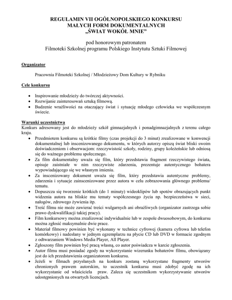 REGULAMIN VII OGÓLNOPOLSKIEGO KONKURSU MAŁYCH FORM DOKUMENTALNYCH „ŚWIAT WOKÓŁ MNIE” pod honorowym patronatem Filmoteki Szkolnej programu Polskiego Instytutu Sztuki Filmowej Organizator Pracownia Filmoteki Szkolnej / Młodzieżowy Dom Kultury w Rybniku Cele konkursu Inspirowanie młodzieży do twórczej aktywności. Rozwijanie zainteresowań sztuką filmową. Budzenie wrażliwości na otaczający świat i sytuację młodego człowieka we współczesnym świecie. Warunki uczestnictwa Konkurs adresowany jest do młodzieży szkół gimnazjalnych i ponadgimnazjalnych z terenu całego kraju. Przedmiotem konkursu są krótkie filmy (czas projekcji do 3 minut) zrealizowane w konwencji dokumentalnej lub inscenizowanego dokumentu, w których autorzy opiszą świat bliski swoim doświadczeniom i obserwacjom: rzeczywistość szkoły, rodziny, grupy koleżeńskie lub odniosą się do ważnego problemu społecznego. Za film dokumentalny uważa się film, który przedstawia fragment rzeczywistego świata, opisuje zaistniałe w nim rzeczywiste zdarzenia, prezentuje autentycznego bohatera wypowiadającego się we własnym imieniu. Za inscenizowany dokument uważa się film, który przedstawia autentyczne problemy, zdarzenia i sytuacje zainscenizowane przez autora w celu zobrazowania głównego problemu/ tematu. Dopuszcza się tworzenie krótkich (do 1 minuty) wideoklipów lub spotów obrazujących punkt widzenia autora na bliskie mu tematy współczesnego życia np. bezpieczeństwa w sieci, nałogów, zdrowego żywienia itp. Treść filmu nie może zawierać treści wulgarnych ani obraźliwych (organizator zastrzega sobie prawo dyskwalifikacji takiej pracy). Film konkursowy można zrealizować indywidualnie lub w zespole dwuosobowym, do konkursu można zgłosić maksymalnie dwie prace. Materiał filmowy powinien być wykonany w technice cyfrowej (kamera cyfrowa lub telefon komórkowy) i nadesłany w jednym egzemplarzu na płycie CD lub DVD w formacie zgodnym z odtwarzaniem Windows Media Player, All Player. Zgłoszony film powinien być pracą własną, co autor poświadcza w karcie zgłoszenia. Autor filmu musi posiadać zgody na wykorzystanie wizerunku bohaterów filmu, obowiązany jest do ich przedstawienia organizatorom konkursu. Jeżeli w filmach przysłanych na konkurs zostaną wykorzystane fragmenty utworów chronionych prawem autorskim, to uczestnik konkursu musi zdobyć zgodę na ich wykorzystanie od właściciela praw. Zaleca się uczestnikom wykorzystywanie utworów udostępnionych na otwartych licencjach. Przysłanie filmu na konkurs jest jednoznaczne ze zgodą na jego projekcję w finale i zamieszczeniem na stronie internetowej organizatora. Zasady zgłaszania prac konkursowych Prace można składać osobiście lub przesłać pocztą na adres organizatora do 31 marca: Młodzieżowy Dom Kultury ul. Władysława Broniewskiego 23 44-217 Rybnik z dopiskiem „Konkurs filmowy” Prace przesyłane pocztą powinny być odpowiednio zabezpieczone, aby nie uległy zniszczeniu. Do pracy konkursowej należy dołączyć pełne dane osobowe: imię i nazwisko, wiek, adres e-mail, telefon autora, nazwę i adres szkoły lub placówki z pieczątką szkoły i danymi kontaktowymi opiekuna oraz nazwę programu odtwarzającego płytę. Kryteria oceny prac konkursowych Prace konkursowe oceniać będzie powołane przez organizatora profesjonalne jury w dwóch kategoriach wiekowych: filmy gimnazjalistów i filmy uczniów szkół ponadgimnazjalnych. Ocenie podlegać będzie zgodność z konwencją dokumentalną, ciekawe ujęcie tematu konkursu oraz walory estetyczne i warsztatowe filmów. Decyzja jury jest niepodważalna i ostateczna. Laureaci konkursu otrzymają wartościowe nagrody rzeczowe (tablet, aparat cyfrowy, dysk zewnętrzny, pamięci przenośne, płyty dvd, książki) a wszyscy autorzy filmów dyplomy za udział w konkursie. Organizatorzy nie zwracają nadesłanych prac. Organizatorzy mają prawo do publicznego prezentowania nagrodzonych prac. Terminarz konkursu Ogłoszenie konkursu nastąpi na początku stycznia 2016 roku. Ostateczny termin nadsyłania prac konkursowych upływa 31 marca 2016 roku (decyduje data dostarczenia pracy do organizatora). Ogłoszenie wyników konkursu nastąpi w kwietniu 2016 r. a laureaci zostaną zaproszeni na uroczysty Finał. O wynikach konkursu i rozdaniu nagród laureaci zostaną powiadomieni telefonicznie lub odrębnym pismem. Finał konkursu odbędzie się w Pracowni Filmoteki Szkolnej, połączony zostanie z prezentacją nagrodzonych prac i spotkaniem ze znanym twórcą filmowym. Protokół posiedzenia jury zostanie zamieszczony na stronie internetowej MDK www.mdk.rybnik.pl W przypadku otrzymania niewystarczającej ilości prac organizator zastrzega sobie możliwość wydłużenia terminu zgłaszania prac i przeniesienia finału konkursu na późniejszy termin. Kontakt z organizatorem Ewa Klonowska e-mail: [email protected] lub Młodzieżowy Dom Kultury e-mail: [email protected] tel. 32 42 240 88 VII OGÓLNOPOLSKI KONKURS MAŁYCH FORM DOKUMENTALYCH „ŚWIAT WOKÓŁ MNIE” Formularz zgłoszeniowy .................................. pieczątka placówki Imię i nazwisko .…..………….………….…………………………………………………… Adres ………………………………………………………………………………………….. Data urodzenia ..……………………………………………………………………………… Telefon, e-mail .....…………………….……………………………………………………… Szkoła, placówka ………………………..………………...………………………….......... Opiekun (imię, nazwisko) …………………………………………………………………… Kontakt do opiekuna (telefon, e-mail) ………………………………..………………….……...…………………………………… Tytuł pracy ………
