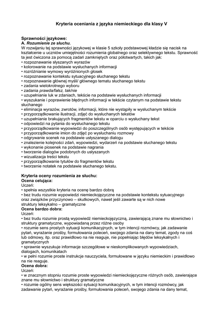 Kryteria oceniania z języka niemieckiego dla klasy V