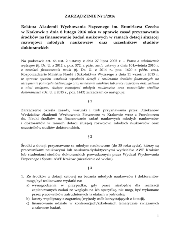 ZARZĄDZENIE Nr 3/2016 Rektora Akademii Wychowania Fizycznego im. Bronisława Czecha w Krakowie z dnia 8 lutego 2016 roku w sprawie zasad przyznawania środków na finansowanie badań naukowych w ramach dotacji służącej rozwojowi młodych naukowców oraz uczestników studiów doktoranckich Na podstawie art. 66 ust. 2 ustawy z dnia 27 lipca 2005 r. – Prawo o szkolnictwie wyższym (tj. Dz. U. z 2012 r. poz. 572, z późn. zm.), ustawy z dnia 10 kwietnia 2010 r. o zasadach finansowania nauki (tj. Dz. U. z 2014 r., poz. 1620 z późn. zm.), Rozporządzenie Ministra Nauki i Szkolnictwa Wyższego z dnia 11 września 2015 r. w sprawie sposobu ustalania wysokości dotacji i rozliczania środków finansowych na utrzymanie potencjału badawczego oraz na badania naukowe lub prace rozwojowe oraz zadania z nimi związane, służące rozwojowi młodych naukowców oraz uczestników studiów doktoranckich (Dz. U. z 2015 r., poz. 1443) zarządzam co następuje: §1 Zarządzenie określa zasady, warunki i tryb przyznawania przez Dziekanów Wydziałów Akademii Wychowania Fizycznego w Krakowie wraz z Prorektorem ds. Nauki środków na finansowanie badań naukowych młodych naukowców i doktorantów w ramach dotacji służącej rozwojowi młodych naukowców oraz uczestników studiów doktoranckich. §2 Środki z dotacji przyznawane są młodym naukowcom (do 35 roku życia), którzy są pracownikami naukowymi lub naukowo-dydaktycznymi wydziałów AWF Kraków lub studentami studiów doktoranckich prowadzonych przez Wydział Wychowania Fizycznego i Sportu AWF Kraków (niezależnie od wieku). §3 1. Ze środków z dotacji celowej na badania młodych naukowców i doktorantów mogą być realizowane wydatki na: a) wynagrodzenia w przypadku, gdy prace niezbędne dla realizacji zaplanowanych zadań ze względu na ich specyfikę, nie mogą być wykonane przez pracowników zatrudnionych na etatach w jednostce, b) koszty współpracy z zagranicą (wyjazdy osób korzystających z dotacji), c) finansowanie udziału w konferencjach/szkoleniach tematycznie związanych z zakresem badań, 1 d) dofinansowanie druku publikacji naukowych, e) finansowanie usług niezbędnych dla wykonania zadań badawczych (w tym wydawniczych), f) finansowanie usług kserograficznych zleconych poza AWF Kraków (w przypadku uzasadnionego braku możliwości wykonania ich na Uczelni), g) zakup książek, h) zakup aparatury naukowo-badawczej, związanej z realizacją zadań badawczych, nie stanowiącej dużej infrastruktury badawczej, i) zakupy niezbędne dla wykonania zadań badawczych. §4 1. Zgodnie z ustawą z dnia 10 kwietnia 2010 roku o zasadach finansowania nauki, środki przekazane wydziałom AWF Kraków w drodze decyzji Ministra właściwego ds. nauki w formie dotacji celowej na prowadzenie badań naukowych lub prac rozwojowych oraz zadań z nimi związanych służących rozwojowi naukowemu młodych naukowców oraz uczestników studiów doktoranckich, są przyznawane w wewnętrznym trybie konkursowym, który nadzorują dziekani wydziałów AWF Kraków wraz z Prorektorem ds. Nauki. 2. Ogłoszenie o konkursie wraz z obowiązującymi w danym roku terminami, publikowane jest na stornie internetowej Działu Nauki. §5 1. Środki z dotacji przyznawane są na pisemny wniosek złożony przez pracownika/doktoranta w terminie określonym w ogłoszeniu o naborze wniosków. 2. Wzór wniosku o przyznanie dofinansowania stanowi Załącznik nr 2 do Zarządzenia. 3. Wzór wniosku dostępny jest na stronie Działu Nauki. 4. Wniosek o przyznanie środków z dotacji może być złożony indywidualnie przez jedną osobę lub przez grupę pracowników lub/i doktorantów realizujących wspólny projekt badawczy. §6 1. Do oceny wniosków o przyznanie środków na badania naukowe, o których mowa w § 5 ust. 1., dziekani wraz z Prorektorem ds. Nauki powołują recenzenta wniosków o finansowanie prac naukowych młodych naukowców. 2 2. Merytoryczna ocena wniosku dokonywana jest na podstawie „Kwestionariusza recenzji projektu badawczego”, który stanowi Załącznik nr 1 do Zarządzenia. 3. Za podstawowe kryterium oceny i kwalifikacji do finansowania wniosku przyjęto odpowiednio do charakteru tematu: a) wartość merytoryczną, b) zasadność wykonania, c) możliwość i realność wykorzystania wyników w praktyce, d) uzasadnienie nakładów finansowych. §7 Ocena złożonych wniosków dokonana jest w terminie 14 dni roboczych od dnia otrzymania decyzji Ministra właściwego ds. Nauki w sprawie dotacji celowej na prowadzenie badań naukowych lub prac rozwojowych oraz zadań z nimi związanych służących rozwojowi naukowemu młodych naukowców oraz uczestników studiów doktoranckich. §8 1. Po zakończeniu oceny merytorycznej przez recenzentów „Wniosków o finansowanie projektu badawczego realizowanego w ramach badań naukowych lub prac rozwojowych oraz prac z nimi związanych, służących rozwojowi młodych naukowców oraz uczestników studiów doktoranckich”, Dziekani i Prorektor ds. Nauki w porozumieniu z Senacką Komisją ds. Badań Naukowych decydują o wysokości dofinansowania do projektów zakwalifikowanych do realizacji. 2. Liczba projektów przyjętych do finansowania uzależniona będzie kwotą dotacji celowej przyznanej ze środków MNiSW. 3. W przypadku większej liczby projektów, które uzyskały taką samą liczbę punktów, w pierwszej kolejności finansowane będą prace badawcze w zależności od stopnia zaawansowania rozprawy doktorskiej/habilitacyjnej. 4. Dziekani wraz z Prorektorem ds. Nauki mają prawo przyznać finansowanie projektu zakwalifikowanego do realizacji, w kwocie innej (wyższej lub niższej) w stosunku do wnioskowanej w zależności od posiadanych środków oraz wartości merytorycznej projektu. §9 Uruchomienie środków następuje niezwłocznie decyzji o przyznaniu finansowania. po przekazaniu wnioskodawcom 3 § 10 1. Osoba której przyznano środki z dotacji zobowiązana jest w okresie do 31 stycznia roku n