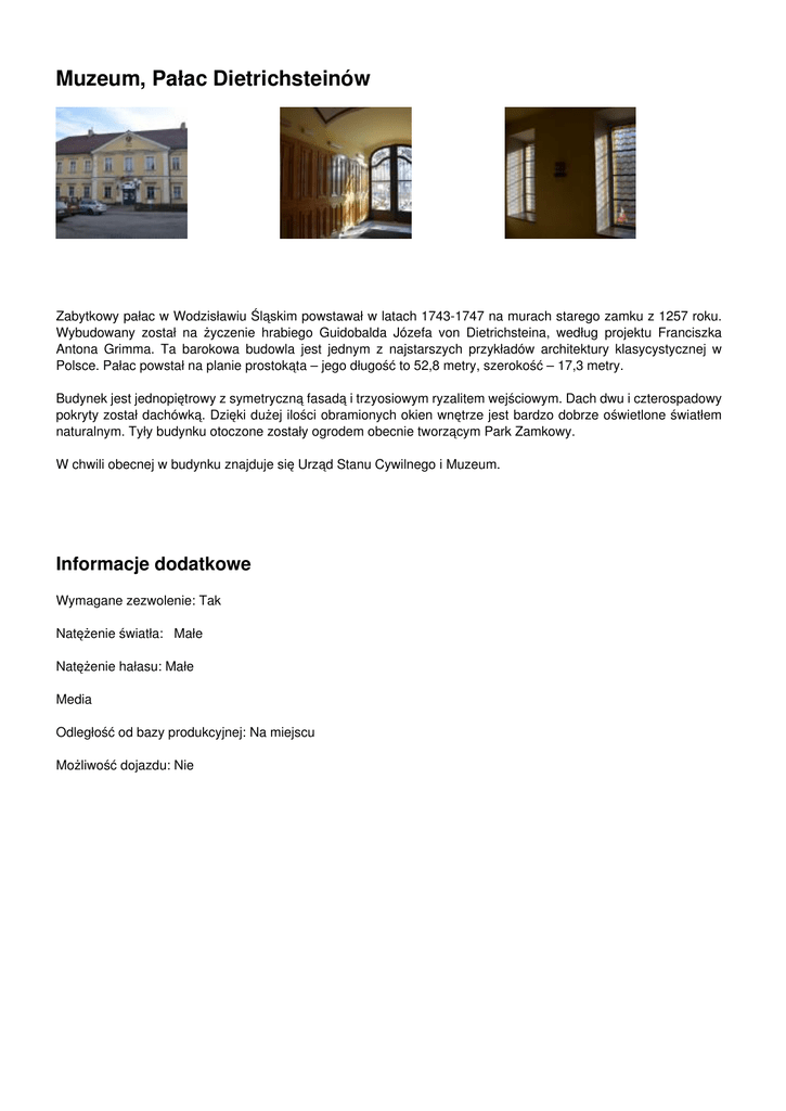 Muzeum, Pałac Dietrichsteinów Zabytkowy pałac w Wodzisławiu Śląskim powstawał w latach 1743-1747 na murach starego zamku z 1257 roku. Wybudowany został na życzenie hrabiego Guidobalda Józefa von Dietrichsteina, według projektu Franciszka Antona Grimma. Ta barokowa budowla jest jednym z najstarszych przykładów architektury klasycystycznej w Polsce. Pałac powstał na planie prostokąta – jego długość to 52,8 metry, szerokość – 17,3 metry. Budynek jest jednopiętrowy z symetryczną fasadą i trzyosiowym ryzalitem wejściowym. Dach dwu i czterospadowy pokryty został dachówką. Dzięki dużej ilości obramionych okien wnętrze jest bardzo dobrze oświetlone światłem naturalnym. Tyły budynku otoczone zostały ogrodem obecnie tworzącym Park Zamkowy. W chwili obecnej w budynku znajduje się Urząd Stanu Cywilnego i Muzeum. Informacje dodatkowe Wymagane zezwolenie: Tak Natężenie światła: Małe Natężenie hałasu: Małe Media Odległość od bazy produkcyjnej: Na miejscu Możliwość dojazdu: Nie Powered by TCPDF (www.tcpdf.org)