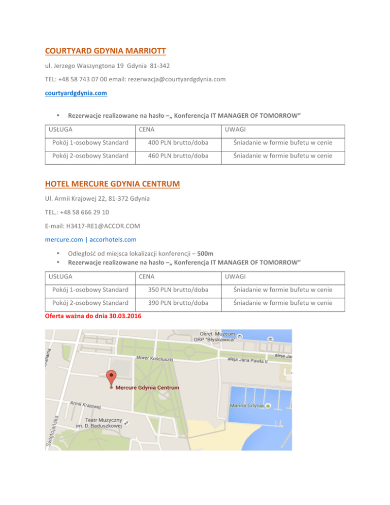 COURTYARD GDYNIA MARRIOTT ul. Jerzego Waszyngtona 19 Gdynia 81-‐342 TEL: +48 58 743 07 00 email: [email protected] courtyardgdynia.com • Rezerwacje realizowane na hasło –„ Konferencja IT MANAGER OF TOMORROW” USŁUGA CENA UWAGI Pokój 1-‐osobowy Standard 400 PLN brutto/doba Śniadanie w formie bufetu w cenie Pokój 2-‐osobowy Standard 460 PLN brutto/doba Śniadanie w formie bufetu w cenie HOTEL MERCURE GDYNIA CENTRUM Ul. Armii Krajowej 22, 81-‐372 Gdynia TEL.: +48 58 666 29 10 E-‐mail: H3417-‐[email protected] mercure.com | accorhotels.com • Odległość od miejsca lokalizacji konferencji – 500m • Rezerwacje realizowane na hasło –„ Konferencja IT MANAGER OF TOMORROW” USŁUGA CENA UWAGI Pokój 1-‐osobowy Standard 350 PLN brutto/doba Śniadanie w formie bufetu w cenie Pokój 2-‐osobowy Standard 390 PLN brutto/doba Śniadanie w formie bufetu w cenie Oferta ważna do dnia 30.03.2016 HOTTON HOTEL Ul. Św. Piotra 8, 81-‐372 Gdynia TEL.: (+48) 58 760 58 00 E-‐mail: [email protected] ; [email protected] http://hotton.pl • Odległość od miejsca lokalizacji konferencji – 550m • Rezerwacje realizowane na hasło – „ Konferencja IT MANAGER OF TOMORROW” USŁUGA CENA UWAGI Pokój 1-‐osobowy Standard 255 PLN brutto/doba Śniadanie w formie bufetu w cenie Pokój 2-‐osobowy Standard 305 PLN brutto/doba Śniadanie w formie bufetu w cenie Oferta ważna do dnia 10.05.2016 r. HOTEL BLICK Ul. Jana z Kolna 6, 81-‐351 Gdynia TEL.: (+48) 58 78 30 300 E-‐mail: [email protected] http://hotelblick.pl Odległość od miejsca lokalizacji konferencji – 600m • Rezerwacje realizowane na hasło – „ Konferencja IT MANAGER OF TOMORROW” USŁUGA CENA UWAGI Pokój 1-‐osobowy Standard 200 PLN brutto/doba Śniadanie w formie bufetu w cenie Pokój 2-‐osobowy Standard 280 PLN brutto/doba Śniadanie w formie bufetu w cenie Oferta determinowana dostępnością pokoi w Hotelu.