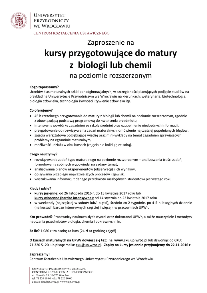 CENTRUM KSZTAŁCENIA USTAWICZNEGO Zaproszenie na kursy przygotowujące do matury z biologii lub chemii na poziomie rozszerzonym Kogo zapraszamy? Uczniów klas maturalnych szkół ponadgimnazjalnych, w szczególności planujących podjęcie studiów na przykład na Uniwersytecie Przyrodniczym we Wrocławiu na kierunkach: weterynaria, biotechnologia, biologia człowieka, technologia żywności i żywienie człowieka itp. Co oferujemy? 45 h rzetelnego przygotowania do matury z biologii lub chemii na poziomie rozszerzonym, zgodnie z obowiązującą podstawą programową do kształcenia przedmiotu, intensywną powtórkę zagadnień ze szkoły średniej oraz uzupełnienie niezbędnych informacji, przygotowanie do rozwiązywania zadań maturalnych, omówienie najczęściej popełnianych błędów, zajęcia warsztatowe pogłębiające wiedzę oraz mini-wykłady na temat zagadnień sprawiających problemy na egzaminie maturalnym, możliwość udziału w obu kursach (zajęcia nie kolidują ze sobą). Czego nauczymy? rozwiązywania zadań typu maturalnego na poziomie rozszerzonym – analizowania treści zadań, formułowania spójnych wypowiedzi na zadany temat, analizowania planów eksperymentów (obserwacji) i ich wyników, opisywania przebiegu najważniejszych procesów i zjawisk, wyszukiwania informacji z danego przedmiotu niezbędnych studentowi pierwszego roku. Kiedy i gdzie? kursy jesienne: od 26 listopada 2016 r. do 15 kwietnia 2017 roku lub kursy wiosenne (bardzo intensywne): od 14 stycznia do 23 kwietnia 2017 roku w weekendy (najczęściej w soboty lub/i piątki), średnio co 2 tygodnie, po 4-5 h lekcyjnych dziennie (na kursach bardzo intensywnych częściej i więcej), w pracowniach UPWr. Kto prowadzi? Pracownicy naukowo-dydaktyczni oraz doktoranci UPWr, a także nauczyciele i metodycy nauczania przedmiotów biologia, chemia i pokrewnych i in. Za ile? 1 080 zł za osobę za kurs (24 zł za godzinę zajęć!) O kursach maturalnych na UPWr dowiesz się też: na www.cku.up.wroc.pl lub dzwoniąc do CKU: 71 320 5120 lub pisząc maila: [email protected]. Zapisy na kursy jesiennie przyjmujemy do 22.11.2016 r. Zapraszamy! Centrum Kształcenia Ustawicznego Uniwersytetu Przyrodniczego we Wrocławiu UNIWERSYTET PRZYRODNICZY WE WROCŁAWIU CENTRUM KSZTAŁCENIA USTAWICZNEGO ul. Norwida 25, 50-375 Wrocław tel. 71 320 10 00 • fax 71 320 10 00 e-mail: [email protected] • www.up.wroc.pl