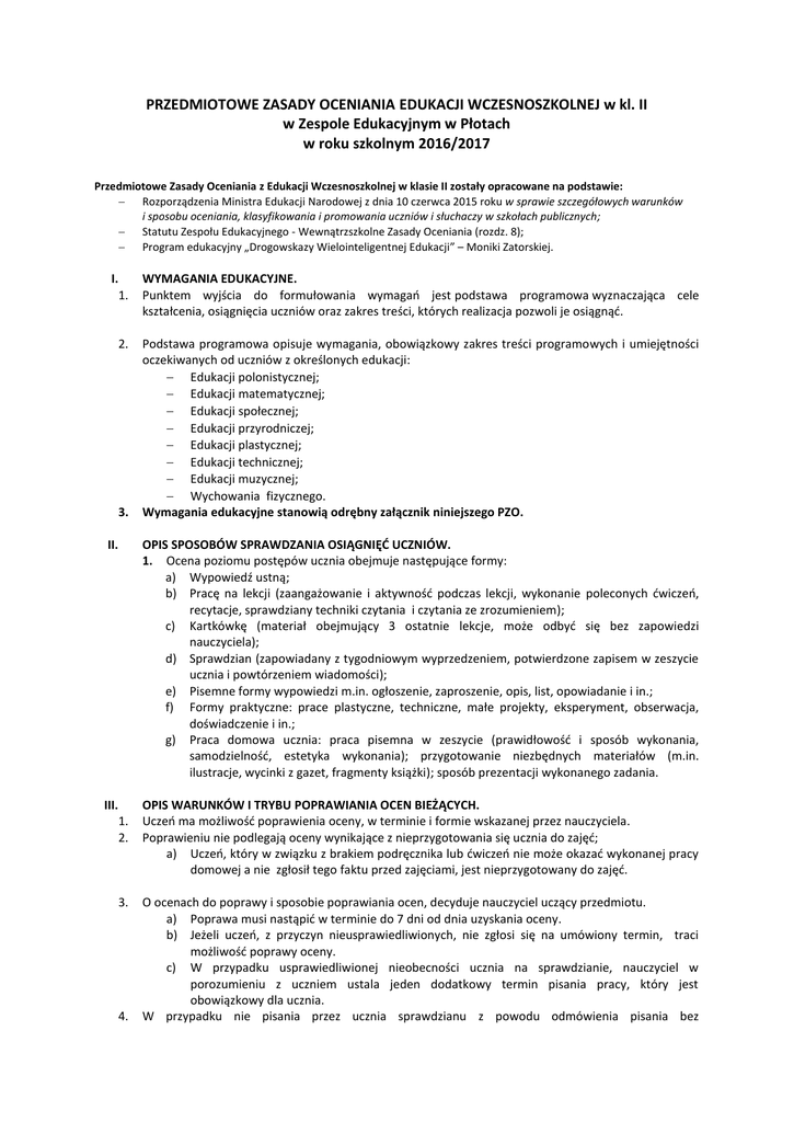 PRZEDMIOTOWE ZASADY OCENIANIA EDUKACJI WCZESNOSZKOLNEJ w kl. II w Zespole Edukacyjnym w Płotach w roku szkolnym 2016/2017 Przedmiotowe Zasady Oceniania z Edukacji Wczesnoszkolnej w klasie II zostały opracowane na podstawie: Rozporządzenia Ministra Edukacji Narodowej z dnia 10 czerwca 2015 roku w sprawie szczegółowych warunków i sposobu oceniania, klasyfikowania i promowania uczniów i słuchaczy w szkołach publicznych; Statutu Zespołu Edukacyjnego - Wewnątrzszkolne Zasady Oceniania (rozdz. 8); Program edukacyjny „Drogowskazy Wielointeligentnej Edukacji” – Moniki Zatorskiej. I. 1. WYMAGANIA EDUKACYJNE. Punktem wyjścia do formułowania wymagań jest podstawa programowa wyznaczająca cele kształcenia, osiągnięcia uczniów oraz zakres treści, których realizacja pozwoli je osiągnąć. 2. Podstawa programowa opisuje wymagania, obowiązkowy zakres treści programowych i umiejętności oczekiwanych od uczniów z określonych edukacji: Edukacji polonistycznej; Edukacji matematycznej; Edukacji społecznej; Edukacji przyrodniczej; Edukacji plastycznej; Edukacji technicznej; Edukacji muzycznej; Wychowania fizycznego. Wymagania edukacyjne stanowią odrębny załącznik niniejszego PZO. 3. II. OPIS SPOSOBÓW SPRAWDZANIA OSIĄGNIĘĆ UCZNIÓW. 1. Ocena poziomu postępów ucznia obejmuje następujące formy: a) Wypowiedź ustną; b) Pracę na lekcji (zaangażowanie i aktywność podczas lekcji, wykonanie poleconych ćwiczeń, recytacje, sprawdziany techniki czytania i czytania ze zrozumieniem); c) Kartkówkę (materiał obejmujący 3 ostatnie lekcje, może odbyć się bez zapowiedzi nauczyciela); d) Sprawdzian (zapowiadany z tygodniowym wyprzedzeniem, potwierdzone zapisem w zeszycie ucznia i powtórzeniem wiadomości); e) Pisemne formy wypowiedzi m.in. ogłoszenie, zaproszenie, opis, list, opowiadanie i in.; f) Formy praktyczne: prace plastyczne, techniczne, małe projekty, eksperyment, obserwacja, doświadczenie i in.; g) Praca domowa ucznia: praca pisemna w zeszycie (prawidłowość i sposób wykonania, samodzielność, estetyka wykonania); przygotowanie niezbędnych materiałów (m.in. ilustracje, wycinki z gazet, fragmenty książki); sposób prezentacji wykonanego zadania. III. 1. 2. 3. 4. OPIS WARUNKÓW I TRYBU POPRAWIANIA OCEN BIEŻĄCYCH. Uczeń ma możliwość poprawienia oceny, w terminie i formie wskazanej przez nauczyciela. Poprawieniu nie podlegają oceny wynikające z nieprzygotowania się ucznia do zajęć; a) Uczeń, który w związku z brakiem podręcznika lub ćwiczeń nie może okazać wykonanej pracy domowej a nie zgłosił tego faktu przed zajęciami, jest nieprzygotowany do zajęć. O ocenach do poprawy i sposobie poprawiania ocen, decyduje nauczyciel uczący przedmiotu. a) Poprawa musi nastąpić w terminie do 7 dni od dnia uzyskania oceny. b) Jeżeli uczeń, z przyczyn nieusprawiedliwionych, nie zgłosi się na umówiony termin, traci możliwość poprawy oceny. c) W przypadku usprawiedliwionej nieobecności ucznia na sprawdzianie, nauczyciel w porozumieniu z uczniem ustala jeden dodatkowy termin pisania pracy, który jest obowiązkowy dla ucznia. W przypadku nie pisania przez ucznia sprawdzianu z powodu odmówienia pisania bez usprawiedliwienia lub nieusprawiedliwionej nieobecności, uczeń otrzymuje ocenę niedostateczną. 5. Poprawianie ocen odbywa się po lekcjach, podczas nauczyciela. 6. Ocena poprawiona nie może być niższa od poprawianej a) ocenę z poprawy nauczyciel wpisuje w dzienniku lekcyjnym, obok oceny poprawianej, b) ostateczna poprawiona ocena jest średnią arytmetyczną dwóch ocen - poprawianej i poprawionej i jest oceną obowiązującą. 7. Brak zadania domowego odnotowywany jest w dzienniku i uwzględniany podczas wystawiania oceny klasyfikacyjnej. Uczeń ma obowiązek a) wykonać zaległe zadanie domowe, b) samodzielnie zgłosić jego wykonanie nauczycielowi w kolejnym dniu przed zajęciami edukacyjnymi. IV. zajęć wyrównawczych – ustalonych przez OPIS WARUNKÓW I TRYBU UZYSKANIA OCENY WYŻSZEJ NIŻ PRZEWIDYWANA OCENA KLASYFIKACYJNA. 1. Za przewidywaną ocenę śródroczną/końcoworoczną przyjmuje się ocenę proponowaną przez nauczyciela i podaną do informacji uczniom i ich rodzicom/opiekunom zgodnie z terminami ustalonymi w kalendarzu na dany rok szkolny. 2. Uczeń ma prawo do uzyskania wyższej oceny klasyfikacyjnej, od proponowanej przez nauczyciela pod warunkiem, że: a) stosuje się do wymagań przedmiotowych i wywiązuje ze swoich obowiązków m.in.: systematycznie uczęszcza na lekcje i się nie spóźnia; b) przychodzi do szkoły przygotowany; c) na bieżąco wykonuje zadania domowe; d) posiada zeszyt ze wszystkimi, wymaganymi przez nauczyciela, notatkami w tym wykonanymi zadaniami domowymi; 3. Procedura ubiegania się o ocenę klasyfikacyjną wyższą niż przewidywana: a) Uczeń chcący uzyskać ocenę klasyfikacyjną wyższą od proponowanej lub jego rodzic/ opiekun, zgłasza się z wnioskiem do nauczyciela, w ciągu 3 dni od dnia otrzymania informacji o proponowanej ocenie klasyfikacyjnej. b) Nauczyciel przyjmuje wniosek i przygotowuje zestaw zadań sprawdzających (wiedzę i umiejętności) z zakresu całego materiału danego półrocza pod warunkiem ze uczeń spełnia wymagania określone w IV/ pkt 2 c) Nauczyciel informuje ucznia o terminie (nie później niż 3 dni przed klasyfikacyjnym posiedzeniem rady pedagogicznej) wykonania przez niego zadań sprawdzających. d) Jeśli uczeń, z przyczyn nieusprawiedliwionych, nie przystąpi do poprawy w określonym przez nauczyciela terminie, traci wówczas prawo do ubiegania się o podwyższenie oceny. e) Uzyskanie wyższej oceny z zestawu zadań sprawdzających, od proponowanej przez nauczyciela skutkuje podwyższeniem tej oceny o jeden stopień. Opracowała: mgr Anna Tabaka