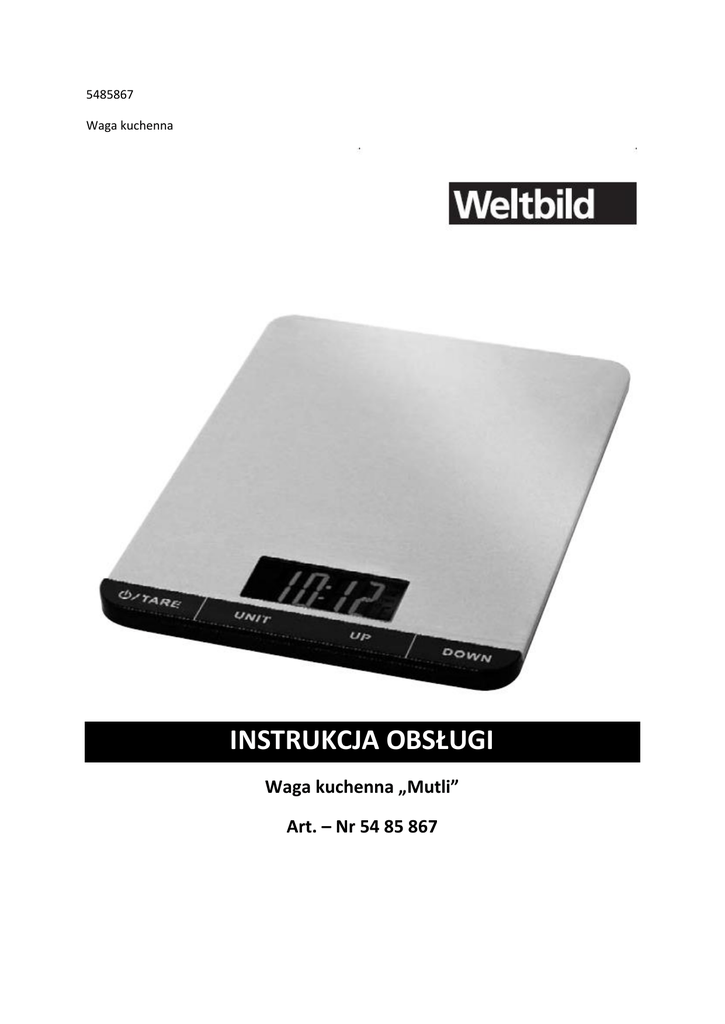 5485867 Waga kuchenna INSTRUKCJA OBSŁUGI Waga kuchenna „Mutli” Art. – Nr 54 85 867 Dziękujemy, że zdecydowali się Państwo na zakup tego produktu. Przed skorzystaniem z produktu, należy zapoznać się uważnie z instrukcją obsługi oraz zachować ją, aby móc do niej zajrzeć także w późniejszym czasie. Opis urządzenia Obciążenie: 2 – 5000 g Funkcja tary Automatyczne wyłączanie Wskaźnik poziomu naładowania baterii Zintegrowany termometr Zegar Podświetlenie Dane techniczne 1. 2. 3. 4. 5. Obciążenie: 2 – 5000 g Jednostka miary: 1 g Zasilanie: 2 x baterie AAA Wyświetlacz: LDC, 4 – cyfrowy Przełączanie jednostek wagi: g, kg, oz, lb Obsługa wagi Wyjmij wagę z opakowania i otwórz pojemnik na baterie, znajdujący się na spodzie wagi. Włóż 2 baterie AAA, zwracając uwagę na ich właściwe ułożenie +/- takie, jak oznaczono w pojemniku na baterie. Zamknij następnie pojemnik na baterie i postaw wagę na gładkim stole, aby nie spadła i aby uniknąć niedokładności pomiaru. Ważenie Włącz wagę. Na wyświetlaczu pokaże się „0”. Wciskając przycisk „Unit” przejdź do pożądanej jednostki ważenia (g, kg, oz, lb). Postaw ważony surowiec na wadze, na wyświetlaczu pokaże się jego waga. Jednostkę ważenia można zmienić także podczas ważenia surowca, wciskając przycisk „Unit”. Funkcję tary można aktywować stawiając pojemnik na wadze i wciskając przycisk „Tara”. Waga ustawi się na zero tak, że zważona zostanie tylko zawartość pojemnika. Funkcję tary można aktywować dowolnie często tak, aby móc doważać poszczególne składniki. To, czy znajdujesz się w funkcji tary czy w funkcji normalnego ważenia poznasz po małym znaczku dołu. , który będzie widoczny na wyświetlaczu po lewej stronie u Ustawianie czasu i termometru Czas Włącz wagę. Wciskaj przycisk „UP” tak długo, aż wejdziesz w funkcję zegara. Wciskaj przycisk „UP” lub „DOWN”, aby zmienić godziny w górę lub w dół. Wciskając przycisk „TARA” przejdź do ustawienia minut, które możesz ustawić podobnie jak godziny, wciskając przycisk „UP” lub „DOWN”. Zapisanie ustawionego czasu nastąpi po wciśnięciu przycisku „TARA”. Temperatura Wskazanie temperatury, po pierwszym włączeniu wagi musi zostać ustawione ręcznie, przy każdym kolejnym włączeniu wagi pomiar temperatury będzie się odbywać automatycznie. Podczas pierwszego ustawiania temperatury postępuj w następujący sposób: Włącz wagę i wciskaj przycisk „DOWN” tak długo, aż wejdziesz do funkcji wskazywana temperatury. Następnie korzystaj z przycisków „UP” lub „DOWN”, aby ustawić dziesiętne i jednostki oraz miejsce po przecinku wartości mierzonej temperatury. Wciskając przycisk „TARA” możesz przełączać się między poszczególnymi miejscami i ostatecznie zapisać wpisaną temperaturę. Prawidłowy zapis temperatury zostanie potwierdzony komunikatem „PASS”. Przełączanie się między funkcją wskazywania czasu a temperatury: Włącz wagę. Wciskając dłuższy czas przycisk „TARA” wejdziesz do funkcji wskazywania temperatury, wciskając przycisk „UNIT” do funkcji wskazywania czasu. Błędne wskazana na wyświetlaczu Jeśli waga jest nadmiernie obciążona, na wyświetlaczu pokaże się komunikat „EEEE”. Jeśli na wyświetlaczu pokaże się symbol „LO” oznacza to, że jest niewystarczające zasilanie. W takim przypadku należy wymienić baterie tak szybko, jak to możliwe. Rady dotyczące korzystania i konserwacji wagi Stawiaj wagę na czystym i płaskim stole. Maksymalne obciążenie wagi wynosi 5000 g, przy czym uwzględniona jest waga tary. Aby przedłużyć żywotność wagi, nie narażaj wagi na działanie wilgotnego ani zimnego otoczenia. Produkt jest wyposażony w wysoce precyzyjny system ważenia. Unikaj naciskania na wagę, uderzania jej i nie dopuść do tego, aby waga spadła, ponieważ może się łatwo uszkodzić. Jeśli powierzchnia wagi jest zabrudzona, przetrzyj urządzenie miękką szmatką. Nigdy nie używaj do czyszczenia chemicznych środków czyszczących oraz unikaj dostania się wody oraz innych cieczy do wnętrza wagi. Urządzenie nadaje się wyłącznie do ważenia małych przedmiotów i potraw. Jeśli wynik ważenia wydaje Ci się niewłaściwy, sprawdź, czy baterie zostały poprawnie założone i czy mają kontakt z biegunami. Jeśli korzystasz z baterii przez dłuższy czas wymień je i wypróbuj działanie wagi po założeniu nowych baterii. DZIAŁ OBSŁUGI KLIENTA E-mail: [email protected] Telefon: (+48) 22 517 50 17 poniedziałek - piątek w godzinach 8:00 – 18:00 Weltbild.pl Weltbild Polska Sp. z o.o. ul. Hankiewicza 2, 02-103 Warszawa Utylizacja Produkt po zużyciu nie może zostać wyrzucony wraz z odpadami domowymi lecz oddany do punktu, zajmującego się recyklingiem zużytych urządzeń elektrycznych i elektronicznych. Informuje o tym symbol przekreślonego kosza, umieszczony na produkcie, opakowaniu lub w instrukcji obsługi.