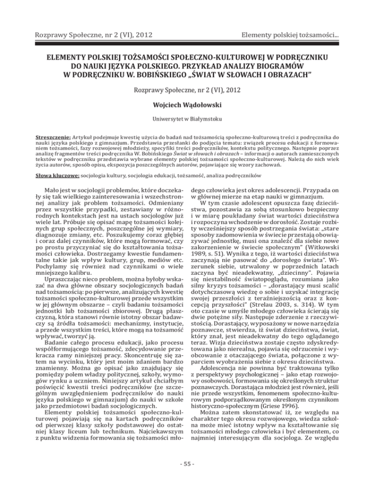 Rozprawy Społeczne, nr 2 (VI), 2012 Elementy polskiej tożsamości... ELEMENTY POLSKIEJ TOŻSAMOŚCI SPOŁECZNO-KULTUROWEJ W PODRĘCZNIKU DO NAUKI JĘZYKA POLSKIEGO. PRZYKŁAD ANALIZY BIOGRAMÓW W PODRĘCZNIKU W. BOBIŃSKIEGO „ŚWIAT W SŁOWACH I OBRAZACH” Rozprawy Społeczne, nr 2 (VI), 2012 Wojciech Wądołowski Uniwersytet w Białymstoku Streszczenie: Artykuł podejmuje kwestię użycia do badań nad tożsamością społeczno-kulturową treści z podręcznika do nauki języka polskiego z gimnazjum. Przedstawia przesłanki do podjęcia tematu: związek procesu edukacji z formowaniem tożsamości, fazy rozwojowej młodzieży, specy iki treści podręczników, kontekstu politycznego. Następnie poprzez analizę fragmentów treści podręcznika W. Bobińskiego Świat w słowach i obrazach – informacji o autorach zamieszczonych tekstów w podręczniku przedstawia wybrane elementy polskiej tożsamości społeczno-kulturowej. Należą do nich wiek życia autorów, sposób opisu, ekspozycja poszczególnych autorów, pojawiające się wzory zachowań. Słowa kluczowe: socjologia kultury, socjologia edukacji, tożsamość, analiza podręczników Mało jest w socjologii problemów, które doczekały się tak wielkiego zainteresowania i wszechstronnej analizy jak problem tożsamości. Odmieniany przez wszystkie przypadki, zestawiany w różnorodnych kontekstach jest na ustach socjologów już wiele lat. Próbuje się opisać mapę tożsamości kolejnych grup społecznych, poszczególne jej wymiary, diagnozuje zmiany, etc. Poszukujemy coraz głębiej i coraz dalej czynników, które mogą formować, czy po prostu przyczyniać się do kształtowania tożsamości człowieka. Dostrzegamy kwestie fundamentalne takie jak wpływ kultury, grup, mediów etc. Pochylamy się również nad czynnikami o wiele mniejszego kalibru. Upraszczając nieco problem, można byłoby wskazać na dwa główne obszary socjologicznych badań nad tożsamością: po pierwsze, analizujących kwestię tożsamości społeczno-kulturowej przede wszystkim w jej głównym obszarze – czyli badaniu tożsamości jednostki lub tożsamości zbiorowej. Drugą płaszczyzną, która stanowi równie istotny obszar badawczy są źródła tożsamości: mechanizmy, instytucje, a przede wszystkim treści, które mogą na tożsamość wpływać, tworzyć ją. Badanie całego procesu edukacji, jako procesu współformującego tożsamość, zdecydowanie przekracza ramy niniejszej pracy. Skoncentruję się zatem na wycinku, który jest moim zdaniem bardzo znamienny. Można go opisać jako znajdujący się pomiędzy polem władzy politycznej, szkoły, wymogów rynku a uczniem. Niniejszy artykuł chciałbym poświęcić kwestii treści podręczników (ze szczególnym uwzględnieniem podręczników do nauki języka polskiego w gimnazjum) do nauki w szkole jako przedmiotowi badań socjologicznych. Elementy polskiej tożsamości społeczno-kulturowej pojawiają się na kartach podręczników od pierwszej klasy szkoły podstawowej do ostatniej klasy liceum lub technikum. Najciekawszym z punktu widzenia formowania się tożsamości mło- dego człowieka jest okres adolescencji. Przypada on w głównej mierze na etap nauki w gimnazjum. W tym czasie adolescent opuszcza fazę dzieciństwa, pozostawia za sobą stosunkowo bezpieczny i w miarę poukładany świat wartości dzieciństwa i rozpoczyna wchodzenie w dorosłość. Zostaje rozbity wcześniejszy sposób postrzegania świata: „stare sposoby zadomowienia w świecie przestają obowiązywać jednostkę, musi ona znaleźć dla siebie nowe zakorzenienie w świecie społecznym” (Witkowski 1989, s. 51). Wynika z tego, iż wartości dzieciństwa zaczynają nie pasować do „dorosłego świata”. Wizerunek siebie, utrwalony w poprzednich latach zaczyna być nieadekwatny, „dziecinny”. Pojawia się niestabilność światopoglądu, rozumiana jako silny kryzys tożsamości – „dorastający musi scalić dotychczasową wiedzę o sobie i uzyskać integrację swojej przeszłości z teraźniejszością oraz z koncepcją przyszłości” (Strelau 2003, s. 314). W tym oto czasie w umyśle młodego człowieka ścierają się dwie potężne siły. Następuje zderzenie z rzeczywistością. Dorastający, wyposażony w nowe narzędzia poznawcze, stwierdza, iż świat dzieciństwa, świat, który znał, jest nieadekwatny do tego oglądanego teraz. Wizja dzieciństwa zostaje często zdyskredytowana jako nierealna, pojawia się odrzucenie i wyobcowanie z otaczającego świata, połączone z wyparciem wyobrażenia siebie z okresu dzieciństwa. Adolescencja nie powinna być traktowana tylko z perspektywy psychologicznej – jako etap rozwojowy osobowości, formowania się określonych struktur poznawczych. Dorastająca młodzież jest również, jeśli nie przede wszystkim, fenomenem społeczno-kulturowym podporządkowanym określonym czynnikom historyczno-społecznym (Griese 1996). Można zatem skonstatować iż, ze względu na charakter tego okresu rozwojowego, wiedza szkolna może mieć istotny wpływ na kształtowanie się tożsamości młodego człowieka i być elementem, co najmniej interesującym dla socjologa. Ze względu - 55 - Rozprawy Społeczne, nr 2 (VI), 2012 Elementy polskiej tożsamości... na to, iż jest to okres, w którym tożsamość staje się jednym z najważniejszych elementów w życiu młodego człowieka, można się spodziewać, iż części składowe ją tworzące będą bardziej eksponowane np. w edukacji szkolnej i zdecydowanie częściej poszukiwane przez samego zainteresowanego. Badanie elementów tożsamości pojawiających się w szkole można przeprowadzać na różnych materiałach, można badać: wiedzę uczniów, przebieg lekcji, notatki uczniów w zeszytach, programy nauczania, konspekty nauczycieli czy wreszcie materiały dydaktyczne takie jak podręcznik, zeszyty ćwiczeń przypisane do konkretnego podręcznika. Analiza podręcznika daje wiele ułatwień badawczych. Dzi