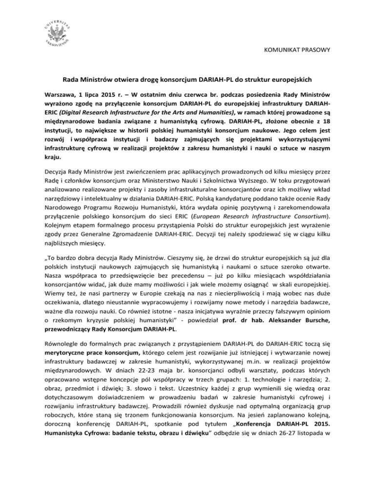 KOMUNIKAT PRASOWY Rada Ministrów otwiera drogę konsorcjum DARIAH-PL do struktur europejskich Warszawa, 1 lipca 2015 r. – W ostatnim dniu czerwca br. podczas posiedzenia Rady Ministrów wyrażono zgodę na przyłączenie konsorcjum DARIAH-PL do europejskiej infrastruktury DARIAHERIC (Digital Research Infrastructure for the Arts and Humanities), w ramach której prowadzone są międzynarodowe badania związane z humanistyką cyfrową. DARIAH-PL, złożone obecnie z 18 instytucji, to największe w historii polskiej humanistyki konsorcjum naukowe. Jego celem jest rozwój i współpraca instytucji i badaczy zajmujących się projektami wykorzystującymi infrastrukturę cyfrową w realizacji projektów z zakresu humanistyki i nauki o sztuce w naszym kraju. Decyzja Rady Ministrów jest zwieńczeniem prac aplikacyjnych prowadzonych od kilku miesięcy przez Radę i członków konsorcjum oraz Ministerstwo Nauki i Szkolnictwa Wyższego. W toku przygotowań analizowano realizowane projekty i zasoby infrastrukturalne konsorcjantów oraz ich możliwy wkład narzędziowy i intelektualny w działania DARIAH-ERIC. Polską kandydaturę poddano także ocenie Rady Narodowego Programu Rozwoju Humanistyki, która wydała opinię pozytywną i zarekomendowała przyłączenie polskiego konsorcjum do sieci ERIC (European Research Infrastructure Consortium). Kolejnym etapem formalnego procesu przystąpienia Polski do struktur europejskich jest wyrażenie zgody przez Generalne Zgromadzenie DARIAH-ERIC. Decyzji tej należy spodziewać się w ciągu kilku najbliższych miesięcy. „To bardzo dobra decyzja Rady Ministrów. Cieszymy się, że drzwi do struktur europejskich są już dla polskich instytucji naukowych zajmujących się humanistyką i naukami o sztuce szeroko otwarte. Nasza współpraca to przedsięwzięcie bez precedensu – już po kilku miesiącach współdziałania konsorcjantów widać, jak duże mamy możliwości i jak wiele możemy osiągnąć w skali europejskiej. Wiemy też, że nasi partnerzy w Europie czekają na nas z niecierpliwością i mają wobec nas duże oczekiwania, dlatego nieustannie wypracowujemy i rozwijamy nowe metody i narzędzia badawcze, ważne dla rozwoju nauki. Co również istotne - nasza inicjatywa wyraźnie przeczy fałszywym opiniom o rzekomym kryzysie polskiej humanistyki” - powiedział prof. dr hab. Aleksander Bursche, przewodniczący Rady Konsorcjum DARIAH-PL. Równolegle do formalnych prac związanych z przystąpieniem DARIAH-PL do DARIAH-ERIC toczą się merytoryczne prace konsorcjum, którego celem jest rozwijanie już istniejącej i wytwarzanie nowej infrastruktury badawczej w zakresie humanistyki, wykorzystywanej m.in. w realizacji projektów międzynarodowych. W dniach 22-23 maja br. konsorcjanci odbyli warsztaty, podczas których opracowano wstępne koncepcje pól współpracy w trzech grupach: 1. technologie i narzędzia; 2. obraz, przedmiot i dźwięk; 3. słowo i tekst. Uczestnicy każdej z grup wymienili się wiedzą oraz dotychczasowym doświadczeniem w prowadzeniu badań w zakresie humanistyki cyfrowej i rozwijaniu infrastruktury badawczej. Prowadzili również dyskusje nad optymalną organizacją grup roboczych, które staną się trzonem funkcjonowania konsorcjum. Na jesień zaplanowano kolejną, doroczną konferencję DARIAH-PL, spotkanie pod tytułem „Konferencja DARIAH-PL 2015. Humanistyka Cyfrowa: badanie tekstu, obrazu i dźwięku” odbędzie się w dniach 26-27 listopada w Lublinie, a jej głównym organizatorem będzie Uniwersytet Marii Curie-Skłodowskiej wraz z Ministerstwem Nauki i Szkolnictwa Wyższego. *** Humanistyka cyfrowa polega na wykorzystaniu cyfrowych technologii i narzędzi w badaniach i edukacji w zakresie nauk humanistycznych i o sztuce. Chodzi tu zarówno o podnoszenie tradycyjnych problemów danej dyscypliny przy wykorzystaniu cyfrowych narzędzi, jak i o stawianie nowych pytań badawczych, które umożliwia nowoczesna technika. Konsorcjum powołane w celu zorganizowania współpracy w tym nowym, ważnym obszarze powstało w sierpniu 2014 roku, natomiast w pierwszej połowie 2015 r. zostało poszerzone o pięć nowych instytucji. Obecnie w skład konsorcjum wchodzą: Uniwersytet Warszawski (koordynator konsorcjum), Akademia Sztuk Pięknych w Warszawie, Biblioteka Narodowa, Instytut Badań Literackich Polskiej Akademii Nauk, Instytut Chemii Bioorganicznej Polskiej Akademii Nauk – Poznańskie Centrum Superkomputerowo-Sieciowe, Instytut Historii Polskiej Akademii Nauk im. Tadeusza Manteuffla, Instytut Języka Polskiego Polskiej Akademii Nauk, Instytut Podstaw Informatyki Polskiej Akademii Nauk, Instytut Slawistyki Polskiej Akademii Nauk, Instytut Sztuki Polskiej Akademii Nauk, Politechnika Wrocławska, Uniwersytet Jagielloński, Uniwersytet Marii Curie-Skłodowskiej, Uniwersytet Mikołaja Kopernika, Uniwersytet Pedagogiczny im. Komisji Edukacji Narodowej, Uniwersytet Śląski, Uniwersytet Adama Mickiewicza w Poznaniu, Uniwersytet Wrocławski. Naczelnym organem konsorcjum jest Rada złożona z przedstawicieli wszystkich konsorcjantów, która działa na podstawie umowy i regulaminu. DARIAH-ERIC składa się obecnie z piętnastu członków-założycieli (Austria, Belgia, Chorwacja, Cypr, Dania, Francja, Grecja, Holandia, Irlandia, Luksemburg, Malta, Niemcy, Serbia, Słowenia, Włochy). W skład konsorcjów poszczególnych krajów weszły najbardziej liczące się instytucje europejskie rozwijające infrastrukturę badawczą dla nauk humanistycznych i o sztuce. Polskie konsorcjum jest – obok niemieckiego - największym krajowym porozumieniem europejskiej sieci. Więcej informacji o konsorcjum DARIAH-PL można znaleźć na tymczasowej stronie www.dhlab.uw.edu.pl. Nowa strona zostanie uruchomiona wkrótce po decyzji o przyłączeniu konsorcjum do struktury DARIAH-ERIC. --Więcej informacji udziela: dr Karolina Brylska Instytut Dziennikarstwa UW mail: [email protected] tel. 508 388 334