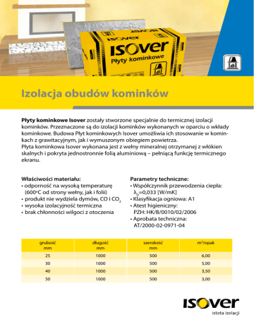 Izolacja obudów kominków Płyty kominkowe Isover zostały stworzone specjalnie do termicznej izolacji kominków. Przeznaczone są do izolacji kominków wykonanych w oparciu o wkłady kominkowe. Budowa Płyt kominkowych Isover umożliwia ich stosowanie w kominkach z grawitacyjnym, jak i wymuszonym obiegiem powietrza. Płyta kominkowa Isover wykonana jest z wełny mineralnej otrzymanej z włókien skalnych i pokryta jednostronnie folią aluminiową – pełniącą funkcję termicznego ekranu. Właściwości materiału: •odpornośćnawysokątemperaturę (600oC od strony wełny, jak i folii) •produktniewydzieladymów,COiCO2 •wysokaizolacyjnośćtermiczna •brakchłonnościwilgocizotoczenia Parametry techniczne: •Współczynnikprzewodzeniaciepła: λD=0,033[W/mK] •Klasyfikacjaogniowa:A1 •Atesthigieniczny: PZH:HK/B/0010/02/2006 •Aprobatatechniczna: AT/2000-02-0971-04 grubość mm długość mm szerokość mm m2/opak 25 1000 500 6,00 30 1000 500 5,00 40 1000 500 3,50 50 1000 500 3,00 kominek z grawitacyjnym obiegiem powietrza kominek z wymuszonym obiegiem powietrza Zalecenia i wskazówki montażowe Wariant I (kominek z grawitacyjnym obiegiem powietrza) Ponadto: Izolacja dystrybutora gorącego powietrza – zabezpiecza przed stratami ciepła i nadmiernym nagrzaniem obudowy •izolacja powinna być umieszczona w odległości min. 5 cm od wkładu (odległość może być jednak większa – co wynika często z zaleceń producentów wkładów) •płyty należy montować folią skierowaną do wkładu kominkowego •do montażu płyt należy używać profili zapewniających ich ciasne osadowienie •należy zachować ciągłość pokrycia z folii – w miejscach łączeń płyt należy zastosować samoprzylepną taśmę aluminiową o odpowiednio wysokiej odporności na temperaturę •do docinania płyt należy używać ostrych narzędzi, tak aby krawędzie płyt były gładkie, zapewniając tym samym szczelność izolacji •przed pierwszym uruchomieniem kominka pamiętajmy o usunięciu wszelkich resztek wełny i taśmy izolacyjnej Wariant II (kominek z wymuszonym obiegiem powietrza) •izolacja powinna być zamontowana folią na zewnątrz dystrybutora •do mocowania płyt izolacyjnych do dystrybutora i osłon konwekcyjnych używamy gwoździ samoprzylepnych lub wkrętów montażowych z podkładkami www.isover.pl Porada: ilość opakowań Płyt kominkowych Isover gr. 30 mm na 1 kominek 1-2 kartony waga 1 opakowania Płyt kominkowych Isover gr. 30 mm 15 kg Gdyby zamknąć powietrze o temp. 300 C w sześcianie o wymiarach 1 m x 1m x 2 m zbudowanym z Płyt kominkowych Isover o gr. 30 mm to temp. powietrza wewnątrz po godzinie spadłaby tylko o 12oC. Centrum Informacji Technicznej 0800 163 121