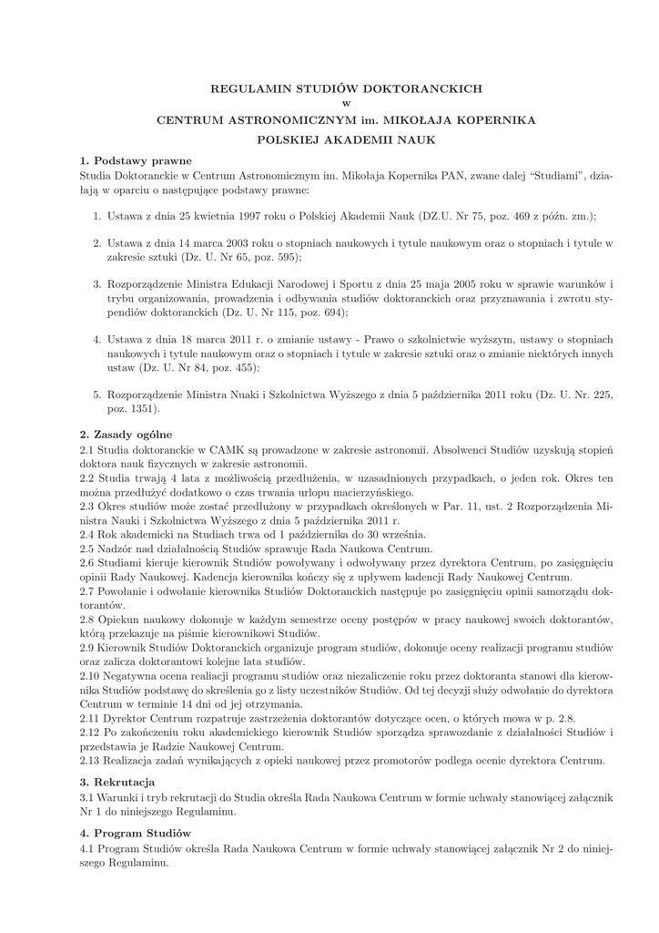 REGULAMIN STUDIÓW DOKTORANCKICH w CENTRUM ASTRONOMICZNYM im. MIKOŁAJA KOPERNIKA POLSKIEJ AKADEMII NAUK 1. Podstawy prawne Studia Doktoranckie w Centrum Astronomicznym im. Mikołaja Kopernika PAN, zwane dalej “Studiami”, działają w oparciu o następujące podstawy prawne: 1. Ustawa z dnia 25 kwietnia 1997 roku o Polskiej Akademii Nauk (DZ.U. Nr 75, poz. 469 z późn. zm.); 2. Ustawa z dnia 14 marca 2003 roku o stopniach naukowych i tytule naukowym oraz o stopniach i tytule w zakresie sztuki (Dz. U. Nr 65, poz. 595); 3. Rozporządzenie Ministra Edukacji Narodowej i Sportu z dnia 25 maja 2005 roku w sprawie warunków i trybu organizowania, prowadzenia i odbywania studiów doktoranckich oraz przyznawania i zwrotu stypendiów doktoranckich (Dz. U. Nr 115, poz. 694); 4. Ustawa z dnia 18 marca 2011 r. o zmianie ustawy - Prawo o szkolnictwie wyższym, ustawy o stopniach naukowych i tytule naukowym oraz o stopniach i tytule w zakresie sztuki oraz o zmianie niektórych innych ustaw (Dz. U. Nr 84, poz. 455); 5. Rozporządzenie Ministra Nuaki i Szkolnictwa Wyższego z dnia 5 października 2011 roku (Dz. U. Nr. 225, poz. 1351). 2. Zasady ogólne 2.1 Studia doktoranckie w CAMK są prowadzone w zakresie astronomii. Absolwenci Studiów uzyskują stopień doktora nauk fizycznych w zakresie astronomii. 2.2 Studia trwają 4 lata z możliwością przedłużenia, w uzasadnionych przypadkach, o jeden rok. Okres ten można przedłużyć dodatkowo o czas trwania urlopu macierzyńskiego. 2.3 Okres studiów może zostać przedłużony w przypadkach określonych w Par. 11, ust. 2 Rozporządzenia Ministra Nauki i Szkolnictwa Wyższego z dnia 5 października 2011 r. 2.4 Rok akademicki na Studiach trwa od 1 października do 30 września. 2.5 Nadzór nad działalnością Studiów sprawuje Rada Naukowa Centrum. 2.6 Studiami kieruje kierownik Studiów powoływany i odwoływany przez dyrektora Centrum, po zasięgnięciu opinii Rady Naukowej. Kadencja kierownika kończy się z upływem kadencji Rady Naukowej Centrum. 2.7 Powołanie i odwołanie kierownika Studiów Doktoranckich następuje po zasięgnięciu opinii samorządu doktorantów. 2.8 Opiekun naukowy dokonuje w każdym semestrze oceny postępów w pracy naukowej swoich doktorantów, którą przekazuje na piśmie kierownikowi Studiów. 2.9 Kierownik Studiów Doktoranckich organizuje program studiów, dokonuje oceny realizacji programu studiów oraz zalicza doktorantowi kolejne lata studiów. 2.10 Negatywna ocena realiacji programu studiów oraz niezaliczenie roku przez doktoranta stanowi dla kierownika Studiów podstawę do skreślenia go z listy uczestników Studiów. Od tej decyzji służy odwołanie do dyrektora Centrum w terminie 14 dni od jej otrzymania. 2.11 Dyrektor Centrum rozpatruje zastrzeżenia doktorantów dotyczące ocen, o których mowa w p. 2.8. 2.12 Po zakończeniu roku akademickiego kierownik Studiów sporządza sprawozdanie z działalności Studiów i przedstawia je Radzie Naukowej Centrum. 2.13 Realizacja zadań wynikających z opieki naukowej przez promotorów podlega ocenie dyrektora Centrum. 3. Rekrutacja 3.1 Warunki i tryb rekrutacji do Studia określa Rada Naukowa Centrum w formie uchwały stanowiącej załącznik Nr 1 do niniejszego Regulaminu. 4. Program Studiów 4.1 Program Studiów określa Rada Naukowa Centrum w formie uchwały stanowiącej załącznik Nr 2 do niniejszego Regulaminu. 5. Stypendia 5.1 Stypendia doktoranckie przyznaje dyrektor Centrum po zaopiniowaniu przez Komisję Stypendialną. 5.2 Stypendium może być przyznane doktorantowi, który wzorowo realizuje program studiów doktoranckich. Stypendium na pierwszym roku studiów może być przyznane doktorantowi, który osiągnął dobre wyniki w postępowaniu rekrutacyjnym. 5.3 Studenci, którym Studia zostały przedłużone z innego powodu niż urlop macierzyński nie otrzymują stypendium w trakcie trwania piątego roku studiów. 5.4 Wysokość stypendium jest ustalana corocznie przed rozpoczęciem nowego roku akademickiego decyzją dyrektora Centrum po zasięgnięciu opinii Komisji Stypendialnej. 5.5 Komisję stpendialną powołuje dyrektor Centrum na początku każdego roku akademickiego. 5.6 Uczestnicy starszych lat Studiów mogą otrzymywać stypendium wyższe przeciętnie o 20 % od stypendium otrzymywanego przez uczestników roku pierwszego. Decyzja o przyznaniu wyższego stypendium podejmowana jest na podstawie oceny postępów pracy naukowej i rozwoju naukowego uczestnika Studiów, na którą składa się: – rozmowa dyrektora Centrum, kierownika Studiów i opiekuna naukowego z uczestnikiem Studiów, – liczba publikacji recenzowanych prac naukowych, – publikacje i działalność popularnonaukowa, – liczba wygłoszonych seminariów naukowych. 5.7 Dyrektor Centrum może nie przyznać stypendium lub cofnąć stypendium. W szczególności, cofnięcie stypendium może nastąpić po upływie 22 dni roboczych od chwili wyjazdu doktoranta na długoterminowy staż zagraniczny. 5.8 Wyjazdy doktorantów na konferencje i warsztaty naukowe oraz na obserwacje odbywają się na takich samych zasadach, jak wyjazdy pracowników Centrum. 5.9 Decyzje, o których mowa w punktach 5.4, 5.6 i 5.7, wraz ze stosownym uzasadnieniem doktorant otrzymuje na piśmie. 5.10 Zasady ujęte w punktach od 5.1 do 5.9 nie dotyczą doktorantów, którzy nie są obywatelami RP, i których opłaty za studia regulowane są odrębnymi przepisami. 6. Sprawy socjalno - bytowe 6.1 Doktorant ma prawo do 8 tygodni przerwy w zajęciach w ciągu roku akademickiego. Przerwa ta jest odpowiednikiem wakacji studenckich. Terminy przerw w zajęciach w danym roku akademickim ustalane są przez Dyrektora Centrum w formie zarządzenia. 6.2 Doktorant ma prawo do korzystania z opieki medycznej na takich samych zasadach jak etatowy pracownik Centrum. Ma również prawo do dofinansowania kosztów okularów korygujących wzrok, na następujących zasadach: – Centrum pokrywa częściowo koszt wykonania okularów kor