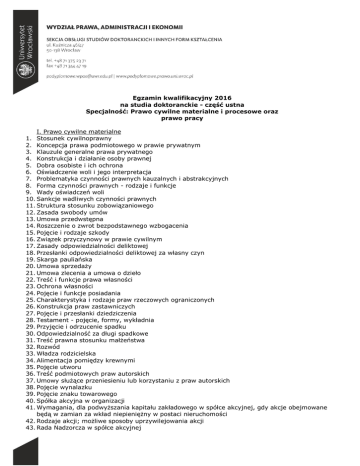 Egzamin kwalifikacyjny 2016 na studia doktoranckie - część ustna Specjalność: Prawo cywilne materialne i procesowe oraz prawo pracy I. Prawo cywilne materialne 1. Stosunek cywilnoprawny 2. Koncepcja prawa podmiotowego w prawie prywatnym 3. Klauzule generalne prawa prywatnego 4. Konstrukcja i działanie osoby prawnej 5. Dobra osobiste i ich ochrona 6. Oświadczenie woli i jego interpretacja 7. Problematyka czynności prawnych kauzalnych i abstrakcyjnych 8. Forma czynności prawnych - rodzaje i funkcje 9. Wady oświadczeń woli 10. Sankcje wadliwych czynności prawnych 11. Struktura stosunku zobowiązaniowego 12. Zasada swobody umów 13. Umowa przedwstępna 14. Roszczenie o zwrot bezpodstawnego wzbogacenia 15. Pojęcie i rodzaje szkody 16. Związek przyczynowy w prawie cywilnym 17. Zasady odpowiedzialności deliktowej 18. Przesłanki odpowiedzialności deliktowej za własny czyn 19. Skarga pauliańska 20. Umowa sprzedaży 21. Umowa zlecenia a umowa o dzieło 22. Treść i funkcje prawa własności 23. Ochrona własności 24. Pojęcie i funkcje posiadania 25. Charakterystyka i rodzaje praw rzeczowych ograniczonych 26. Konstrukcja praw zastawniczych 27. Pojęcie i przesłanki dziedziczenia 28. Testament - pojęcie, formy, wykładnia 29. Przyjęcie i odrzucenie spadku 30. Odpowiedzialność za długi spadkowe 31. Treść prawna stosunku małżeństwa 32. Rozwód 33. Władza rodzicielska 34. Alimentacja pomiędzy krewnymi 35. Pojęcie utworu 36. Treść podmiotowych praw autorskich 37. Umowy służące przeniesieniu lub korzystaniu z praw autorskich 38. Pojęcie wynalazku 39. Pojęcie znaku towarowego 40. Spółka akcyjna w organizacji 41. Wymagania, dla podwyższania kapitału zakładowego w spółce akcyjnej, gdy akcje obejmowane będą w zamian za wkład niepieniężny w postaci nieruchomości 42. Rodzaje akcji; możliwe sposoby uprzywilejowania akcji 43. Rada Nadzorcza w spółce akcyjnej 44. Postępowanie przy łączeniu spółek kapitałowych; skutki połączenia się spółek 45. Przekształcanie spółek a prawa wspólników. Granice ochrony wspólników mniejszościowych. 46. Realizacja uprawnień z rękojmi za wady fizyczne przez leasingobiorcę 47. Odpowiedzialność dającego zlecenie za działania agenta 48. Zasady odpowiedzialności wspólników spółki jawnej za zobowiązania spółki z uwzględnieniem odpowiedzialności za zobowiązania niepieniężne 49. Pojęcie udziału w handlowej spółce osobowej; przeniesienie ogółu praw i obowiązków wspólnika spółki osobowej 50. Zasady i zakres odpowiedzialności partnera w spółce partnerskiej 51. Powstanie spółki komandytowo-akcyjnej 52. Ograniczenia prawa wspólnika do reprezentowania spółki cywilnej i ich skuteczność względem osób trzecich 53. Nieruchomość w majątku spółki cywilnej 54. Rozwiązanie spółki cywilnej i jego skutki 55. Zmiany w składzie osobowym spółki cywilnej 56. Sposoby podwyższenia kapitału zakładowego i powiązanego z nim obejmowania udziałów w spółce z ograniczoną odpowiedzialnością 57. Sposoby zmiany składu osobowego spółki z ograniczoną odpowiedzialnością; 58. Wadliwość uchwał walnego zgromadzenia spółki z ograniczoną odpowiedzialnością 59. Omów zagadnienie konfliktu członka zarządu i spółki z ograniczoną odpowiedzialnością sprzeczność interesów, umowy między, spółką a członkiem zarządu, działalność konkurencyjna, spory między spółką a członkiem zarządu 60. Przedsiębiorca, przedsiębiorstwo, działalność gospodarcza. 61. Prokura 62. Firma. Zasady prawa firmowego. 63. Kapitał zakładowy. Wkłady do spółek kapitałowych. II. Prawo cywilne procesowe 64. Pojęcie sprawy cywilnej. 65. Pojęcie jurysdykcji krajowej 66. Przesłanki procesowe i materialnoprawne - pojęcie, rodzaje, skutki braku. 67. Właściwość sądów w sprawach cywilnych 68. Sposoby rektyfikacji orzeczeń. 69. Wyłączenie sędziego 70. Zdolność sądowa, procesowa i postulacyjna 71. Legitymacja procesowa i jej rodzaje 72. Pojęcie i rodzaje współuczestnictwa w sporze 73. Interwencja główna i uboczna 74. Pełnomocnictwo procesowe 75. Wymogi formalne pozwu 76. Pozadowodowe sposoby dokonywania ustaleń faktycznych 77. Materialnoprawne i procesowe skutki wytoczenia powództwa 78. Klasyfikacja środków zaskarżenia 79. Dopuszczalność wniesienia apelacji i wymogi formalne 80. Przyczyny nieważności postępowania 81. Dopuszczalność skargi kasacyjnej 82. Skarga o stwierdzenie niezgodności z prawem prawomocnego orzeczenia 83. Dopuszczalność i podstawy skargi o wznowienie postępowania 84. Okoliczności warunkujące udzielenie zabezpieczenia 85. Co stanowi podstawę do wszczęcia egzekucji? III. Prawo pracy 86. Przedmiot prawa pracy. Pojęcie, funkcje i właściwości prawa pracy 87. Konstytucja jako źródło prawa pracy. 88. Autonomiczne prawo pracy – pojęcie i przykłady. 89. Zasady prawa pracy. 90. Międzynarodowe i europejskie prawo pracy. 91. Pracodawca – pojęcie i koncepcje. Pracownik – pracownicza zdolność do czynności prawnych. 92. Cechy odróżniające stosunek pracy od stosunków prawa cywilnego. 93. Umowa o pracę, rodzaje, zawarcie, treść i forma. 94. Pojęcie ustania stosunku pracy. 95. Rozwiązanie umowy bez wypowiedzenia przez pracodawcę. 96. Przejście zakładu pracy na innego pracodawcę. 97. Obowiązki pracownika. 98. Pracowniczy i niepracowniczy stosunek nominacyjny. 99. Pojęcie i prawne cechy wynagrodzenia za pracę. 100. Spór zbiorowy. Akacja protestacyjna. Strajk.