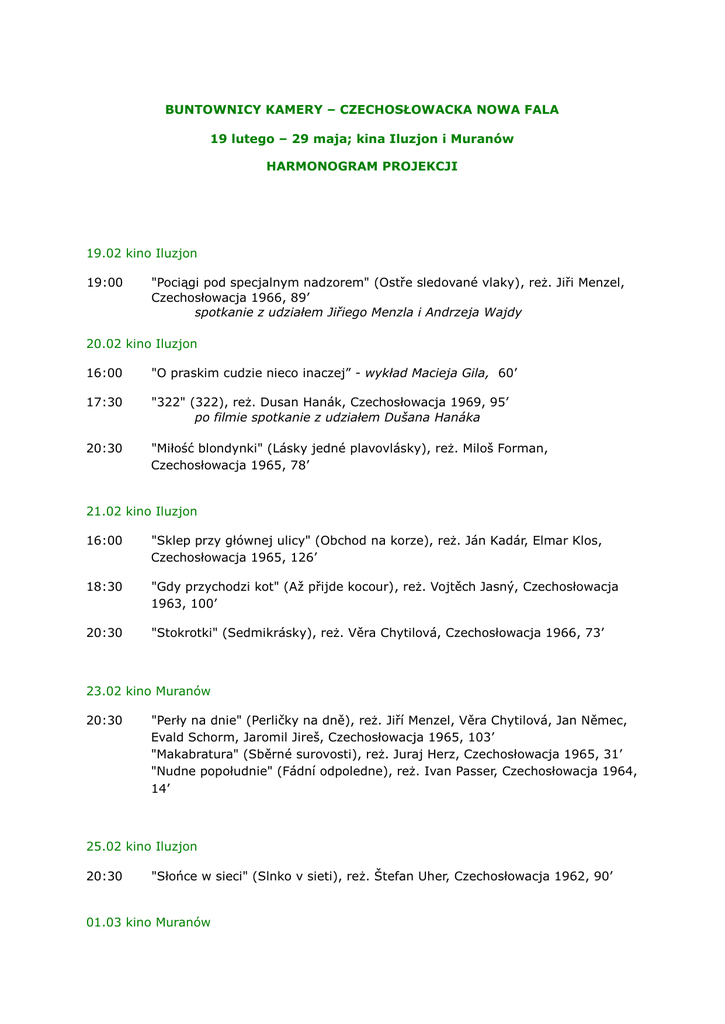 BUNTOWNICY KAMERY – CZECHOSŁOWACKA NOWA FALA 19 lutego – 29 maja; kina Iluzjon i Muranów HARMONOGRAM PROJEKCJI 19.02 kino Iluzjon 19:00 "Pociągi pod specjalnym nadzorem" (Ostře sledované vlaky), reż. Jiři Menzel, Czechosłowacja 1966, 89’ spotkanie z udziałem Jiřiego Menzla i Andrzeja Wajdy 20.02 kino Iluzjon 16:00 "O praskim cudzie nieco inaczej” - wykład Macieja Gila, 60’ 17:30 "322" (322), reż. Dusan Hanák, Czechosłowacja 1969, 95’ po filmie spotkanie z udziałem Dušana Hanáka 20:30 "Miłość blondynki" (Lásky jedné plavovlásky), reż. Miloš Forman, Czechosłowacja 1965, 78’ 21.02 kino Iluzjon 16:00 "Sklep przy głównej ulicy" (Obchod na korze), reż. Ján Kadár, Elmar Klos, Czechosłowacja 1965, 126’ 18:30 "Gdy przychodzi kot" (Až přijde kocour), reż. Vojtěch Jasný, Czechosłowacja 1963, 100’ 20:30 "Stokrotki" (Sedmikrásky), reż. Věra Chytilová, Czechosłowacja 1966, 73’ 23.02 kino Muranów 20:30 "Perły na dnie" (Perličky na dně), reż. Jiří Menzel, Věra Chytilová, Jan Němec, Evald Schorm, Jaromil Jireš, Czechosłowacja 1965, 103’ "Makabratura" (Sběrné surovosti), reż. Juraj Herz, Czechosłowacja 1965, 31’ "Nudne popołudnie" (Fádní odpoledne), reż. Ivan Passer, Czechosłowacja 1964, 14’ 25.02 kino Iluzjon 20:30 "Słońce w sieci" (Slnko v sieti), reż. Štefan Uher, Czechosłowacja 1962, 90’ 01.03 kino Muranów 20:30 "Ucho" (Ucho), reż. Karel Kachyňa, Czechosłowacja 1970, 92’ 03.03 kino Iluzjon 20:30 "Bokser i śmierć" (Boxer a smrt'), reż. Peter Solan, Czechosłowacja 1972, 103’ 08.03 kino Muranów 20:30 "Waleria i tydzień cudów" (Valerie a týden divů), reż. Jaromil Jireš, Czechosłowacja 1970, 74’ 10.03 kino Iluzjon 20:30 "Ja, Julinka i koniec wojny" (Ať žije republika), reż. Karel Kachyňa, Czechosłowacja 1965, 128’ 15.03 kino Muranów 20:30 "Czarny Piotruś" (Černý Petr), reż. Miloš Forman, Czechosłowacja 1964, 85’ 17.03 kino Iluzjon 20:30 "Najpiękniejszy wiek" (Nejkrásnější věk), reż. Jaroslav Papoušek, Czechosłowacja 1968, 75’ 22.03 kino Muranów 20:30 "Dzień siódmy, ósma noc" (Den sedmý, osmá noc), reż. Evald Schorm, Czechosłowacja 1969, 100’ "Ogród" (Zahrada), reż. Jan Švankmajer, Czechosłowacja 1968, 16’ 24.03 kino Iluzjon 20:30 "Nikt się śmiać nie będzie" (Nikdo se nebude smát), reż. Hynek Bočan, Czechosłowacja 1965, 94’ 29.03 kino Muranów 20:30 "Dzień nasz codzienny” (Deň náš každodenný), reż. Otakar Krivánek, Czechosłowacja 1969, 89’ 31.03 kino Iluzjon 20:30 "Transport z raju" (Transport z ráje), reż. Zbyněk Brynych, Czechosłowacja 1962, 92’ 05.04 kino Muranów 20:30 "Przypadek dla początkującego kata" (Případ pro začínajícího kata), reż. Pavel Juráček, Czechosłowacja 1969, 102’ "Kilian zawsze wraca" (Postava k podpírání), reż. Pavel Juráček, Jan Schmidt, Czechosłowacja 1963, 37’ 07.04 kino Iluzjon 20:30 "Powrót syna marnotrawnego" (Návrat ztraceného syna), reż. Evald Schorm, Czechosłowacja 1966, 99’ 12.04 kino Muranów 20:30 "Dialog 20-24-60" (Dialóg 20-24-60), Peter Solan, Zbyněk Brynych, Jerzy Skolimowski, Czechosłowacja 1968, 78’ 14.04 kino Iluzjon 20:30 "Piąty jeździec Apokalipsy" (… a páty jezdec je Strach), reż. Zbyněk Brynych, Czechosłowacja 1964, 95’ 19.04 kino Muranów 20:30 "Chrystusowe lata" (Kristove roky), reż. Juraj Jakubisko, Czechosłowacja 1967, 95’ 20.04 kino Iluzjon 20:30 "Hotel dla cudzoziemców" (Hotel pro cizince), reż. Antonín Máša, Czechosłowacja 1966, 103’ 26.04 kino Muranów 20:30 "Pierwszy krzyk" (Křik), reż. Jaromil Jireš, Czechosłowacja 1963, 78’ 28.04 kino Iluzjon 20:30 "Lampy naftowe" (Petrolejové lampy), reż. Juraj Herz, Czechosłowacja 1971, 100’ 05.05 kino Iluzjon 20:30 "Morgiana" (Morgiana), reż. Juraj Herz, Czechosłowacja 1972, 99’ 10.05 kino Muranów 20:30 "Męczennicy miłości" (Mučedníci lásky), reż. Jan Němec, Czechosłowacja 1966, 60’ 12.05 kino Iluzjon 20:30 "Obrazy starego świata" (Obrazy starého sveta), reż. Dušan Hanák, Czechosłowacja 1972, 64’ "Woda i praca" (Voda a práca), reż. Martin Slivka, Czechosłowacja 1962, 10’ "Zawitał do nas Old Shatterhand" (Prišiel k nám Old Shatterhand), reż. Dušan Hanák, Czechosłowacja 1966, 12’ 17.05 kino Muranów 20:30 "Wszyscy dobrzy rodacy” (Všichni dobří rodáci), reż. Vojtěch Jasný, Czechosłowacja 1968, 116’ 19.05 kino Iluzjon 20:30 "Prywatna burza” (Soukromá vichřice), reż. Hynek Bočan, Czechosłowacja 1967, 96’ 24.05 kino Muranów 20:30 "Konkurs” (Konkurs), reż. Miloš Forman, Czechosłowacja 1963, 82’ 26.05 kino Iluzjon 20:30 "Zabita niedziela" (Zabitá neděle), reż. Drahomíra Vihanová, Czechosłowacja 1969, 78’ 27.05 kino Iluzjon 17:30 "Pali się, moja panno" (Hoří, má panenko!), reż. Miloš Forman, Czechosłowacja 1967, 70’ 19:30 "Ptaszki, sieroty i głupcy" (Vtáčkovia, siroty a blázni), reż. Juraj Jakubisko, Czechosłowacja 1969, 78’ po filmie spotkanie z udziałem gościa: Magdy Vášáryovej 28.05 kino Iluzjon 16:00 "Gdy skończy się ta noc" (Kým sa skončí táto noc), reż. Peter Solan, Czechosłowacja 1965, 91’ 18:00 "Palacz zwłok" (Spalovač mrtvol), reż. Juraj Herz, Czechosłowacja 1968, 96’ 20:30 "Straszne skutki awarii telewizora" (Ecce Homo Homolka), reż. Jaroslav Papoušek, Czechosłowacja 1969, 80’ 29.05 kino Iluzjon 16:00 "Uroczystość w ogrodzie botanicznym" (Slávnost v botanickej záhrade), reż. Elo Havetta, Czechosłowacja 1969, 95’ 18:00 "Intymne oświetlenie" (Intimní osvětlení), reż. Ivan Passer, Czechosłowacja 1965, 70’ 20:30 "Skowronki na uwięzi" (Skřivánci na niti), reż. Jiří Menzel, Czechosłowacja 1969, 91’ Większość projekcji poprzedzą prelekcje filmoznawców Bilety: w cenie 15 zł do nabycia w kasach kin oraz on-line (brak możliwości nabycia karnetów) Kino Iluzjon – Muzeum Sztuki Filmowej ul. Narbutta 50a tel: 22 848 33 33;