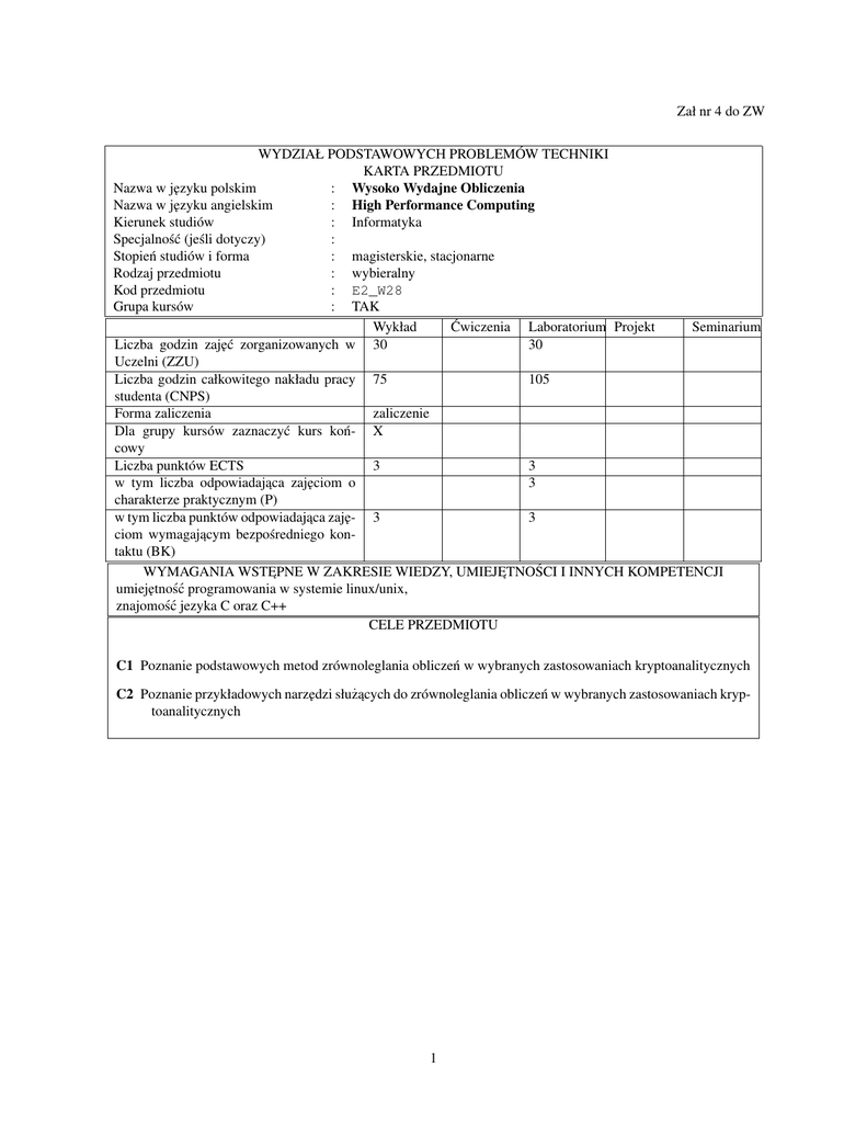 Zał nr 4 do ZW WYDZIAŁ PODSTAWOWYCH PROBLEMÓW TECHNIKI KARTA PRZEDMIOTU Nazwa w j˛ezyku polskim : Wysoko Wydajne Obliczenia Nazwa w j˛ezyku angielskim : High Performance Computing Kierunek studiów : Informatyka Specjalność (jeśli dotyczy) : Stopień studiów i forma : magisterskie, stacjonarne Rodzaj przedmiotu : wybieralny Kod przedmiotu : E2_W28 Grupa kursów : TAK Ćwiczenia Laboratorium Projekt Wykład Seminarium Liczba godzin zaj˛eć zorganizowanych w 30 30 Uczelni (ZZU) Liczba godzin całkowitego nakładu pracy 75 105 studenta (CNPS) Forma zaliczenia zaliczenie Dla grupy kursów zaznaczyć kurs koń- X cowy Liczba punktów ECTS 3 3 w tym liczba odpowiadajaca ˛ zaj˛eciom o 3 charakterze praktycznym (P) w tym liczba punktów odpowiadajaca ˛ zaj˛e- 3 3 ciom wymagajacym ˛ bezpośredniego kontaktu (BK) WYMAGANIA WSTEPNE ˛ W ZAKRESIE WIEDZY, UMIEJETNO ˛ ŚCI I INNYCH KOMPETENCJI umiej˛etność programowania w systemie linux/unix, znajomość jezyka C oraz C++ CELE PRZEDMIOTU C1 Poznanie podstawowych metod zrównoleglania obliczeń w wybranych zastosowaniach kryptoanalitycznych C2 Poznanie przykładowych narz˛edzi służacych ˛ do zrównoleglania obliczeń w wybranych zastosowaniach kryptoanalitycznych 1 PRZEDMIOTOWE EFEKTY KSZTAŁCENIA Z zakresu wiedzy studenta: W1 Zna główne ograniczenia prezentowanych na wykładzie metod kryptoanalitycznych W2 Zna metody zrównoleglania obliczeń właściwe dla klastra obliczeniowego W3 Zna techniki rozwoju oprogramowania właściwe dla środowiska równoległego Z zakresu umiej˛etności studenta: U1 Potrafi dobrać parametry ataku tak by zoptymalizować wysiłek obliczeniowy dla posiadanych zasobów U2 Potrafi dostrzec sposoby poprawienia efektywności własnej implementacji (zakładajac ˛ np. parametrów systemu) zmian˛e U3 Potrafi uzasadnić trafność wyboru rozwiazań ˛ implementacyjnych powołujac si˛e na odpowiednie źródła Z zakresu kompetencji społecznych studenta: K1 Rozumie potrzeb˛e zakładania dodatkowego marginesu bezpieczeństwa w doborze parametrów systemu kryptograficznego K2 Dostrzega możliwości wykorzystania nabytych umiej˛etności w innych obszarach TREŚCI PROGRAMOWE Wy1 Wy2 Wy3 Wy4 Wy5 Wy6 Wy7 Wy8 Wy9 Wy10 Wy11 Wy12 Lab1 Lab2 Lab3 Lab4 Lab5 Lab6 Lab7 Lab8 Forma zaj˛eć - wykłady Rozproszony system obliczeniowy - możliwe architektury Klaster obliczeniowy - narz˛edzia administracyjne i biblioteki programistyczne Metoda indeksu obliczania logarytmu dyskretnego w grupie multyplikatywnej ciała skończonego Metoda rho-Pollarda znajdowania logartmu dyskretnego w dowolnej grupie cyklicznej ograniczonego rz˛edu Zrównoleglenie metody rho-Pollarda Zastosowanie metody rho-Pollarda w algorytmie Pohliga-Hellmana Metoda kangurów obliczania logarytmu dyskretnego dla wykładnika z zadanego przedziału Zrównoleglenie metody kangurów Metoda Lenstry faktoryzacji T˛eczowe tablice Metoda sita kwadratowego i sita ciał liczbowych Dedykowane urzadzenia ˛ przyspieszajace ˛ sito ciał liczbowych Forma zaj˛eć - laboratorium Poznanie środowiska programistycznego dla klastra obliczeniowego Wykorzystanie bibliotek MPI i NTL w prostych zadaniach obliczeniowych Zaimplmentowanie równoległej wersji medody obliczania indeksu Zaimplementowanie metody rho-Pollarda w wersji równoległej Zaimplementowanie metody Pohliga-Hellmana w oparciu o metod˛e Pollarda Zaimplementowanie metody Lenstry faktoryzacji Zaimplementowanie ataku z wykorzystaniem t˛eczowych tablic Podsumowanie zaj˛eć laboratoryjnych 2 1h 2h 2h 2h 3h 3h 2h 2h 2h 2h 5h 4h 2h 2h 6h 4h 6h 4h 4h 2h STOSOWANE NARZEDZIA ˛ DYDAKTYCZNE 1. Wykład tradycyjny 2. Rozwiazywanie ˛ zadań i problemów 3. Rozwiazywanie ˛ zadań programistycznych 4. Konsultacje 5. Praca własna studentów OCENA OSIAGNI ˛ ECIA ˛ PRZEDMIOTOWYCH EFEKTÓW KSZTAŁCENIA Oceny F1 F2 Numer efektu kształcenia W1-W3, K1-K2 U1-U3, K1-K2 Sposób oceny efektu kształcenia Egzamin na końcu semestru Ocena implementacji zadanych algorytmów równoległych P=40%*F1+60%*F2 LITERATURA PODSTAWOWA I UZUPEŁNIAJACA ˛ 1. William Gropp, Ewing Lusk, Rajeev Thakur, Using MPI-2: Advanced Features of the Message-Passing Interface, MIT Press, 1999 2. Paul C. van Oorschot, Michael J. Wiener: Parallel Collision Search with Cryptanalytic Applications. J. Cryptology 12(1): 1-28 (1999) 3. Tim Güneysu, Andy Rupp, Stefan Spitz, Cryptanalytic Time-Memory Tradeoffs on COPACOBANA, GI Jahrestagung 2, Vol. 110GI (2007) , p. 205-209 4. Matthew E. Briggs, An Introduction to the General Number Field Sieve, Masterthesis, 1998 OPIEKUN PRZEDMIOTU dr Przemysław Kubiak 3 MACIERZ POWIAZANIA ˛ EFEKTÓW KSZTAŁCENIA DLA PRZEDMIOTU Wysoko Wydajne Obliczenia Z EFEKTAMI KSZTAŁCENIA NA KIERUNKU INFORMATYKA Przedmiotowy Odniesienie przedmiotowego efektu do Cele przed- Treści proefekt ksz- efektów kształcenia zdefiniowanych dla miotu** gramowe** tałcenia kierunku studiów i specjalności (o ile dotyczy) W1 K2_W02 C1 Wy1-Wy12 W2 K2_W01 C1 Wy1-Wy12 W3 K2_W09 C1 Wy1-Wy12 U1 K2_U08 K2_U10 K2_U14 C1 Lab1-Lab8 U2 K2_U18 K2_U19 K2_U21 C1 Lab1-Lab8 U3 K2_U01 K2_U07 K2_U16 C1 Lab1-Lab8 K1 K2_K12 C1 C2 Wy1-Wy12 Lab1-Lab8 K2 K2_K01 K2_K12 K2_K13 C1 C2 Wy1-Wy12 Lab1-Lab8 4 Numer narz˛edzia dydaktycznego** 145 145 145 2345 2345 2345 12345 12345