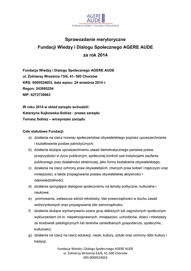 Sprawozdanie merytoryczne Fundacji Wiedzy i Dialogu Społecznego AGERE AUDE za rok 2014 Fundacja Wiedzy i Dialogu Społecznego AGERE AUDE ul. Żołnierzy Września 73/6, 41- 500 Chorzów KRS: 0000524653, data wpisu: 24 września 2014 r. Regon: 243685254 NIP: 6272739863 W roku 2014 w skład zarządu wchodzili: Katarzyna Sujkowska-Sobisz - prezes zarządu Tomasz Sobisz – wiceprezes zarządu Cele statutowe Fundacji: a) działania na rzecz rozwoju społeczeństwa obywatelskiego poprzez upowszechnianie i kształtowanie postaw patriotycznych; b) działania służące upowszechnieniu zasad demokratycznego państwa prawa, przejrzystości w życiu publicznym, społecznej kontroli nad instytucjami zaufania publicznego oraz działalności strażniczej, jako formy kształcenia obywatelskiego; c) działania na rzecz ochrony praw obywatelskich, równych praw kobiet i mężczyzn oraz mniejszości, a także propagowania postaw obywatelskiej aktywności i odpowiedzialności; d) działania sprzyjające dialogowi społecznemu na tematy polityczne, kulturalne i naukowe; e) promowania, zwłaszcza wśród młodzieży, idei praworządności w duchu zasad wolnorynkowych oraz propagowania idei samorządności; f) działania służące wyrównywaniu szans grup słabszych lub zagrożonych społecznym wykluczeniem (m.in. niepełnosprawnych, mniejszości, uchodźców, dzieci i młodzieży ze środowisk patologicznych lub terenów zaniedbanych gospodarczo, społecznie, kulturowo); g) działania na rzecz na rzecz edukacji, nauki, kultury, sztuki oraz ochrony dóbr kultury i tradycji; Fundacja Wiedzy i Dialogu Społecznego AGERE AUDE ul. Żołnierzy Września 63/6, 41-500 Chorzów KRS 0000524653 h) działalność proekologiczna oraz promocja i ochrona dziedzictwa przyrodniczego; i) działania na rzecz promocji nauki, kultury, sztuki oraz zdrowia; j) udzielanie wsparcia materialnego inicjatywom zgodnym z celami fundacji. Fundacja Wiedzy i Dialogu Społecznego AGERE AUDE jest młodą organizacją pozarządową, której głównymi celami są: wzmacnianie demokracji i postaw obywatelskich, propagowanie transparentności w życiu publicznym, wyrównywanie szans grup słabszych i zagrożonym wykluczeniem społecznym oraz działanie na rzecz nauki, edukacji i ochrony dziedzictwa narodowego. Cele te Fundacja chce realizować poprzez inicjowanie i uczestniczenie w przedsięwzięciach angażujących społeczność lokalną oraz integrujących przedstawicieli różnych warstw społecznych. Fundacja Agere Aude powstała we wrześniu 2014 r., składa się z osób zaangażowanych w życie społeczności lokalnych oraz z dużym doświadczeniem w pracy w organizacjach pozarządowych, m.in. w: Śląskim Towarzystwie Marketingowym Stowarzyszeniu Przyjaciół Instytutu Języka Polskiego VIA LINGUE Stowarzyszeniu Przyjaciół Szkoły Podstawowej nr 15 w Chorzowie Stowarzyszeniu Nostra Patrumque Memoria Historia na Dotyk Stowarzyszeniu Twój Chorzów Towarzystwie Miłośników Języka Polskiego Fundacja nie prowadzi działalności gospodarczej i nie jest wpisana do rejestru przedsiębiorstwo Krajowego Rejestru Sądowego. Informacja o uzyskanych przychodach: W 2014 roku (od momentu powstania we wrześniu 2014 r.) Fundacja uzyskała przychód w wysokości: 50,00 zł. – darowizny osób fizycznych, 0,00 zł. – dotacje. Informacja o poniesionych kosztach: Fundacja nie prowadzi działalności gospodarczej. Wszystkie ponoszone koszty związane są z realizacją celów statutowych. Poniesione koszty na: realizację celów statutowych - 20,05 zł. w tym: koszty niekwalifikowane - 0,00 zł. Fundacja Wiedzy i Dialogu Społecznego AGERE AUDE ul. Żołnierzy Września 63/6, 41-500 Chorzów KRS 0000524653 umowy o dzieło - 0,00 zł., koszty administracyjne - 0,00 zł. w tym: usługi obce - 0,00 zł. amortyzacja - 0,00 zł. Dane o zatrudnieniu, wynagrodzeniu i sytuacji finansowej: W 2014 roku Fundacja nie zatrudniała żadnych pracowników Członkowie Zarządu nie otrzymywali wynagrodzenia z tytułu pełnionych funkcji. Fundacja nie udzieliła żadnych pożyczek pieniężnych. Fundacja AGERE AUDE posiada rachunki bankowe w ING Banku Śląskim. Stan środków ulokowanych na rachunkach bankowych na dzień 31 grudnia 2014 r. wynosił 0,00 zł. Fundacja na dzień 31 grudnia 2014 r. nie posiadała lokat bankowych. Wartość aktywów i zobowiązań Fundacji w sprawozdaniach – 0,00 zł. Fundacja nie nabyła obligacji ani nie objęła udziałów lub akcji w innych podmiotach. Fundacja nie nabyła żadnych nieruchomości. Księgowość prowadziło biuro rachunkowe Fresz Spółka z o.o. z Katowic na podstawie zawartej umowy. Dane o działalności zleconej: Fundacja AGERE AUDE nie wykonywała działalności gospodarczej. I nie wykonywała w ramach celów statutowych odpłatnych świadczeń. Informacja o przeprowadzonych w okresie sprawozdawczym kontrolach: W okresie sprawozdawczym nie była przeprowadzona w Fundacji AGERE AUDE żadna kontrola. Informacja o rozliczeniach Fundacji. Fundacja nie posiada zaległości podatkowych oraz na rzecz ubezpieczeń społecznych ZUS. W 2014 r. składała miesięczne deklaracje do ZUS za okres wrzesień – grudzień 2014 r. Zobowiązania płatnika z tytułu podatku dochodowego od osób fizycznych i składek ZUS regulowane były na bieżąco i terminowo. Katarzyna Sujkowska-Sobisz Prezes zarządu Fundacji Agere Aude Tomasz Sobisz Wiceprezes zarządu Fundacji Agere Aude Fundacja Wiedzy i Dialogu Społecznego AGERE AUDE ul. Żołnierzy Września 63/6, 41-500 Chorzów KRS 0000524653