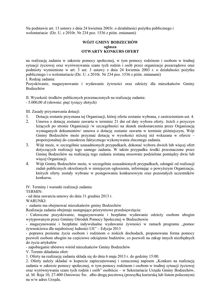 Na podstawie art. 13 ustawy z dnia 24 kwietnia 2003r. o działalności pożytku publicznego i wolontariacie (Dz. U. z 2010r. Nr 234 poz. 1536 z późn. zmianami) WÓJT GMINY BODZECHÓW ogłasza OTWARTY KONKURS OFERT na realizację zadania w zakresie pomocy społecznej, w tym pomocy rodzinom i osobom w trudnej sytuacji życiowej oraz wyrównywania szans tych rodzin i osób przez organizacje pozarządowe oraz podmioty wymienione w art. 3 ust. 3 ustawy z dnia 24 kwietnia 2003 r. o działalności pożytku publicznego i o wolontariacie (Dz. U. z 2010r. Nr 234 poz. 1536 z późn. zmianami) I. Rodzaj zadania: Pozyskiwanie, magazynowanie i wydawanie żywności oraz odzieży dla mieszkańców Gminy Bodzechów II. Wysokość środków publicznych przeznaczonych na realizację zadania: - 5.000,00 zł (słownie: pięć tysięcy złotych) III. Zasady przyznawania dotacji: 1. Dotacja zostanie przyznana tej Organizacji, której oferta zostanie wybrana, z zastrzeżeniem ust. 4. 2. Umowa o dotację zostanie zawarta w terminie 21 dni od daty wyboru oferty. Jeżeli z przyczyn leżących po stronie Organizacji /w szczególności na skutek niedostarczenia przez Organizację wymaganych dokumentów/ umowa o dotację zostanie zawarta w terminie późniejszym, Wójt Gminy Bodzechów może przyznać dotację w wysokości niższej niż wskazana w ofercie – proporcjonalnej do czasokresu faktycznego wykonywania zleconego zadania. 3. Wójt może, w szczególnie uzasadnionych przypadkach, dokonać wyboru dwóch lub więcej ofert dotyczących realizacji tego samego zadania. W takim przypadku środki przeznaczone przez Gminę Bodzechów na realizację tego zadania zostaną stosownie podzielone pomiędzy dwie lub więcej Organizacji. 4. Wójt Gminy Bodzechów może, w szczególnie uzasadnionych przypadkach, odstąpić od realizacji zadań publicznych określonych w niniejszym ogłoszeniu, informując o powyższym Organizacje, których oferty zostały wybrane w postępowaniu konkursowym oraz pozostałych uczestników konkursu. IV. Terminy i warunki realizacji zadania: TERMIN: - od dnia zawarcia umowy do dnia 31 grudnia 2013 r. WARUNKI: - zadanie ma obejmować mieszkańców gminy Bodzechów Realizacja zadania obejmuje następujące priorytetowe przedsięwzięcia: - Całoroczne pozyskiwanie, magazynowanie i bezpłatne wydawanie odzieży osobom ubogim wytypowanym przez Gminny Ośrodek Pomocy Społecznej w Bodzechowie - magazynowanie i bezpłatne indywidualne wydawanie żywności w ramach programu „pomoc żywnościowa dla najuboższej ludności UE” – Edycja 2013 - poprawa poziomu życia osobom i rodzinom o niskich dochodach, proponowana forma pomocy pozwoli osobom ubogim na częściowe odciążenie budżetów, co pozwoli na zakup innych niezbędnych do życia artykułów - zapobieganie ubóstwu wśród mieszkańców Gminy Bodzechów V. Termin składania ofert: 1. Oferty na realizację zadania składa się do dnia 6 maja 2013 r. do godziny 15:00. 2. Oferty należy składać w kopercie zapieczętowanej i oznaczonej napisem „Konkurs na realizację zadania w zakresie pomocy społecznej, w tym pomocy rodzinom i osobom w trudnej sytuacji życiowej oraz wyrównywania szans tych rodzin i osób” osobiście – w Sekretariacie Urzędu Gminy Bodzechów, ul. M. Reja 10, 27-400 Ostrowiec Św. albo drogą pocztową (przesyłką kurierską lub listem poleconym) na w/w adres Urzędu. 3. Oferty realizacji zadania publicznego składa się według wzoru określonego w załączniku nr 1 do rozporządzenia Ministra Pracy i Polityki Społecznej z dnia 15 grudnia 2010 r. w sprawie wzoru oferty i ramowego wzoru umowy dotyczących realizacji zadania publicznego oraz wzoru sprawozdania z wykonania tego zadania (Dz. U. z 2011r. Nr 6, poz. 25). 4. Do oferty należy dołączyć wymagane załączniki: - odpis aktualny z Krajowego Rejestru Sądowego lub inny dokument stanowiący o podstawie prawnej działalności organizacji (w wypadku jego braku należy dołączyć oświadczenie o przedłożeniu takowego przed podpisaniem umowy) - sprawozdanie z działalności za ostatni rok - statut organizacji w przypadku złożenia innego dokumentu stanowiącego o podstawie prawnej działania - kopie dokumentów powinny być poświadczone za zgodność z oryginałem Wnioski złożone w inny niż opisany sposób lub po terminie nie będą rozpatrywane. VI. Termin, tryb i kryteria stosowane przy dokonywaniu wyboru oferty: TERMIN: 1. Weryfikacja formalna ofert przez powołaną zarządzeniem przez Wójta komisję konkursową nastąpi w dniu 7 maja 2013 roku o godzinie 11.00 w Urzędzie Gminy Bodzechów, pok. Nr 11. 2. Informacja o wyborze ofert zostanie zamieszczona na stronach internetowych Urzędu Gminy Bodzechów, w Biuletynie Informacji Publicznej oraz na tablicy ogłoszeń w siedzibie Urzędu Gminy Bodzechów. KRYTERIA: Przy dokonywaniu wyboru oferty brane będą pod uwagę : 1) zgodność złożonej oferty z wymaganiami konkursowymi – oferty nie odpowiadające wymogom formalnym nie będą rozpatrywane przez komisję konkursową, 2) możliwość realizacji zadania przez podmiot – posiadanie odpowiednio przygotowanej kadry, środków rzeczowych, warunków lokalowych i innych, 3) rzetelność przedstawionej kalkulacji kosztów, 4) ocena dotychczasowej współpracy podmiotu z Gminą Bodzechów, (Organizacja, która nie wykonała lub nienależycie wykonała zobowiązania wynikające z umowy dotacji na dany rok, nie może otrzymać dotacji przez okres 3 kolejnych lat), 5) dotychczasowe doświadczenia podmiotu w realizacji zadań podobnego rodzaju Nie będą brane pod uwagę oferty: 1) niekompletne lub sporządzone w inny sposób niż określony w ogłoszeniu otwartego konkursu, 2) dotyczące innego zadania niż określonego w ogłoszeniu otwartego konkursu. VII. Zrealizowane przez Gminę Bodzechów w bieżącym roku i w roku poprzednim zadania publiczne tego samego rodzaju i związane z nim koszty, ze szczególnym uwzględnieniem wysokości dotacji przekaza
