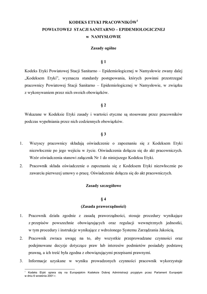 KODEKS ETYKI PRACOWNIKÓW1 POWIATOWEJ STACJI SANITARNO – EPIDEMIOLOGICZNEJ w NAMYSŁOWIE Zasady ogólne §1 Kodeks Etyki Powiatowej Stacji Sanitarno – Epidemiologicznej w Namysłowie zwany dalej „Kodeksem Etyki”, wyznacza standardy postępowania, których powinni przestrzegać pracownicy Powiatowej Stacji Sanitarno – Epidemiologicznej w Namysłowie, w związku z wykonywaniem przez nich swoich obowiązków. §2 Wskazane w Kodeksie Etyki zasady i wartości etyczne są stosowane przez pracowników podczas wypełniania przez nich codziennych obowiązków. §3 1. Wszyscy pracownicy składają oświadczenie o zapoznaniu się z Kodeksem Etyki niezwłocznie po jego wejściu w życie. Oświadczenia dołącza się do akt pracowniczych. Wzór oświadczenia stanowi załącznik Nr 1 do niniejszego Kodeksu Etyki. 2. Pracownik składa oświadczenie o zapoznaniu się z Kodeksem Etyki niezwłocznie po zawarciu pierwszej umowy o pracę. Oświadczenie dołącza się do akt pracowniczych. Zasady szczegółowe §4 (Zasada praworządności) 1. Pracownik działa zgodnie z zasadą praworządności, stosuje procedury wynikające z przepisów powszechnie obowiązujących oraz regulacji wewnętrznych jednostki, w tym procedury i instrukcje wynikające z wdrożonego Systemu Zarządzania Jakością. 2. Pracownik zwraca uwagę na to, aby wszystkie przeprowadzane czynności oraz podejmowane decyzje dotyczące praw lub interesów podmiotów posiadały podstawę prawną, a ich treść była zgodna z obowiązującymi przepisami prawnymi. 3. Informacje uzyskane w wyniku prowadzonych czynności pracownik wykorzystuje 1 Kodeks Etyki opiera się na Europejskim Kodeksie Dobrej Administracji przyjętym przez Parlament Europejski w dniu 6 września 2001 r. wyłącznie do celów służbowych, z zachowaniem przestrzegania poufności uzyskanych informacji. § 5 (Zasada niedyskryminowania) 1. Przy przeprowadzaniu kontroli sanitarnych, rozpatrywaniu wniosków oraz przy wykonywaniu innych czynności i podejmowaniu decyzji pracownik zapewnia przestrzeganie zasady równego traktowania. Pojedyncze osoby fizyczne i prawne znajdujące się w takiej samej sytuacji są traktowane w porównywalny sposób. 2. W przypadku różnic w traktowaniu Stron postępowania pracownik zapewnia, aby to nierówne traktowanie było usprawiedliwione obiektywnymi, istotnymi właściwościami danej sprawy, m. in. występowaniem zagrożenia dla zdrowia publicznego. 3. Pracownik powinien powstrzymać się od wszelkiego nieusprawiedliwionego i nierównego traktowania pojedynczych osób fizycznych ze względu na ich narodowość, płeć, rasę, kolor skóry, pochodzenie etniczne lub społeczne, cechy genetyczne, język, religię lub wyznanie, przekonania polityczne lub inne przekonania, przynależność do mniejszości narodowej, posiadaną własność, urodzenie, inwalidztwo, wiek lub preferencje seksualne. §6 (Zasada współmierności) 1. W toku podejmowania decyzji oraz innych czynności pracownik zapewnia, że przyjęte działania są współmierne do obranego celu, stopnia trudności wykonywanego zadania. 2. Pracownik unika ograniczania praw obywateli bądź osób prawnych lub nakładania na nich obciążeń, jeżeli ograniczenia te lub obciążenia byłyby niewspółmierne do celu prowadzonych działań. 3. W toku podejmowania decyzji pracownik zwraca uwagę na stosowne wyważenie spraw osób prywatnych i ogólnego interesu publicznego. §7 (Zakaz nadużywania uprawnień) 1. Z posiadanych uprawnień pracownik może korzystać wyłącznie dla osiągnięcia celów, dla których uprawnienia te zostały mu powierzone. 2. Pracownik nie powinien korzystać z uprawnień dla osiągnięcia celów, dla których brak jest podstawy prawnej lub które nie mogą być uzasadnione interesem publicznym. §8 (Zasada bezstronności i niezależności) 1. Pracownik działa bezstronnie, niezależnie i powstrzymuje się od wszelkich arbitralnych działań, które mogą mieć negatywny wpływ na sytuację pojedynczych osób, oraz od wszelkich form faworyzowania, bez względu na motywy takiego postępowania. 2. Na postępowanie pracowników nie może mieć wpływu interes osobisty lub rodzinny ani też presja polityczna. Pracownik nie może uczestniczyć w podejmowaniu decyzji, w której on lub bliski członek jego rodziny miałby jakikolwiek interes finansowy. 3. Zasady wyłączania się pracownika z postępowań, w których zachodzi konflikt interesów, określają odrębne przepisy zawarte w KPA. §9 (Zasada obiektywizmu) 1. W toku podejmowania decyzji oraz innych czynności w czasie prowadzonego postępowania pracownik uwzględnia wszystkie istotne czynniki i przypisuje każdemu z nich należne mu znaczenie, nie uwzględnia okoliczności niezwiązanych z daną sprawą. 2. Pracownik wykonuje zadania sumiennie i sprawnie, wykorzystując w pełni posiadaną wiedzę i doświadczenie. Swoje decyzje i ustalenia opiera na ustalonej prawdzie obiektywnej. § 10 (Zasada uczciwości) Pracownik działa bezstronnie, uczciwie i rozsądnie. § 11 (Zasada uprzejmości) 1. W swoich kontaktach z petentami, instytucjami oraz współpracownikami pracownik zachowuje się właściwie i uprzejmie. Pracownik stara się być możliwie jak najbardziej pomocny i udziela odpowiedzi na skierowane do niego pytania możliwie jak najbardziej wyczerpująco i dokładnie. 2. Jeżeli pracownik nie jest właściwy w danej sprawie, kieruje ją do pracownika właściwego. 3. W przypadku popełnienia błędu naruszającego prawa lub interes pojedynczej osoby pracownik stara się skorygować negatywne skutki popełnionego przez siebie błędu w jak najwłaściwszy sposób. § 12 (Zasada współodpowiedzialności) 1. Pracownik nie boi się podejmowania decyzji oraz wynikających z nich konsekwencji. 2. Relacje służbowe opierają się na współpracy, koleżeństwie, wzajemnym szacunku, pomocy oraz dzieleniu się doświadczeniem i wiedzą. 3. Pracownik godnie zachowuje się w miejscu pracy i poza nim, a swoj