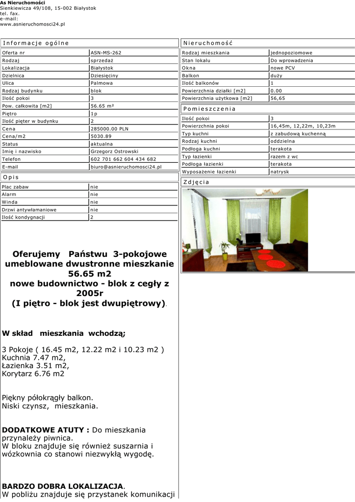 As Nieruchomości Sienkiewicza 49/108, 15-002 Białystok tel. fax. e-mail: www.asnieruchomosci24.pl Informacje ogólne Nieruchomość Oferta nr ASN-MS-262 Rodzaj mieszkania jednopoziomowe Rodzaj sprzedaż Stan lokalu Do wprowadzenia Lokalizacja Białystok Okna nowe PCV Dzielnica Dziesięciny Balkon duży Ulica Palmowa Ilość balkonów 1 Rodzaj budynku blok Powierzchnia działki [m2] 0.00 Ilość pokoi 3 Powierzchnia użytkowa [m2] 56,65 Pow. całkowita [m2] 56.65 m² Piętro 1p Ilość pięter w budynku 2 Cena Cena/m2 285000.00 PLN 5030.89 Status aktualna Imię i nazwisko Grzegorz Ostrowski Telefon E-mail 602 701 662 604 434 682 [email protected] Opis Plac zabaw nie Alarm nie Winda nie Drzwi antywłamaniowe nie Ilość kondygnacji 2 Oferujemy Państwu 3-pokojowe umeblowane dwustronne mieszkanie 56.65 m2 nowe budownictwo - blok z cegły z 2005r (I piętro - blok jest dwupiętrowy). W skład mieszkania wchodzą; 3 Pokoje ( 16.45 m2, 12.22 m2 i 10.23 m2 ) Kuchnia 7.47 m2, Łazienka 3.51 m2, Korytarz 6.76 m2 Piękny półokrągły balkon. Niski czynsz, mieszkania. DODATKOWE ATUTY : Do mieszkania przynależy piwnica. W bloku znajduje się również suszarnia i wózkownia co stanowi niezwykłą wygodę. BARDZO DOBRA LOKALIZACJA. W pobliżu znajduje się przystanek komunikacji Pomieszczenia Ilość pokoi 3 Powierzchnia pokoi 16,45m, 12,22m, 10,23m Typ kuchni z zabudową kuchenną Rodzaj kuchni oddzielna Podłoga kuchni terakota Typ łazienki razem z wc Podłoga łazienki terakota Wyposażenie łazienki natrysk Zdjęcia miejskiej oraz żłobki, przedszkola, szkoły, poczta, sklepy, boiska, place zabaw, kluby, siłownia, fitness etc. Serdecznie zapraszamy na prezentację © Wszelkie prawa zastrzeżone - As Nieruchomości