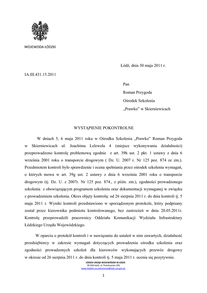 WOJEWODA ŁÓDZKI Wojewoda Łódzki Łódź, dnia 30 maja 2011 r. IA.III.431.15.2011 Pan Roman Przygoda Ośrodek Szkolenia „Prawko” w Skierniewicach WYSTĄPIENIE POKONTROLNE W dniach 5, 6 maja 2011 roku w Ośrodku Szkolenia „Prawko” Roman Przygoda w Skierniewicach ul. Joachima Lelewela 4 (miejsce wykonywania działalności) przeprowadzono kontrolę problemową zgodnie z art. 39h ust. 2 pkt. 1 ustawy z dnia 6 września 2001 roku o transporcie drogowym ( Dz. U. 2007 r. Nr 125 poz. 874 ze zm.). Przedmiotem kontroli było sprawdzenie i ocena spełniania przez ośrodek szkolenia wymagań, o których mowa w art. 39g ust. 2 ustawy z dnia 6 września 2001 roku o transporcie drogowym (tj. Dz. U. z 2007r. Nr 125 poz. 874., z późn. zm.), zgodności prowadzonego szkolenia z obowiązującym programem szkolenia oraz dokumentacji wymaganej w związku z prowadzeniem szkolenia. Okres objęty kontrolą: od 26 sierpnia 2011 r. do dnia kontroli tj. 5 maja 2011 r. Wyniki kontroli przedstawiono w sporządzonym protokole, który podpisany został przez kierownika podmiotu kontrolowanego, bez zastrzeżeń w dniu 20.05.2011r. Kontrolę przeprowadzili pracownicy Oddziału Komunikacji Wydziału Infrastruktury Łódzkiego Urzędu Wojewódzkiego. W oparciu o protokół kontroli i w nawiązaniu do ustaleń w nim zawartych, działalność przedsiębiorcy w zakresie wymagań dotyczących prowadzenia ośrodka szkolenia oraz zgodności prowadzonych szkoleń dla kierowców wykonujących przewóz drogowy w okresie od 26 sierpnia 2011 r. do dnia kontroli tj. 5 maja 2011 r. ocenia się pozytywnie. ŁÓDZKI URZĄD WOJEWÓDZKI W ŁODZI 90‐926 Łódź, ul. Piotrkowska 104, www.lodzkie.eu;[email protected]. 1 Kontrolowany spełnia wymagania, określone dla przedsiębiorcy prowadzącego ośrodek szkolenia kierowców określone przepisami ustawy z dnia 20 czerwca 1997 r. – Prawo o ruchu drogowym (Dz. U. z 2005 r. Nr 108 poz. 908 z póź. zm.). Ośrodek uzyskał wpis do rejestru przedsiębiorców prowadzących ośrodki szkolenia kierowców pod numerem 11 wydany przez Prezydenta Miasta Skierniewic w zakresie prawa jazdy kategorii: A, A1, B, B+E, C, C+E, D. Przedsiębiorca zapewnia prowadzenie szkolenia zgodnie z programem szkolenia przez wykładowcę posiadającego odpowiednią wiedzę, umiejętności i wykształcenie – w zakresie zajęć teoretycznych, oraz osoby posiadające odpowiednie do prowadzonego szkolenia uprawnienia instruktora nauki jazdy praktycznych. Ośrodek posiada umowę udostępnienia w zakresie zajęć urządzenia technicznego do symulowania jazdy w warunkach specjalnych, o którym mowa w art. 39g ust. 11 pkt. 2 w ustawie z dnia 6 września 2001r. o transporcie drogowym Umowa zawarta pomiędzy Romanem Przygodą kierownikiem Ośrodka Szkolenia „Prawko” a Andrzejem Palką prowadzącym działalność gospodarczą pod nazwą Centrum Edukacji Zawodowej CARGO z siedzibą w Jaworznie. Umowa zawarta 27 marca 2010 roku w Jaworznie na czas nieoznaczony. Certyfikat zgodności nr 002/011/RM/2009 z terminem ważności do 27 września 2012 roku. Z przedstawionej dokumentacji wynika, że ośrodek posiada umowy wykonania usługi szkoleniowej z zakresu jazdy w warunkach drogowych z wykorzystaniem samochodu ciężarowego i autobusu. Umowy zawarte 13 sierpnia 2010 roku w Jaworznie pomiędzy Andrzejem Palką prowadzącym działalność gospodarczą pod nazwą Centrum Edukacji zawodowej CARGO a Romanem Przygodą kierownikiem ośrodka szkolenia „Prawko” w Skierniewicach. Pojazdy używane do jazdy w warunkach drogowych to samochód ciężarowy marki MAN TGL 12.250 i autobus Autosan MAN RHC 404. Przedmiotowe pojazdy wyposażone są w wymagane systemy: - system przeciwdziałający blokowaniu kół przy hamowaniu, - system kontroli trakcji, - system stabilizacji toru. W ośrodku zajęcia teoretyczne prowadzi się jako wykład lub ćwiczenia pod nadzorem trenera – wykładowcy, przy użyciu komputera i specjalistycznego oprogramowania. Zakres tematyczny i czas trwania bloków programowych dotyczących kwalifikacji wstępnej, wstępnej przyspieszonej, oraz szkoleń okresowych zgodny z rozporządzeniem w sprawie szkolenia kierowców wykonujących transport drogowy. Realizacja programu szkolenia w ramach kwalifikacji wstępnej i kwalifikacji wstępnej przyspieszonej z zakresu zajęć ŁÓDZKI URZĄD WOJEWÓDZKI W ŁODZI 90‐926 Łódź, ul. Piotrkowska 104, www.lodzkie.eu;[email protected]. 2 teoretycznych zgodna z rozporządzeniem w sprawie szkolenia kierowców wykonujących przewóz drogowy. Zajęcia praktyczne w ruchu drogowym realizowane zgodnie z programem. Zajęcia praktyczne z jazdy w warunkach specjalnych realizowane na urządzeniu, o którym mowa w art. 39g ust. 11 pkt. 2. ustawy o transporcie drogowym. W ośrodku szkolenia prowadzone są szkolenia w formie kursu okresowego trwającego 35 godzin (§ 9 rozporządzenia w sprawie szkolenia kierowców wykonujących przewóz drogowy) . Szkolenia zgodne z programem określonym w załączniku do rozporządzenia w sprawie szkolenia kierowców wykonujących przewóz drogowy. Szkolenie prowadzone jest metodą e-learningową. Szkoleń w formie cyklu zajęć ośrodek do dnia kontroli nie przeprowadził. Świadectwa kwalifikacji zawodowej wydawane przez kierownika ośrodka po odbyciu szkolenia okresowego zgodne z rozporządzeniem w sprawie szkolenia kierowców wykonujących przewóz drogowy .W ośrodku szkolenia prowadzony jest dla każdego kursu kwalifikacyjnego lub kursu okresowego dziennik zajęć teoretycznych i karta zajęć praktycznych. Dzienniki zawierają rubryki zgodne z rozporządzeniem w sprawie szkolenia kierowców wykonujących przewóz drogowy. Kontrolujący ustalili, że kierownik ośrodka szkolenia zgodnie z art.39e ust 1 ustawy z dnia 6 września 2001r. o transporcie drogowym wydaje osobie, która ukończyła wymagane zajęcia w ramach szkolenia okresowego, świadectwo kwalifikacji zawodowej potwierdzające ukończenie szkolenia okresowego. Kierownik ośr