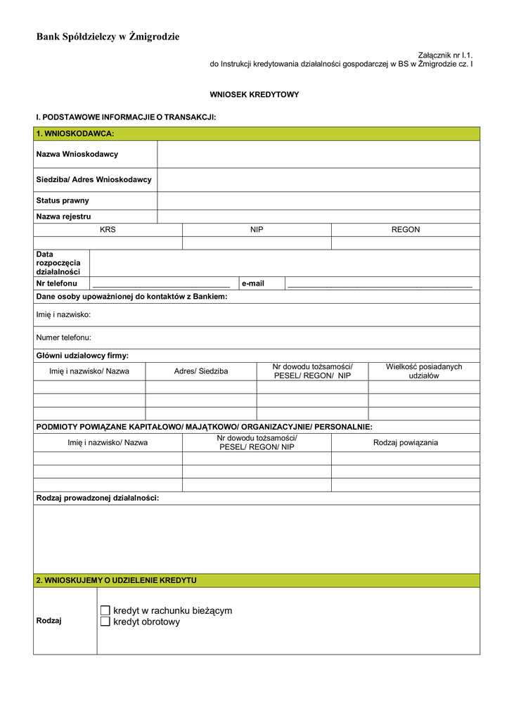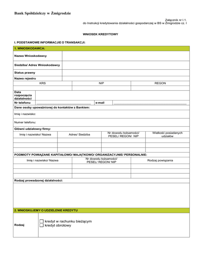 Bank Spółdzielczy w Żmigrodzie Załącznik nr I.1. do Instrukcji kredytowania działalności gospodarczej w BS w Żmigrodzie cz. I WNIOSEK KREDYTOWY I. PODSTAWOWE INFORMACJIE O TRANSAKCJI: 1. WNIOSKODAWCA: Nazwa Wnioskodawcy Siedziba/ Adres Wnioskodawcy Status prawny Nazwa rejestru KRS Data rozpoczęcia działalności Nr telefonu NIP ________________________________ e-mail REGON ___________________________________________ Dane osoby upoważnionej do kontaktów z Bankiem: Imię i nazwisko: Numer telefonu: Główni udziałowcy firmy: Imię i nazwisko/ Nazwa Adres/ Siedziba Nr dowodu tożsamości/ PESEL/ REGON/ NIP Wielkość posiadanych udziałów PODMIOTY POWIĄZANE KAPITAŁOWO/ MAJĄTKOWO/ ORGANIZACYJNIE/ PERSONALNIE: Nr dowodu tożsamości/ Imię i nazwisko/ Nazwa Rodzaj powiązania PESEL/ REGON/ NIP Rodzaj prowadzonej działalności: 2. WNIOSKUJEMY O UDZIELENIE KREDYTU Rodzaj kredyt w rachunku bieżącym kredyt obrotowy Kwota Waluta PLN Słownie Okres kredytowania od ______________________________ do _____________________________ Karencja* _____________________ miesięcy /dzień/miesiąc/rok/ /dzień/miesiąc/rok/ Przeznaczenie kredytu Całkowity koszt przedsięwzięcia: w walucie inwestycji ________________________________________________________________________________________ w PLN ________________________________________________________________________________________ (kwota i waluta) ( wg kursu średniego NBP z ostatniego dnia miesiąca poprzedzającego złożenie wniosku) Dotychczas poniesione nakłady Krótka charakterystyka przedsięwzięcia: (np. cykl realizacji, termin rozpoczęcia i zakończenia, rodzaje zakupów, itp.) TERMIN ROZPOCZĘCIA INWESTYCJI (MIESIĄC/ ROK) TERMIN ZAKOŃCZENIA INWESTYCJI (MIESIĄC/ ROK) TERMIN ODDANIA DO EKSPLOATACJI (MIESIĄC/ROK) TERMIN OSIĄGNIĘCIA PLANOWANEJ ZDOLNOŚCI PRODUKCYJNEJ (MIESIĄC/ ROK) Środki własne: Kredyty bankowe Pozostałe środki Strona 2 z 5 3. TERMINY URUCHOMIENIA ORAZ TRANSZE KREDYTU: w dniu/od dnia* kwota w dniu/od dnia* kwota w dniu/od dnia* kwota w dniu/od dnia* kwota w dniu/od dnia* kwota 4. SPŁATA KREDYTU: Okres spłaty Spłata kredytu następować będzie z od ______________________________ do _____________________________ /dzień/miesiąc/rok/ /dzień/miesiąc/rok/ rachunku bieżącego rachunku pomocnicze płatność przelewem lub gotówkową na rachunek kredytu Terminy spłaty: 1. w dniu/od dnia* do kwoty 2. w dniu/od dnia* do kwoty 3. w dniu/od dnia* do kwoty 4. w dniu/od dnia* do kwoty 5. w dniu/od dnia* do kwoty 6. w dniu/od dnia* do kwoty 5. SPŁATA ODSETEK: Termin spłaty ___________________________________________________________ 6. PROPONOWANE ZABEZPIECZENIE: Rodzaj zabezpieczenia Właściciel przedmiotu zabezpieczenia Wartość zabezpieczenia Oszacowanie wartości na podstawie: (polisa, wycena, faktura) II. Oświadczenia 1) Oświadczam/y, że posiadamy/ nie posiadamy* zaległości wobec Zakładu Ubezpieczeń Społecznych i Urzędu Skarbowego objętych/ nie objętych ugodą*. 2) Oświadczam/y, że posiadamy/ nie posiadamy* zaległości wobec innych banków lub towarzystw leasingowych. 3) Oświadczam/y, że wobec nas toczą się/ nie toczą się* lub grożą/ nie grożą* nam postępowania sądowe, administracyjne i inne mogące mieć wpływ na prowadzoną działalność lub zdolność do spłaty zaciągniętych zobowiązań. 4) Oświadczam/y, że została/ nie została* ogłoszona upadłość lub został/ nie został* rozpoczęty proces likwidacji lub postępowania naprawczego lub zawieszenia działalności firmy. 5) Oświadczamy, że w okresie ostatnich 12 m-cy zostały/ nie zostały* wystawione lub wygasły/ nie wygasły* tytuły egzekucyjne w kwocie przekraczającej 1.000 PLN. 6) Oświadczam, że pozostaję/ nie pozostaję* we wspólności majątkowej ze współmałżonkiem/ współmałżonką** 7) Oświadczam/y, że jesteśmy/ nie jesteśmy* członkami Banku Spółdzielczego w Żmigrodzie. 8) Oświadczam/y, że następujące podmioty lub osoby powiązane z naszą Firmą, organizacyjnie, personalnie są/ nie są* członkami Banku Spółdzielczego w Żmigrodzie lub osobami zajmującymi w Banku kierownicze stanowiska lub funkcje w Radzie Nadzorczej lub w Zarządzie Banku: ………………………………………………………………………………………………………………………………………… 9) Przyjmuję do wiadomości informację Banku Spółdzielczego w Żmigrodzie z siedzibą w ……………, przy ul. ………….., ………….……., że: 1) Bank Spółdzielczy w Żmigrodzie będzie administratorem moich danych osobowych w rozumieniu ustawy z dnia 29 sierpnia 1997r. o ochronie danych osobowych (Dz. U. z 2002r. Nr 101, poz. 926, z późn. zm.); 2) dane te przetwarzane będą przez Bank Spółdzielczy w Żmigrodzie w celu rozpatrzenia niniejszego wniosku oraz zawarcia i realizacji umowy o udzielenie kredytu, a także w celach określonych w art. 23 ust. 1 pkt 5 ustawy o ochronie danych osobowych; Strona 3 z 5 3) Bank Spółdzielczy w Żmigrodzie nie będzie udostępniać tych danych innym podmiotom, z wyjątkiem podmiotów i okoliczności ujawnienia danych przewidzianych w ustawie Prawo bankowe (Dz. U. z 2002r. Nr 72, poz. 665, z późn. zm.) oraz innych przepisach powszechnie obowiązujących. W szczególności Bank Spółdzielczy w Żmigrodzie będzie przekazywał dane do instytucji utworzonych na podstawie art. 105 ust. 4 ustawy Prawo bankowe, w tym do Biura Informacji Kredytowej S.A. z siedzibą w Warszawie – Biuro Obsługi Klienta przy ul. Postępu 17a oraz do Systemu BANKOWY REJESTR, którego administratorem danych jest Związek Banków Polskich z siedzibą w Warszawie, przy ul. Kruczkowskiego 8, przetwarzających dane w celu oceny zdolności kredytowej i analizy ryzyka kredytowego, zgodnie z zasadami określonymi w art. 105 ust.4, ust. 4a i 4d oraz w art. 105a ustawy Prawo bankowe; 4) przysługuje mi prawo do wglądu do danych oraz ich poprawiania zgo