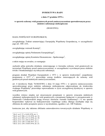 DYREKTYWA RADY z dnia 17 grudnia 1979 r. w sprawie ochrony wód gruntowych przed zanieczyszczeniem spowodowanym przez niektóre substancje niebezpieczne (80/68/EWG) RADA WSPÓLNOT EUROPEJSKICH, uwzględniając Traktat ustanawiający Europejską Wspólnotę Gospodarczą, w szczególności jego art. 100 i 235, uwzględniając wniosek Komisji1, uwzględniając opinię Parlamentu Europejskiego2, uwzględniając opinię Komitetu Ekonomiczno - Społecznego3, a także mając na uwadze, co następuje: zachodzi pilna potrzeba działania zmierzającego w kierunku ochrony wód gruntowych na terytorium Wspólnoty przed zanieczyszczeniem, w szczególności wywołanym przez niektóre trwałe i bioakumulujące się toksyczne substancje; program działań Wspólnot Europejskich z 1973 r. w sprawie środowiska4, uzupełniony programem z 1977 r.5, przewiduje szereg środków zmierzających do ochrony wód gruntowych przed niektórymi zanieczyszczeniami; art. 4 dyrektywy Rady 76/464/EWG z dnia 14 maja 1976 r. w sprawie zanieczyszczenia spowodowanego przez niektóre substancje niebezpieczne odprowadzane do środowiska wodnego Wspólnoty6 przewiduje wprowadzenie w życie szczegółowej dyrektywy w sprawie wód gruntowych; wszelkie różnice między już stosowanymi przepisami w sprawie zrzucania niektórych substancji niebezpiecznych do wód gruntowych a przepisami będącymi w przygotowaniu w Państwach Członkowskich mogą tworzyć nierówne warunki konkurencji i w ten sposób bezpośrednio wpływać na funkcjonowanie wspólnego rynku; dlatego niezbędne staje się zbliżenie do siebie przepisów prawa w tej dziedzinie, zgodnie z art. 100 Traktatu; konieczne jest, aby takiemu zbliżaniu ustawodawstwa towarzyszyło działanie Wspólnoty w 1 Dz.U. nr C 37 z 14.02.1978, str. 3. Dz.U. nr C 296 z 11.12.1978, str. 35. 3 Dz.U. nr C 283 z 27.11.1978, str. 39. 4 Dz.U. nr C 112 z 20.12.1973, str. 3. 5 Dz.U. nr C 139 z 13.06.1977, str. 3. 6 Dz.U. nr L 129 z 18.05.1976, str. 23. 2 sferze ochrony środowiska naturalnego oraz poprawy jakości życia; dlatego należy ustalić niektóre przepisy szczególne w tym celu; należy powołać się na art. 253 Traktatu, jako że wymagane uprawnienia nie zostały ustalone w Traktacie; z zakresu zastosowania niniejszej dyrektywy należy wyłączyć: ścieki z gospodarstw domowych pochodzące z niektórych odizolowanych budynków mieszkalnych oraz zrzuty zawierające substancje wymienione w wykazie I i II w bardzo małych ilościach i stężeniach, ze względu na niewielkie ryzyko zanieczyszczenia oraz na trudności w kontrolowaniu zrzutów takich ścieków; należy również wykluczyć zrzuty zawierające substancje skażone radioaktywnie, którymi będą się zajmować szczególne instrumenty wspólnotowe; aby zapewnić skuteczną ochronę wód gruntowych na terenie Wspólnoty konieczne jest zapobieganie zrzucaniu substancji wymienionych w wykazie I oraz ograniczenie zrzucania substancji wymienionych w wykazie II; należy wprowadzić rozróżnienie między bezpośrednim zrzutem substancji niebezpiecznych do wód gruntowych a działaniami, które prawdopodobnie doprowadzą do zrzutu pośredniego; z wyjątkiem bezpośrednich zrzutów substancji wymienionych w wykazie I, które są automatycznie zakazane, wszystkie zrzuty muszą podlegać systemowi udzielania zezwoleń; takie zezwolenie może być wydane jedynie po zbadaniu środowiska, do którego zrzucane są substancje; należy ustalić przepisy dotyczące wyjątków od zasady zakazu zrzutów substancji wymienionych w wykazie I do wód gruntowych po zbadaniu środowiska, do którego substancje są zrzucane i uprzednim wydaniu zezwolenia, pod warunkiem że zrzut odbywa się do wody gruntowej trwale niezdatnej do żadnego innego użytku, w szczególności w gospodarstwie domowym lub do celów rolniczych; sztuczne zasilanie wód gruntowych przeznaczonych do zaopatrywania w wodę wodociągów publicznych powinno podlegać specjalnym regułom; właściwe władze Państw Członkowskich powinny monitorować zgodność z warunkami ustanowionymi w zezwoleniach oraz skutek, jaki mają zrzuty na wody gruntowe; należy prowadzić spis zezwoleń na dokonywanie zrzutów substancji wymienionych w wykazie I do wód gruntowych oraz bezpośrednich zrzutów substancji wymienionych w wykazie II do wód gruntowych, jak również spis zezwoleń na sztuczne zasilanie do celów zarządzania wodami gruntowymi; przez wzgląd na fakt, że Republika Grecka ma zostać członkiem Europejskiej Wspólnoty Gospodarczej z dniem 1 stycznia 1981 r. zgodnie z aktem dotyczącym warunków przystąpienia Republiki Greckiej oraz dostosowaniem do Traktatów, konieczne wydaje się, aby okres przyznawany Państwom Członkowskim na wprowadzenie w życie przepisów ustawowych, wykonawczych i administracyjnych niezbędnych do wykonania niniejszej dyrektywy został przedłużony z dwóch do czterech lat, mając na uwadze braki w infrastrukturze technicznej i administracyjnej tego państwa, PRZYJMUJE NINIEJSZĄ DYREKTYWĘ: Artykuł 1 1. Celem niniejszej dyrektywy jest zapobieganie zanieczyszczaniu wody gruntowej substancjami należącymi do rodzin i grup substancji wymienionych w wykazie I lub II w Załączniku, określanymi dalej jako „substancje wymienione w wykazie I lub II”, oraz jak najdokładniejsze kontrolowanie lub eliminacja konsekwencji zanieczyszczenia, które już nastąpiło. 2. Do celów niniejszej dyrektywy: a) „woda gruntowa” oznacza wszelką wodę znajdującą się pod powierzchnią ziemi w strefie saturacji, oraz w bezpośredniej styczności z gruntem lub podglebiem; b) „zrzut bezpośredni” oznacza wprowadzanie do wody gruntowej substancji wymienionych w wykazie I lub II bez przesiąkania przez grunt lub podglebie; c) „zrzut pośredni” oznacza wprowadzanie do wody gruntowej substancji wymienionych w wykazie I lub II po przesiąkaniu przez grunt lub podglebie; d) „zanieczyszczenie” oznacza zrzucenie przez człowieka bezpośrednio lub pośred