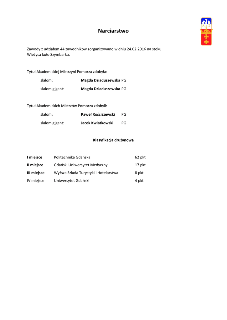 Narciarstwo Zawody z udziałem 44 zawodników zorganizowano w dniu 24.02.2016 na stoku Wieżyca koło Szymbarka. Tytuł Akademickiej Mistrzyni Pomorza zdobyła: slalom: Magda Dziaduszewska PG slalom gigant: Magda Dziaduszewska PG Tytuł Akademickich Mistrzów Pomorza zdobyli: slalom: Paweł Rościszewski PG slalom gigant: Jacek Kwiatkowski PG Klasyfikacja drużynowa I miejsce Politechnika Gdańska 62 pkt II miejsce Gdański Uniwersytet Medyczny 17 pkt III miejsce Wyższa Szkoła Turystyki i Hotelarstwa 8 pkt IV miejsce Uniwersytet Gdański 4 pkt