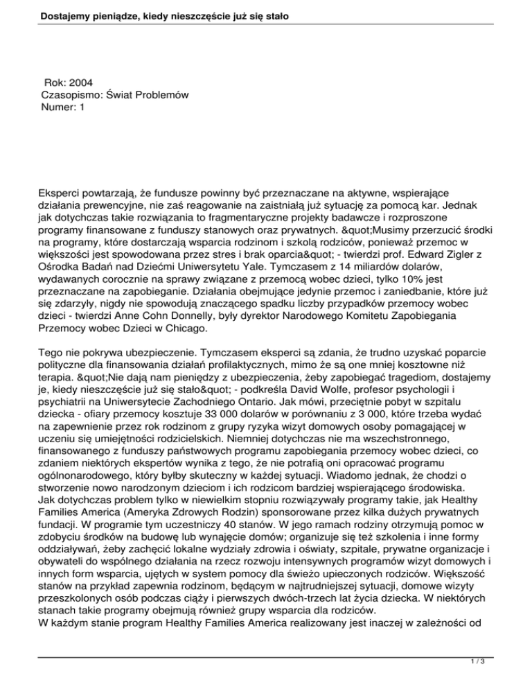 Dostajemy pieniądze, kiedy nieszczęście już się stało Rok: 2004 Czasopismo: Świat Problemów Numer: 1 Eksperci powtarzają, że fundusze powinny być przeznaczane na aktywne, wspierające działania prewencyjne, nie zaś reagowanie na zaistniałą już sytuację za pomocą kar. Jednak jak dotychczas takie rozwiązania to fragmentaryczne projekty badawcze i rozproszone programy finansowane z funduszy stanowych oraz prywatnych. "Musimy przerzucić środki na programy, które dostarczają wsparcia rodzinom i szkolą rodziców, ponieważ przemoc w większości jest spowodowana przez stres i brak oparcia" - twierdzi prof. Edward Zigler z Ośrodka Badań nad Dziećmi Uniwersytetu Yale. Tymczasem z 14 miliardów dolarów, wydawanych corocznie na sprawy związane z przemocą wobec dzieci, tylko 10% jest przeznaczane na zapobieganie. Działania obejmujące jedynie przemoc i zaniedbanie, które już się zdarzyły, nigdy nie spowodują znaczącego spadku liczby przypadków przemocy wobec dzieci - twierdzi Anne Cohn Donnelly, były dyrektor Narodowego Komitetu Zapobiegania Przemocy wobec Dzieci w Chicago. Tego nie pokrywa ubezpieczenie. Tymczasem eksperci są zdania, że trudno uzyskać poparcie polityczne dla finansowania działań profilaktycznych, mimo że są one mniej kosztowne niż terapia. "Nie dają nam pieniędzy z ubezpieczenia, żeby zapobiegać tragediom, dostajemy je, kiedy nieszczęście już się stało" - podkreśla David Wolfe, profesor psychologii i psychiatrii na Uniwersytecie Zachodniego Ontario. Jak mówi, przeciętnie pobyt w szpitalu dziecka - ofiary przemocy kosztuje 33 000 dolarów w porównaniu z 3 000, które trzeba wydać na zapewnienie przez rok rodzinom z grupy ryzyka wizyt domowych osoby pomagającej w uczeniu się umiejętności rodzicielskich. Niemniej dotychczas nie ma wszechstronnego, finansowanego z funduszy państwowych programu zapobiegania przemocy wobec dzieci, co zdaniem niektórych ekspertów wynika z tego, że nie potrafią oni opracować programu ogólnonarodowego, który byłby skuteczny w każdej sytuacji. Wiadomo jednak, że chodzi o stworzenie nowo narodzonym dzieciom i ich rodzicom bardziej wspierającego środowiska. Jak dotychczas problem tylko w niewielkim stopniu rozwiązywały programy takie, jak Healthy Families America (Ameryka Zdrowych Rodzin) sponsorowane przez kilka dużych prywatnych fundacji. W programie tym uczestniczy 40 stanów. W jego ramach rodziny otrzymują pomoc w zdobyciu środków na budowę lub wynajęcie domów; organizuje się też szkolenia i inne formy oddziaływań, żeby zachęcić lokalne wydziały zdrowia i oświaty, szpitale, prywatne organizacje i obywateli do wspólnego działania na rzecz rozwoju intensywnych programów wizyt domowych i innych form wsparcia, ujętych w system pomocy dla świeżo upieczonych rodziców. Większość stanów na przykład zapewnia rodzinom, będącym w najtrudniejszej sytuacji, domowe wizyty przeszkolonych osób podczas ciąży i pierwszych dwóch-trzech lat życia dziecka. W niektórych stanach takie programy obejmują również grupy wsparcia dla rodziców. W każdym stanie program Healthy Families America realizowany jest inaczej w zależności od 1/3 Dostajemy pieniądze, kiedy nieszczęście już się stało lokalnych zasobów i priorytetów politycznych. I chociaż najskuteczniejsze są wszechstronne programy pomagające rodzinom uzyskać wsparcie w sprawach mieszkaniowych i udział w rodzicielskiej edukacji, nie wszystkie oddziały Zdrowych Rodzin mają takie możliwości. Ponadto tego rodzaju programy profilaktyczne obejmują tylko pewną część rodzin z małymi dziećmi o dużym ryzyku przemocy, których liczba szacowana jest na milion. Najbardziej narażone na wystąpienie przemocy są rodziny młode, nadużywające alkoholu lub narkotyków, biedne, o ograniczonym lub żadnym wsparciu społecznym oraz takie, w których rodzice sami doznawali przemocy, pozostają w izolacji, mają niskie poczucie własnej wartości i nierealistyczne wyobrażenie o rodzicielstwie. Takie "rodziny wysokiego ryzyka" uzyskają lepszą pomoc, jeśli zachęci się całą społeczność do tego, żeby poczuła się bardziej odpowiedzialna za sąsiedzkie dzieci, a nie skupiała się na pojedynczych rodzicach. Ponieważ rodziny nie posiadające krewnych, na których mogłyby liczyć, ani innych rodzajów wsparcia społecznego często nie są w stanie uzyskać potrzebnej pomocy. Programy w społecznościach lokalnych. Programy profilaktyki przemocy wobec dzieci powinny angażować społeczność lokalną. "Nie chodzi o placówki takie jak agencje egzekwujące przestrzeganie prawa czy zapewniające ochronę dzieciom - stwierdza Deborah Daro, badaczka z Uniwersytetu Chicago - lecz o poczucie osobistej odpowiedzialności". Programy takie korzystają z metod, które mniej narażają na naznaczenie społeczne i mniej zagrażają poczuciu własnej wartości rodziców - zauważa dr Gary Melton, dyrektor Instytutu Rodziny i Życia Sąsiedzkiego Uniwersytetu Clemson w Południowej Karolinie. Melton proponuje takie przekształcenie programów lokalnych i służb społecznych, aby tworzyć społeczności, w których rodziny będą zachęcane do pilnowania siebie nawzajem, ponieważ przemoc wobec dzieci jest mniej prawdopodobna, kiedy ludzie wiedzą, że sąsiedzi nie będą obojętni. Wtedy ludzie mogą określić, kto jest w potrzebie, i okazać potrzebne wsparcie, na przykład zaopiekować się na pewien czas dziećmi. W Beaufort w Południowej Karolinie usługi pielęgnacyjno-opiekuńcze dla dzieci oferowane przez Medicaid (pomoc medyczna) zostały zreorganizowane tak, aby stworzyć program Well-Baby Plus (Dobrze Dziecku Plus), który pomaga rodzicom noworodków skontaktować się z innymi rodzicami, a także lokalnymi organizacjami i służbami. Ponadto rodzice maluchów w tym samym wieku co pewien czas przywożą dzieci do Centrum Rozwoju Dziecka przy szkole podstawowej w Beaufort na półtoragodzinny 