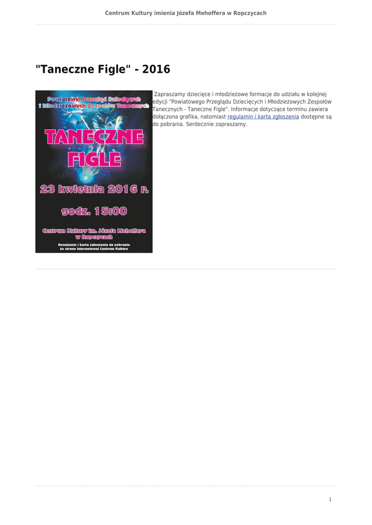 Centrum Kultury imienia Józefa Mehoffera w Ropczycach "Taneczne Figle" - 2016 Zapraszamy dziecięce i młodzieżowe formacje do udziału w kolejnej edycji "Powiatowego Przeglądu Dziecięcych i Młodzieżowych Zespołów Tanecznych - Taneczne Figle". Informacje dotyczące terminu zawiera dołączona grafika, natomiast regulamin i karta zgłoszenia dostępne są do pobrania. Serdecznie zapraszamy. 1