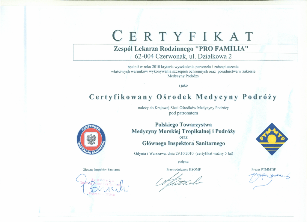 CERTYFIKAT Zespół Lekarza Rodzinnego "PRO FAMILIA" 62-004 Czerwonak, ul. Działkowa 2 spełnił w roku 20 I O kryteria wyszkolenia personelu i zabezpieczenia właściwych warunków wykonywania szczepień ochronnych oraz poradnictwa w zakresie Medycyny Podróży i jako Certyfikowany Ośrodek Medycyny Podróży należy do Krajowej Sieci Ośrodków Medycyny Podróży pod patronatem Polskiego Towarzystwa Medycyny Morskiej Tropikalnej i Podróży oraz Głównego Inspektora Sanitarnego Gdynia i Warszawa, dnia 29.10.2010 (certyfikat ważny 5 lat) podpisy: Główny Inspektor Sanitarny Przewodniczący KSOMP Prezes PTMMTiP