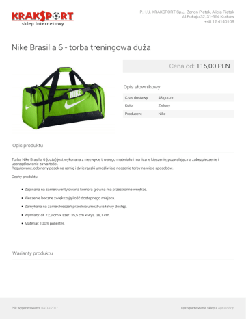 P.H.U. KRAKSPORT Sp.J. Zenon Piętak, Alicja Piętak Al.Pokoju 32, 31-564 Kraków +48 12 4140108 Nike Brasilia 6 - torba treningowa duża Cena od: 115,00 PLN Opis słownikowy Czas dostawy 48 godzin Kolor Zielony Producent Nike Opis produktu Torba Nike Brasilia 6 (duża) jest wykonana z niezwykle trwałego materiału i ma liczne kieszenie, pozwalając na zabezpieczenie i uporządkowanie zawartości. Regulowany, odpinany pasek na ramię i dwie rączki umożliwiają noszenie torby na wiele sposobów. Cechy produktu: Zapinana na zamek wentylowana komora główna ma przestronne wnętrze. Kieszenie boczne zwiększają ilość dostępnego miejsca. Zamykana na zamek kieszeń przednia umożliwia łatwy dostęp. Wymiary: dł. 72,3 cm × szer. 35,5 cm × wys. 38,1 cm. Materiał: 100% poliester. Warianty produktu Plik wygenerowano: 04-03-2017 Oprogramowanie sklepu: AptusShop P.H.U. KRAKSPORT Sp.J. Zenon Piętak, Alicja Piętak Al.Pokoju 32, 31-564 Kraków +48 12 4140108 L 115,00 PLN Galeria Plik wygenerowano: 04-03-2017 Powered by TCPDF (www.tcpdf.org) Oprogramowanie sklepu: AptusShop