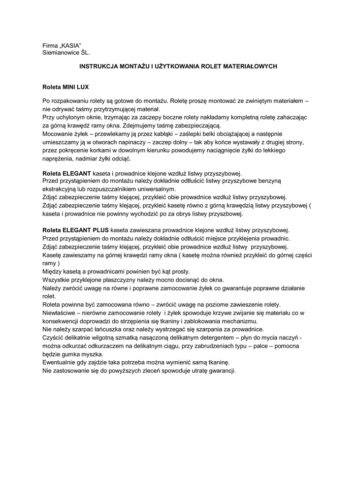 Firma „KASIA” Siemianowice ŚL. INSTRUKCJA MONTAŻU I UŻYTKOWANIA ROLET MATERIAŁOWYCH Roleta MINI LUX Po rozpakowaniu rolety są gotowe do montażu. Roletę proszę montować ze zwiniętym materiałem – nie odrywać taśmy przytrzymującej materiał. Przy uchylonym oknie, trzymając za zaczepy boczne rolety nakładamy kompletną roletę zahaczając za górną krawędź ramy okna. Zdejmujemy taśmę zabezpieczającą. Mocowanie żyłek – przewlekamy ją przez kabłąki – zaślepki belki obciążającej a następnie umieszczamy ją w otworach napinaczy – zaczep dolny – tak aby końce wystawały z drugiej strony, przez pokręcenie korkami w dowolnym kierunku powodujemy naciągnięcie żyłki do lekkiego naprężenia, nadmiar żyłki odciąć. Roleta ELEGANT kaseta i prowadnice klejone wzdłuż listwy przyszybowej. Przed przystąpieniem do montażu należy dokładnie odtłuścić listwy przyszybowe benzyną ekstrakcyjną lub rozpuszczalnikiem uniwersalnym. Zdjąć zabezpieczenie taśmy klejącej, przykleić obie prowadnice wzdłuż listwy przyszybowej. Zdjąć zabezpieczenie taśmy klejącej, przykleić kasetę równo z górną krawędzią listwy przyszybowej ( kaseta i prowadnice nie powinny wychodzić po za obrys listwy przyszbowej. Roleta ELEGANT PLUS kaseta zawieszana prowadnice klejone wzdłuż listwy przyszybowej. Przed przystąpieniem do montażu należy dokładnie odtłuścić miejsce przyklejenia prowadnic. Zdjąć zabezpieczenie taśmy klejącej, przykleić obie prowadnice wzdłuż listwy przyszybowej. Kasetę zawieszamy na górnej krawędzi ramy okna ( kasetę można również przykleić do górnej części ramy ) Między kasetą a prowadnicami powinien być kąt prosty. Wszystkie przyklejone płaszczyzny należy mocno docisnąć do okna. Należy zwrócić uwagę na równe i poprawne zamocowanie żyłek co gwarantuje poprawne działanie rolet. Roleta powinna być zamocowana równo – zwrócić uwagę na poziome zawieszenie rolety. Niewłaściwe – nierówne zamocowanie rolety i żyłek spowoduje krzywe zwijanie się materiału co w konsekwencji doprowadzi do strzępienia się tkaniny i zablokowania mechanizmu. Nie należy szarpać łańcuszka oraz należy wystrzegać się szarpania za prowadnice. Czyścić delikatnie wilgotną szmatką nasączoną delikatnym detergentem – płyn do mycia naczyń można odkurzać odkurzaczem na delikatnym ciągu, przy zabrudzeniach typu – palce – pomocna będzie gumka myszka. Ewentualnie gdy zajdzie taka potrzeba można wymienić samą tkaninę. Nie zastosowanie się do powyższych zleceń spowoduje utratę gwarancji.