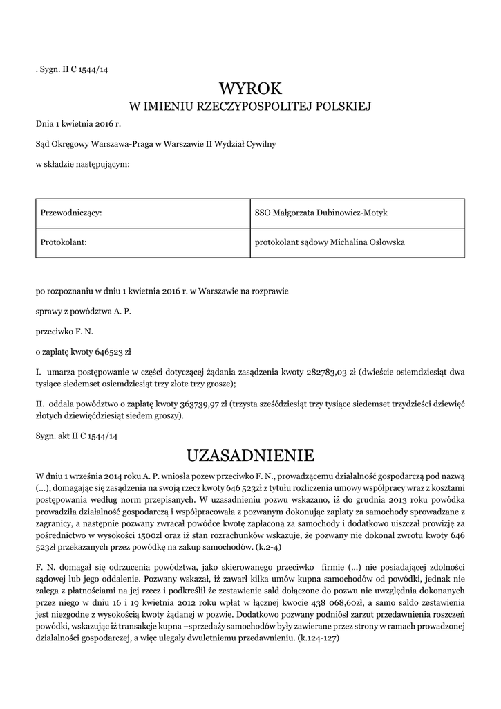 . Sygn. II C 1544/14 WYROK W IMIENIU RZECZYPOSPOLITEJ POLSKIEJ Dnia 1 kwietnia 2016 r. Sąd Okręgowy Warszawa-Praga w Warszawie II Wydział Cywilny w składzie następującym: Przewodniczący: SSO Małgorzata Dubinowicz-Motyk Protokolant: protokolant sądowy Michalina Osłowska po rozpoznaniu w dniu 1 kwietnia 2016 r. w Warszawie na rozprawie sprawy z powództwa A. P. przeciwko F. N. o zapłatę kwoty 646523 zł I. umarza postępowanie w części dotyczącej żądania zasądzenia kwoty 282783,03 zł (dwieście osiemdziesiąt dwa tysiące siedemset osiemdziesiąt trzy złote trzy grosze); II. oddala powództwo o zapłatę kwoty 363739,97 zł (trzysta sześćdziesiąt trzy tysiące siedemset trzydzieści dziewięć złotych dziewięćdziesiąt siedem groszy). Sygn. akt II C 1544/14 UZASADNIENIE W dniu 1 września 2014 roku A. P. wniosła pozew przeciwko F. N., prowadzącemu działalność gospodarczą pod nazwą (...), domagając się zasądzenia na swoją rzecz kwoty 646 523zł z tytułu rozliczenia umowy współpracy wraz z kosztami postępowania według norm przepisanych. W uzasadnieniu pozwu wskazano, iż do grudnia 2013 roku powódka prowadziła działalność gospodarczą i współpracowała z pozwanym dokonując zapłaty za samochody sprowadzane z zagranicy, a następnie pozwany zwracał powódce kwotę zapłaconą za samochody i dodatkowo uiszczał prowizję za pośrednictwo w wysokości 1500zł oraz iż stan rozrachunków wskazuje, że pozwany nie dokonał zwrotu kwoty 646 523zł przekazanych przez powódkę na zakup samochodów. (k.2-4) F. N. domagał się odrzucenia powództwa, jako skierowanego przeciwko firmie (...) nie posiadającej zdolności sądowej lub jego oddalenie. Pozwany wskazał, iż zawarł kilka umów kupna samochodów od powódki, jednak nie zalega z płatnościami na jej rzecz i podkreślił że zestawienie sald dołączone do pozwu nie uwzględnia dokonanych przez niego w dniu 16 i 19 kwietnia 2012 roku wpłat w łącznej kwocie 438 068,60zł, a samo saldo zestawienia jest niezgodne z wysokością kwoty żądanej w pozwie. Dodatkowo pozwany podniósł zarzut przedawnienia roszczeń powódki, wskazując iż transakcje kupna –sprzedaży samochodów były zawierane przez strony w ramach prowadzonej działalności gospodarczej, a więc ulegały dwuletniemu przedawnieniu. (k.124-127) W piśmie procesowym z dnia 30 listopada 2015 roku powódka sprecyzowała oznaczenie pozwanego , jednoznacznie wskazując iż pozwanym jest F. N. prowadzący działalność gospodarczą pod firmą (...) oraz zmieniła pozew poprzez wskazanie iż dochodzi zapłaty kwoty 363 739,97zł z tytułu zwrotu środków za zakupione samochody oraz prowizji za pośrednictwo. Powódka akcentowała, iż dochodzone roszczenie nie jest przedawnione, gdyż nie wynika z tytułu sprzedaży w zakresie działalności jej przedsiębiorstwa, gdyż jedynie pośredniczyła w zakupie przez pozwanego pojazdów, a nie dokonywała ich sprzedaży, nabywając pojazdy za swoje środki, a następnie odkupował je od niej pozwany. (k.139-141) Podczas rozprawy w dniu 1 kwietnia 2016 roku pełnomocnik powódki sprecyzował w/w pismo poprzez wskazanie, iż powódka cofa pozew w części przekraczającej żądanie zasądzenia kwoty 363 739,97zł. (k.157) Sąd ustalił następujący stan faktyczny: F. N. od 2003 roku prowadzi działalność gospodarczą pod nazwą (...). Niesporne, nadto wydruk z Centralnej Ewidencji i Informacji o Działalności Gospodarczej (k.6-7) A. P. w okresie od 1 lutego 2011 roku do 30 listopada 2013 roku prowadziła działalność gospodarczą pod nazwą Firma Handlowo – Usługowa (...) w zakresie m.in. sprzedaży hurtowej sprzętu elektronicznego i telekomunikacyjnego oraz części do niego (kod PKD 46.52.Z), sprzedaży hurtowej i detalicznej samochodów osobowych (kod PKD 45.11.Z), sprzedaży hurtowej i detalicznej innych pojazdów samochodowych (kod PKD 45.19.Z) …Dowód: wydruk z Centralnej Ewidencji i Informacji o Działalności Gospodarczej (k.52) 16 kwietnia 2012 roku F. N. dokonał przelewu na rzecz powódki kwoty 134 796zł tytułem częściowej zapłaty za samochód M. i kwoty 144 799,40zł tytułem zapłaty częściowej za samochód J. (...), a w dniu 19 kwietnia 2012 roku – kwoty 158 473,20zł tytułem zapłaty częściowej za samochód P.. Dowód: wyciąg z rachunku bankowego (k.128-129) W oparciu o dokumenty dostarczone przez A. P. biegły rewident sporządził zestawienie rozrachunków firmy powódki z firmą pozwanego za okres od lutego do sierpnia 2012 roku. Porównanie należności ujętych w wystawionych przez powódkę fakturach (1 601 101,77zł) z należnościami uiszczonymi przez pozwanego tytułem zapłaty za faktury i jako kaucja (1 216 345,40zł) wykazywało niedopłatę po stronie pozwanego w kwocie 384 756,37zł. W zestawieniu tym podano, iż pozwany nie uiścił zapłaty za samochody P. (...), V. (...), A. (...), J. (...) i F. (...), a faktury dokumentujące ich sprzedaż na rzecz pozwanego wystawiane były w okresie od 24 lutego 2012 roku do 22 sierpnia 2012 roku. Dowód: zestawienie księgowe (k.51) W kolejnym zestawieniu rozrachunków stron za w/w okres ujawniona niedopłata po stronie pozwanego wynosiła 363 739,97zł. Dowód: zestawienie księgowe (k.142-143) Pismem z dnia 6 marca 2014 roku F. N. został wezwany do zapłaty kwoty 646 523zł na rachunek bankowy Firmy Handlowo – Usługowej (...). Niesporne, nadto kopia pisma z 06.03.2014r. z potwierdzeniem nadania (k.9-11) Sąd zważył, co następuje: Powództwo podlegało oddaleniu, gdyż trafny był podniesiony przez pozwanego zarzut przedawnienia roszczenia powódki. Sąd zauważa, iż z twierdzeń obu stron wynika, iż zawierały one co najmniej kilka umów sprzedaży samochodów, prowadząc w owym czasie działalność gospodarczą. Powódka twierdziła, że pozwany odkupował od niej samochody, które ona nabywała za granicą, uiszczając na jej rzecz koszt zakupu przez nią pojazdu i prowizję w wyso