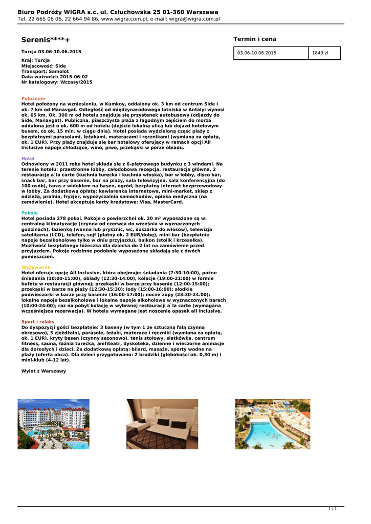 Biuro Podróży WIGRA s.c. ul. Człuchowska 25 01-360 Warszawa Tel. 22 665 06 06, 22 664 94 86, www.wigra.com.pl, e-mail: [email protected] Serenis****+ Turcja 03.06-10.06.2015 Termin i cena 03.06-10.06.2015 1849 zł Kraj: Turcja Miejscowość: Side Transport: Samolot Data ważności: 2015-06-02 Nr katalogowy: Wczasy/2015 Położenie Hotel położony na wzniesieniu, w Kumkoy, oddalony ok. 3 km od centrum Side i ok. 7 km od Manavgat. Odległość od międzynarodowego lotniska w Antalyi wynosi ok. 65 km. Ok. 300 m od hotelu znajduje się przystanek autobusowy (odjazdy do Side, Manavgat). Publiczna, piaszczysta plaża z łagodnym zejściem do morza oddalona jest o ok. 600 m od hotelu (dojście lokalną ulicą lub dojazd hotelowym busem, co ok. 15 min. w ciągu dnia). Hotel posiada wydzieloną część plaży z bezpłatnymi parasolami, leżakami, materacami i ręcznikami (wymiana za opłatą, ok. 1 EUR). Przy plaży znajduje się bar hotelowy oferujący w ramach opcji All Inclusive napoje chłodzące, wino, piwo, przekąski w porze obiadu. Hotel Odnowiony w 2011 roku hotel składa się z 6-piętrowego budynku z 3 windami. Na terenie hotelu: przestronne lobby, całodobowa recepcja, restauracja główna, 2 restauracje a`la carte (kuchnia turecka i kuchnia włoska), bar w lobby, disco bar, snack bar, bar przy basenie, bar na plaży, sala telewizyjna, sala konferencyjna (do 100 osób), taras z widokiem na basen, ogród, bezpłatny internet bezprzewodowy w lobby. Za dodatkową opłatą: kawiarenka internetowa, mini-market, sklep z odzieżą, pralnia, fryzjer, wypożyczalnia samochodów, opieka medyczna (na zamówienie). Hotel akceptuje karty kredytowe: Visa, MasterCard. Pokoje Hotel posiada 278 pokoi. Pokoje o powierzchni ok. 20 m² wyposażone są w: centralną klimatyzację (czynna od czerwca do września w wyznaczonych godzinach), łazienkę (wanna lub prysznic, wc, suszarka do włosów), telewizja satelitarna (LCD), telefon, sejf (płatny ok. 2 EUR/dobę), mini-bar (bezpłatnie napoje bezalkoholowe tylko w dniu przyjazdu), balkon (stolik i krzesełka). Możliwość bezpłatnego łóżeczka dla dziecka do 2 lat na zamówienie przed przyjazdem. Pokoje rodzinne podobnie wyposażone składają się z dwóch pomieszczeń. Wyżywienie Hotel oferuje opcję All Inclusive, która obejmuje: śniadania (7:30-10:00), późne śniadania (10:00-11:00), obiady (12:30-14:00), kolacje (19:00-21:00) w formie bufetu w restauracji głównej; przekąski w barze przy basenie (12:00-15:00); przekąski w barze na plaży (12:30-15:30); lody (15:00-16:00); słodkie podwieczorki w barze przy basenie (16:00-17:00); nocne zupy (23:30-24.00); lokalne napoje bezalkoholowe i lokalne napoje alkoholowe w wyznaczonych barach (10:00-24:00); raz na pobyt kolację w wybranej restauracji a`la carte (wymagana wcześniejsza rezerwacja). W hotelu wymagane jest noszenie opasek all inclusive. Sport i relaks Do dyspozycji gości bezpłatnie: 3 baseny (w tym 1 ze sztuczną falą czynną okresowo), 5 zjeżdżalni, parasole, leżaki, materace i ręczniki (wymiana za opłatą, ok. 1 EUR), kryty basen (czynny sezonowo), tenis stołowy, siatkówka, centrum fitness, sauna, łaźnia turecka, amfiteatr, dyskoteka, dzienne i wieczorne animacje dla dorosłych i dzieci. Za dodatkową opłatą: bilard, masaże, sporty wodne na plaży (oferta obca). Dla dzieci przygotowano: 2 brodziki (głębokości ok. 0,30 m) i mini-klub (4-12 lat). Wylot z Warszawy 1/1 Powered by TCPDF (www.tcpdf.org)