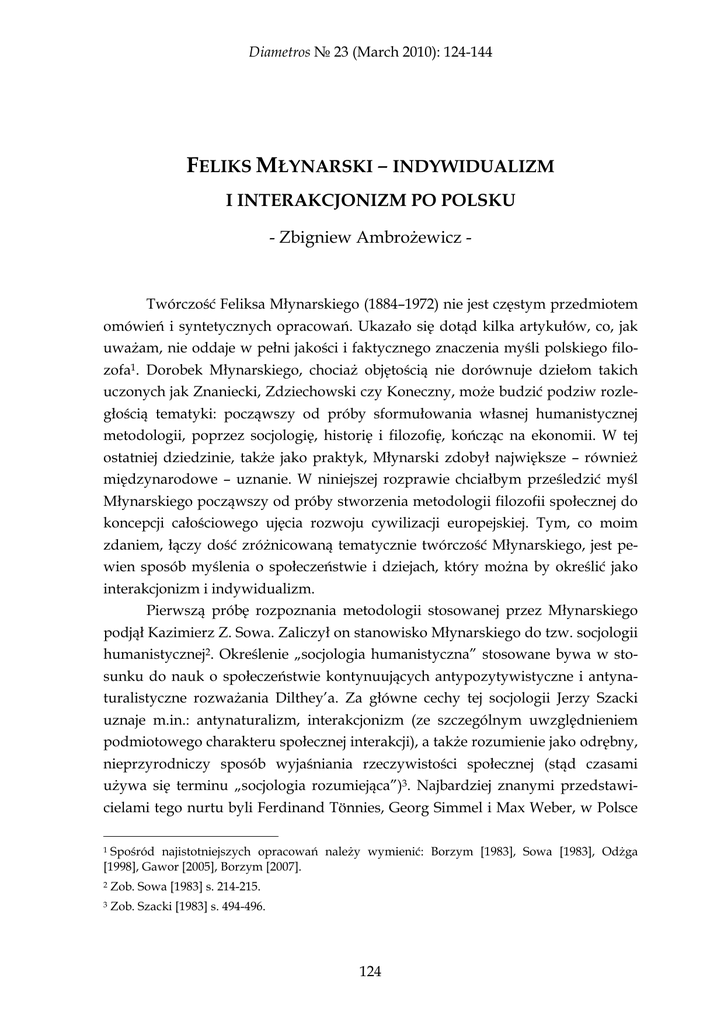 Diametros № 23 (March 2010): 124-144 FELIKS MŁYNARSKI – INDYWIDUALIZM I INTERAKCJONIZM PO POLSKU - Zbigniew Ambrożewicz - Twórczość Feliksa Młynarskiego (1884–1972) nie jest częstym przedmiotem omówień i syntetycznych opracowań. Ukazało się dotąd kilka artykułów, co, jak uważam, nie oddaje w pełni jakości i faktycznego znaczenia myśli polskiego filozofa1. Dorobek Młynarskiego, chociaż objętością nie dorównuje dziełom takich uczonych jak Znaniecki, Zdziechowski czy Koneczny, może budzić podziw rozległością tematyki: począwszy od próby sformułowania własnej humanistycznej metodologii, poprzez socjologię, historię i filozofię, kończąc na ekonomii. W tej ostatniej dziedzinie, także jako praktyk, Młynarski zdobył największe – również międzynarodowe – uznanie. W niniejszej rozprawie chciałbym prześledzić myśl Młynarskiego począwszy od próby stworzenia metodologii filozofii społecznej do koncepcji całościowego ujęcia rozwoju cywilizacji europejskiej. Tym, co moim zdaniem, łączy dość zróżnicowaną tematycznie twórczość Młynarskiego, jest pewien sposób myślenia o społeczeństwie i dziejach, który można by określić jako interakcjonizm i indywidualizm. Pierwszą próbę rozpoznania metodologii stosowanej przez Młynarskiego podjął Kazimierz Z. Sowa. Zaliczył on stanowisko Młynarskiego do tzw. socjologii humanistycznej2. Określenie „socjologia humanistyczna” stosowane bywa w stosunku do nauk o społeczeństwie kontynuujących antypozytywistyczne i antynaturalistyczne rozważania Dilthey’a. Za główne cechy tej socjologii Jerzy Szacki uznaje m.in.: antynaturalizm, interakcjonizm (ze szczególnym uwzględnieniem podmiotowego charakteru społecznej interakcji), a także rozumienie jako odrębny, nieprzyrodniczy sposób wyjaśniania rzeczywistości społecznej (stąd czasami używa się terminu „socjologia rozumiejąca”)3. Najbardziej znanymi przedstawicielami tego nurtu byli Ferdinand Tönnies, Georg Simmel i Max Weber, w Polsce Spośród najistotniejszych opracowań należy wymienić: Borzym [1983], Sowa [1983], Odżga [1998], Gawor [2005], Borzym [2007]. 1 2 Zob. Sowa [1983] s. 214-215. 3 Zob. Szacki [1983] s. 494-496. 124 Zbigniew Ambrożewicz ◦ Feliks Młynarski – indywidualizm i interakcjonizm po polsku zaś Florian Znaniecki. Jednak, jak zauważa Sowa4, Młynarski ogłosił swoje koncepcje już w 1911 roku (a zatem przed sformułowaniem przez Znanieckiego głównych tez jego socjologii) w książce Zagadnienie polityki niepodległości wydanej pod pseudonimem „Jan Brzoza”5. Młynarski odrzuca tu myślenie o społeczeństwie zwane przez niego realizmem. Realizm traktuje kategorie i pojęcia społeczne jako obiektywne i niezmienne byty. Niezmienność zaś ma implikować ich ontyczną niezależność od ludzkich podmiotów, co zostaje przyjęte, „by móc pomyśleć trwanie danego utworu na wypadek mej nieobecności”6. Takie zabezpieczenie się realizmu przed solipsyzmem okupione zostaje całkowitym zerwaniem z empirią. Przeoczone zostaje zjawisko nieustannego rozwoju społecznych instytucji, takich jak naród i państwo. Rodzi się również groźba, z jednej strony kultu państwa, z zaś drugiej koncepcja narodu jako czysto abstrakcyjnej, nieempirycznej, niemal platońskiej idei. Przede wszystkim jednak nie bierze się pod uwagę decydującego dla ich istnienia indywidualnego zaangażowania pojedynczych bytów ludzkich. Przeciwstawnym do realizmu i akceptowanym przez Młynarskiego stanowiskiem jest tzw. konceptualizm. Pod tym pojęciem Młynarski rozumie spojrzenie na „twory społeczne” jako „logicznie” niezależne od jednostek całości, będące jednocześnie podlegającym ciągłym przemianom rezultatem ich wzajemnego oddziaływania i współdziałania7. Konceptualistyczne pojmowanie państwa i narodu niweluje dystans między instytucjami a obywatelem – „państwo dla niego istnieje wszędzie tam, gdzie obywatele organizują stosunki wzajemnego oddziaływania”8. Ale stosunki te kształtują się pierwotnie jako stosunki narodowe. Już w tym wczesnym dziele Młynarski podkreśla szczególne znaczenie narodu, rozumianego także konceptualistycznie, jako przejaw woli jednostek. Państwo zatem jest wyrazem woli odpowiedzialnych za siebie i świadomie uczestniczących we wspólnocie jednostek, inaczej mówiąc – jest wyrazem indywidualności narodu. Koncepcje Młynarskiego niewątpliwie znajdują się pod pewnym wpływem Simmla i jednocześnie w opozycji do socjologii Durkheima. Nietrudno dostrzec te związki choćby w takiej oto charakterystyce konceptualizmu: „głosi teoryę życia społecznego w całem tego słowa znaczeniu, bo życie musi być pojmowane jako prąd, a nie jako zmartwiały przedmiot fizycznego doświadczenia”9. W późniejszej 4 Zob. Sowa [1983] s. 215. 5 Brzoza [1911] 6 Tamże, s. 39. 7 Zob. tamże. 8 Tamże, s. 44. 9 Tamże, s. 39-40. 125 Zbigniew Ambrożewicz ◦ Feliks Młynarski – indywidualizm i interakcjonizm po polsku pracy, Zasady filozofii społecznej, Młynarski precyzuje i rozwija swój program badawczy, punktem wyjścia czyniąc dlań filozofię pragmatyzmu, tj. twórczość W. Jamesa, F.C.S. Schillera i H. Bergsona10. Za główną zasługę tak szeroko rozumianego pragmatyzmu uznał Młynarski krytykę racjonalizmu implikującą sprowadzenie prawdziwości praw naukowych do ich użyteczności dla człowieka, a tym samym uczynienie z człowieka zarówno twórczej przyczyny, jak i celu naukowych i epistemologicznych dociekań. Dlatego też nowa metoda filozoficzna powinna być filozofią ludzkiej twórczości, co zdaniem Młynarskiego, oznacza przede wszystkim badanie „człowieczeństwa”, kształtującego się w warunkach społecznych i na przestrzeni dziejów. „Należy zbadać – pisze Młynarski - w jakim stopniu życie społeczne decyduje o rozwoju form poznania i ściśle określić na tej drodze przedmiot metafizyki”11. W p