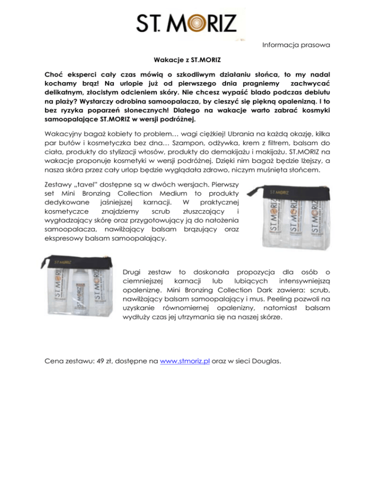 Informacja prasowa Wakacje z ST.MORIZ Choć eksperci cały czas mówią o szkodliwym działaniu słońca, to my nadal kochamy brąz! Na urlopie już od pierwszego dnia pragniemy zachwycać delikatnym, złocistym odcieniem skóry. Nie chcesz wypaść blado podczas debiutu na plaży? Wystarczy odrobina samoopalacza, by cieszyć się piękną opalenizną. I to bez ryzyka poparzeń słonecznych! Dlatego na wakacje warto zabrać kosmyki samoopalające ST.MORIZ w wersji podróżnej. Wakacyjny bagaż kobiety to problem… wagi ciężkiej! Ubrania na każdą okazję, kilka par butów i kosmetyczka bez dna… Szampon, odżywka, krem z filtrem, balsam do ciała, produkty do stylizacji włosów, produkty do demakijażu i makijażu. ST.MORIZ na wakacje proponuje kosmetyki w wersji podróżnej. Dzięki nim bagaż będzie lżejszy, a nasza skóra przez cały urlop będzie wyglądała zdrowo, niczym muśnięta słońcem. Zestawy „tavel” dostępne są w dwóch wersjach. Pierwszy set Mini Bronzing Collection Medium to produkty dedykowane jaśniejszej karnacji. W praktycznej kosmetyczce znajdziemy scrub złuszczający i wygładzający skórę oraz przygotowujący ją do nałożenia samoopalacza, nawilżający balsam brązujący oraz ekspresowy balsam samoopalający. Drugi zestaw to doskonała propozycja dla osób o ciemniejszej karnacji lub lubiących intensywniejszą opaleniznę. Mini Bronzing Collection Dark zawiera: scrub, nawilżający balsam samoopalający i mus. Peeling pozwoli na uzyskanie równomiernej opalenizny, natomiast balsam wydłuży czas jej utrzymania się na naszej skórze. Cena zestawu: 49 zł, dostępne na www.stmoriz.pl oraz w sieci Douglas.