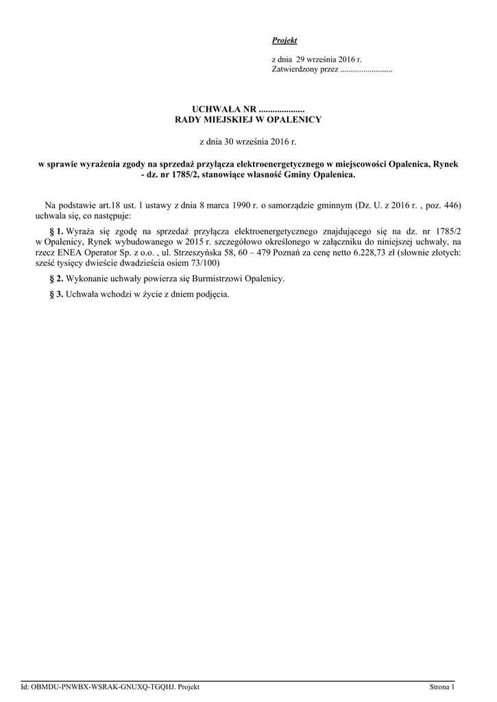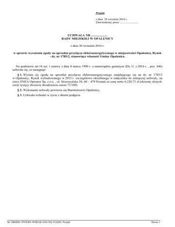 Projekt z dnia 29 września 2016 r. Zatwierdzony przez ......................... UCHWAŁA NR .................... RADY MIEJSKIEJ W OPALENICY z dnia 30 września 2016 r. w sprawie wyrażenia zgody na sprzedaż przyłącza elektroenergetycznego w miejscowości Opalenica, Rynek - dz. nr 1785/2, stanowiące własność Gminy Opalenica. Na podstawie art.18 ust. 1 ustawy z dnia 8 marca 1990 r. o samorządzie gminnym (Dz. U. z 2016 r. , poz. 446) uchwala się, co następuje: § 1. Wyraża się zgodę na sprzedaż przyłącza elektroenergetycznego znajdującego się na dz. nr 1785/2 w Opalenicy, Rynek wybudowanego w 2015 r. szczegółowo określonego w załączniku do niniejszej uchwały, na rzecz ENEA Operator Sp. z o.o. , ul. Strzeszyńska 58, 60 – 479 Poznań za cenę netto 6.228,73 zł (słownie złotych: sześć tysięcy dwieście dwadzieścia osiem 73/100) § 2. Wykonanie uchwały powierza się Burmistrzowi Opalenicy. § 3. Uchwała wchodzi w życie z dniem podjęcia. Id: OBMDU-PNWBX-WSRAK-GNUXQ-TGQHJ. Projekt Strona 1 Uzasadnienie W zawartej umowie o przyłączenie do sieci nr OD5/ZR10/1021/2015 z dnia 28.10.2015 r. (30.10.2015 r.) Gmina Opalenica oświadczyła, iż wykona przyłącze we własnym zakresie i przeniesie na rzecz ENEA Operator Sp. z o.o. własność przyłącza. Budowa została zakończona w 2015 roku. Sprzedaż przyłącza dokonana zostanie odrębną umową na podstawie cennika stanowiącego załącznik do umowy o przyłączenie. Przedmiotem sprzedaży nie jest objęta nieruchomość, na której usytuowane jest przyłącze. Id: OBMDU-PNWBX-WSRAK-GNUXQ-TGQHJ. Projekt Strona 1 Załącznik do uchwały Nr ……………… Rady Miejskiej w Opalenicy z dnia 30 września 2016 r. Zestawienie kosztów związanych z budową przyłącza elektroenergetycznego znajdującego się na dz. nr 1785/2 w Opalenicy, Rynek. Lp. Opis prac Jednostka Cena Ilość miary jednostkowa netto Kwota netto zł. - zł. 1. Montaż kabla YAKY 4x35 mm² w ziemi ( bez rozbiórki i naprawy nawierzchni) z uwzględnieniem opłat za zajęcie terenu, bez wymiany gruntu. m 47,29 16 756,64 2. Montaż kabla YAKY 4x35 mm² w ziemi ( bez rozbiórki i naprawy nawierzchni) z uwzględnieniem opłat za zajęcie terenu – dodatkowy kabel. m 6,60 16 105,60 3. Pomiar pomontażowy kabla szt. 43,49 2 86,98 4. Dodatek za przecisk ( wraz z ceną rury ) m 120,28 12 1.443,36 kpl. 1.344,60 1 1.344,60 6. Wykonanie uziemienia złącza kablowopomiarowego wraz z pomiarem uziemienia. kpl. 495,00 1 495,00 7. Obsługo geodezyjna do 30 m linii kablowej zawierająca współrzędne w wersji elektronicznej. kpl. 533,64 1 533,64 8. Projekt techniczny na budowę przyłącza o długości trasy do 30 m. kpl. 1.462,91 1 1.462,91 5. Złącze kablowo-pomiarowe ZK1x-1P zgodnie ze standardami obowiązującymi w ENEA Operator Sp. z o.o. wraz z zabezpieczeniami w tym zabezpieczeniem przedlicznikowym oraz montażem. Pozycja obejmuje koszty wykonania schematów i opisów (bez wykonania uziemienia i pomiaru uziemienia) Razem: 6.228,73 Id: OBMDU-PNWBX-WSRAK-GNUXQ-TGQHJ. Projekt Strona 1