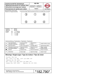 Anziehvorschrift für Zylinderkopf Tightening Instructions for Cylinder Head Instructions de serrage pour culasse 182.790 passend für / suitable for adaptable à / adaptable a Subaru Prescripciones de apriete para culatas Schraubenkopf / Head shape Tête de vis / Cabeza de tornillo Anziehen/ Tightening/ Serrage/ Apriete E S S ³ ³ Anziehreihenfolge/Tightening sequence/Ordre de serrage/Orden de apriete 29 Nm 69 Nm 1 - 2: 34 Nm 3 - 6: 15 Nm 1 - 6: 90° 1 - 6: 90° Zeichenerklärung / Explanations / Explication / Explicacion E neue Zylinderkopfschrauben verwenden 4 Warmlauf (80°C) R Schrauben einzeln lösen und wieder anziehen O Setzzeit ³ Drehwinkel use new cylinder head bolts utiliser des vis neuves emplar tornillos nuevos warm up time (80°C) chauffage (80°C) calentamiento (80°C) loosen and tighten each bolt deserrer et serrer vis par vis aflojar y apretar tornillo a tornillo relaxation time durée de tassement tiempo de espera torque angle angle de serrage ángulo de giro Motortyp / Engine type / Type de moteur / Tipo de motor Durchm. 89,0 mm Mot. EJ16 1,6i 4WD 1597 ccm SOHC 16V Impreza GC, GF 1992Mot. EJ18 1,8i 4WD 1820 ccm SOHC 16V Legacy BC, BJF 1989Impreza GC, GF 1992- ElringKlinger AG, Max-Eyth-Str.2 72581 Dettingen / Erms. Tel. 07123/724 601 *182.790*