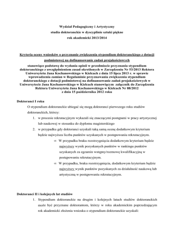 Wydział Pedagogiczny i Artystyczny studia doktoranckie w dyscyplinie sztuki piękne rok akademicki 2013/2014 Kryteria oceny wniosków o przyznanie zwiększenia stypendium doktoranckiego z dotacji podmiotowej na dofinansowanie zadań projakościowych stanowiące podstawę do wydania opinii w przedmiocie przyznania stypendium doktoranckiego z uwzględnieniem zasad określonych w Zarządzeniu Nr 53/2013 Rektora Uniwersytetu Jana Kochanowskiego w Kielcach z dnia 15 lipca 2013 r. w sprawie wprowadzenia zamian w Regulaminie przyznawania zwiększenia stypendium doktoranckiego z dotacji podmiotowej na dofinansowanie zadań projakościowych w Uniwersytecie Jana Kochanowskiego w Kielcach stanowiącym załącznik do Zarządzenia Rektora Uniwersytetu Jana Kochanowskiego w Kielcach Nr 88/2012 z dnia 15 października 2012 roku Doktoranci I roku O stypendium doktoranckie ubiegać się mogą doktoranci pierwszego roku studiów doktoranckich, którzy: 1. w procesie rekrutacyjnym wykazali się znaczącymi postępami w pracy artystycznej lub naukowej w stosunku do dyplomu magisterskiego 2. w przypadku gdy doktoranci uzyskali taką samą ocenę dodatkowym kryterium będzie najwyższa liczba punktów uzyskanych w postępowaniu rekrutacyjnym. • W przypadku braku rozstrzygnięcia dodatkowym kryterium będzie najwyższy wynik pozyskanych punktów w rankingu punktów uzyskanych za egzamin wstępny/rozmowę kwalifikacyjną w postępowaniu rekrutacyjnym. • W przypadku, braku rozstrzygnięcia, dodatkowym kryterium będzie najwyższy wynik punktów pozyskanych za działalność naukową lub artystyczną w postępowaniu rekrutacyjnym. Doktoranci II i kolejnych lat studiów 1. Stypendium doktoranckie na drugim i kolejnych latach studiów doktoranckich może być przyznane doktorantom, którzy w roku akademickim poprzedzającym rok akademicki złożenia wniosku o stypendium doktoranckie uzyskali: • wyróżniające osiągnięcia w pracy badawczej lub twórczej rozumiane jako kryteria parametryzacji Ministra Nauki i Szkolnictwa Wyższego oparte na punktacji zawartej w Rozporządzeniu Ministra Nauki i Szkolnictwa Wyższego z dnia 13 lipca 2012 r. w sprawie kryteriów i trybu przyznawania kategorii naukowej jednostkom naukowym (Dz.U. 2012 nr 0 poz. 877). 2. W przypadku gdy doktoranci uzyskają taką samą liczbę punktów w kryteriach parametryzacji MNiSW (określnych w punkcie 1) dodatkowym kryterium będzie: • liczba punktów uzyskana w ocenie parametrycznej dorobku naukowego, • w przypadku braku rozstrzygnięcia dodatkowym kryterium będą postępy jakimi wykazał się doktorant w pracy naukowej lub artystycznej w przygotowaniu rozprawy doktorskiej w roku akademickim poprzedzającym złożenie wniosku. Postanowienia końcowe 1. W uzasadnionych przypadkach Komisja może odstąpić od przyjętych kryteriów 2. Złożenie wniosku do Kierownika studiów doktoranckich powinno nastąpić do dnia 10 listopada danego roku akademickiego. 3. Decyzja Komisji Skład komisji w dyscyplinie sztuki piękne: dr hab. Urszula Ślusarczyk, prof. UJK – przewodnicząca ….………………………… prof. zw. Władysław Szczepański - członek ……………………………… prof. Ryszard Ługowski – członek ……………………………… mgr Joanna Łuczaj – przedstawiciel doktorantów ……………..……………….. Stypendium dzielone jest proporcjonalnie w stosunku do liczby studentów poszczególnych lat studiów, pomiędzy doktorantami z najlepszymi wynikami na poszczególnych latach .