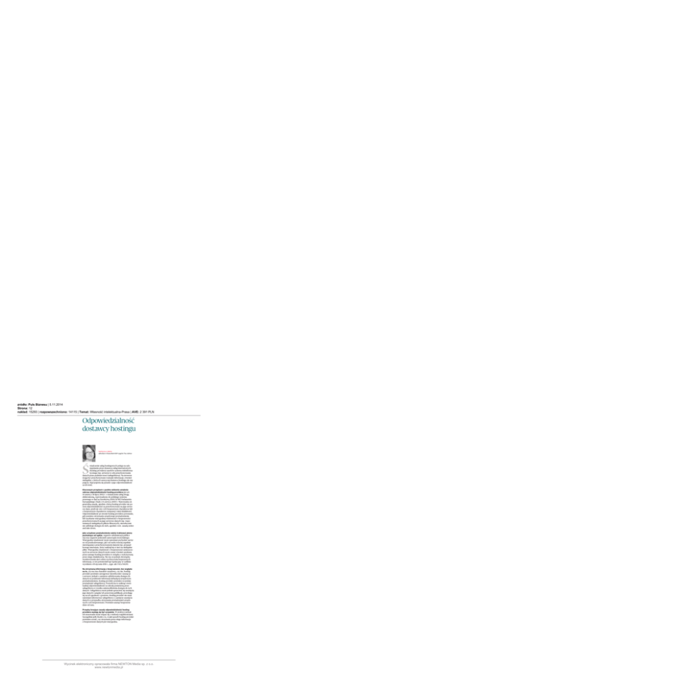 zródło: Puls Biznesu | 5.11.2014 Strona: 12 nakład: 15293 | rozpowszechniono: 14115 | Temat: Własność intelektualna-Prasa | AVE: 2 391 PLN Odpowiedzialność dostawcy hostingu NATALIA GAWEŁ adwokat w Kancelarii KSP Legal & Tax Advice Ś wiadczenie usług hostingowych polega na udostępnianiu przez dostawcę usług internetowych (hosting providera) zasobów systemu teleinformatycznego (np. serwera) w celu przechowywania danych przez podmiot trzeci (usługobiorcę). Na serwerze mogą być przechowywane rozmaite informacje, również nielegalne, o których zazwyczaj dostawca hostingu nie ma pojęcia. Stąd pojawia się pytanie o jego odpowiedzialność za ich treść. Kluczowym przepisem z punktu widzenia ustalenia zakresu odpowiedzialności hosting providera jest art. 14 ustawy z 18 lipca 2002 r. o świadczeniu usług drogą elektroniczną, wprowadzony do polskiego systemu prawnego w ślad za Dyrektywą 2000/31/WE Parlamentu Europejskiego i Rady z 8 czerwca 2000 r. Wprowadza on generalną zasadę, zgodnie z którą hosting provider nie ponosi odpowiedzialności za przechowywane na jego serwerze dane, jeżeli nie wie o ich bezprawnym charakterze lub o bezprawnym charakterze związanej z nimi działalności. Odpowiedzialność po stronie hosting providera powstanie, gdy pomimo otrzymania urzędowego powiadomienia lub uzyskania wiarygodnej wiadomości o bezprawności przechowywanych na jego serwerze danych (np. wspomnianych nielegalnych plików filmowych), niezwłocznie nie zablokuje dostępu do nich, zgodnie z tzw. zasadą notice and take down. Jako urzędowe powiadomienia należy traktować pisma pochodzące od sądów, organów administracji publicznej oraz organów jednostek samorządu terytorialnego. Wiarygodna wiadomość może natomiast pochodzić zarówno od poszkodowanego, jak i od osoby trzeciej zupełnie niezwiązanej z przechowywanymi danymi (np. przypadkowego internauty, który natknął się w sieci na nielegalne pliki). Wiarygodna wiadomość o bezprawności umieszczonych na serwerze danych może zostać również uzyskana przez samego hosting providera w związku z wykonywaną przez niego działalnością. Nie ma on jednak obowiązku monitorowania sieci celem wychwycenia bezprawnych informacji, co też potwierdził Sąd Apelacyjny w Lublinie wyrokiem z 18 stycznia 2011 r., sygn. akt I ACa 544/10. Na otrzymaną informację o bezprawności, bez względu na to, czy ma ona charakter urzędowy, czy nie, hosting provider powinien zareagować niezwłocznie i usunąć je z serwera. Jednak o zamiarze zablokowania dostępu do danych na podstawie informacji niebędącej urzędowym powiadomieniem, hosting provider powinien wcześniej powiadomić usługobiorcę. Pozwoli mu to uniknąć ewentualnej odpowiedzialności za szkodę poniesioną przez usługobiorcę w wyniku uniemożliwienia dostępu do tych danych. Usługobiorca może jednak sprzeciwić się usunięciu jego danych i zażądać ich ponownej publikacji, powołując się na ich zgodność z prawem. Hosting provider nie musi natomiast informować usługobiorcy o zamiarze usunięcia danych w przypadku otrzymania powiadomień urzędowych o ich bezprawności. Powinien usunąć bezprawne dane od razu. Przepisy kreujące zasady odpowiedzialności hosting providera wydają się być oczywiste. W praktyce jednak ich stosowanie może wiązać się z wieloma wątpliwościami. Szczególnie jeśli chodzi o to, w jaki sposób hosting provider powinien ocenić, czy otrzymana przez niego informacja o bezprawności danych jest wiarygodna. Wycinek elektroniczny opracowała firma NEWTON Media sp. z o.o. www.newtonmedia.pl