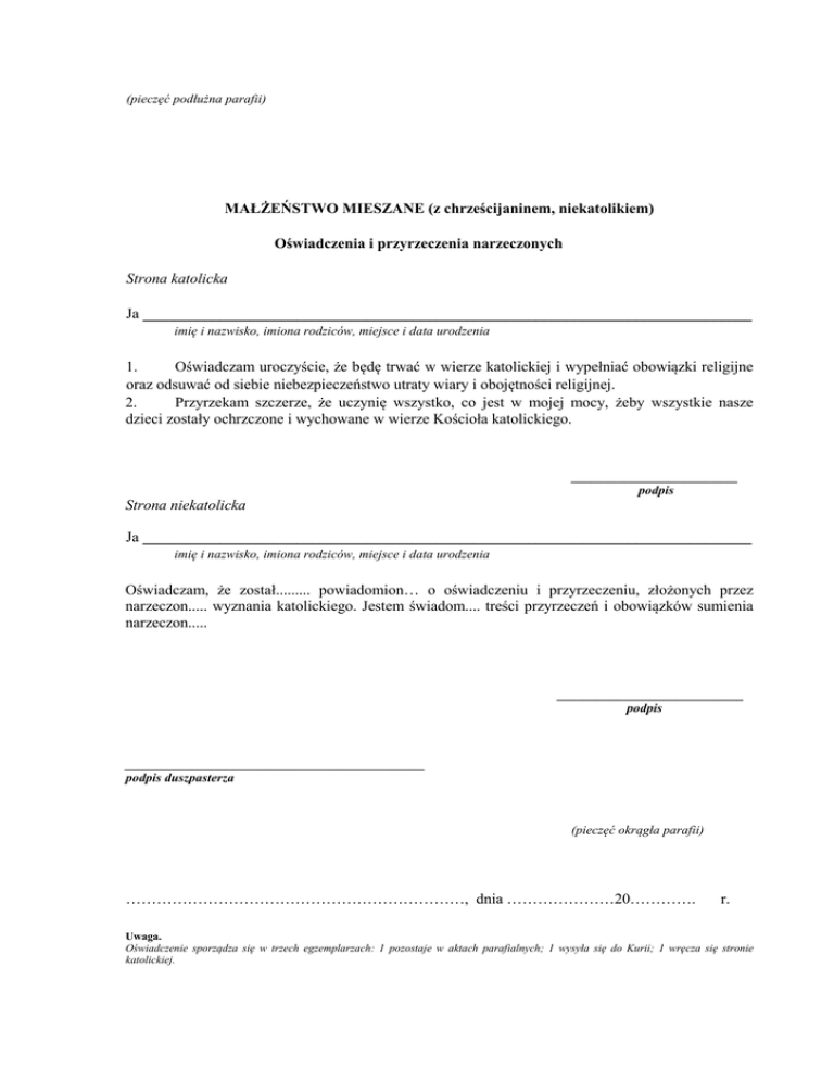(pieczęć podłużna parafii) MAŁŻEŃSTWO MIESZANE (z chrześcijaninem, niekatolikiem) Oświadczenia i przyrzeczenia narzeczonych Strona katolicka Ja _______________________________________________________________________________ imię i nazwisko, imiona rodziców, miejsce i data urodzenia 1. Oświadczam uroczyście, że będę trwać w wierze katolickiej i wypełniać obowiązki religijne oraz odsuwać od siebie niebezpieczeństwo utraty wiary i obojętności religijnej. 2. Przyrzekam szczerze, że uczynię wszystko, co jest w mojej mocy, żeby wszystkie nasze dzieci zostały ochrzczone i wychowane w wierze Kościoła katolickiego. _________________________ podpis Strona niekatolicka Ja _______________________________________________________________________________ imię i nazwisko, imiona rodziców, miejsce i data urodzenia Oświadczam, że został......... powiadomion… o oświadczeniu i przyrzeczeniu, złożonych przez narzeczon..... wyznania katolickiego. Jestem świadom.... treści przyrzeczeń i obowiązków sumienia narzeczon..... ____________________________ podpis _____________________________________________ podpis duszpasterza (pieczęć okrągła parafii) …………………………………………………………, dnia …………………20…………. r. Uwaga. Oświadczenie sporządza się w trzech egzemplarzach: 1 pozostaje w aktach parafialnych; 1 wysyła się do Kurii; 1 wręcza się stronie katolickiej.