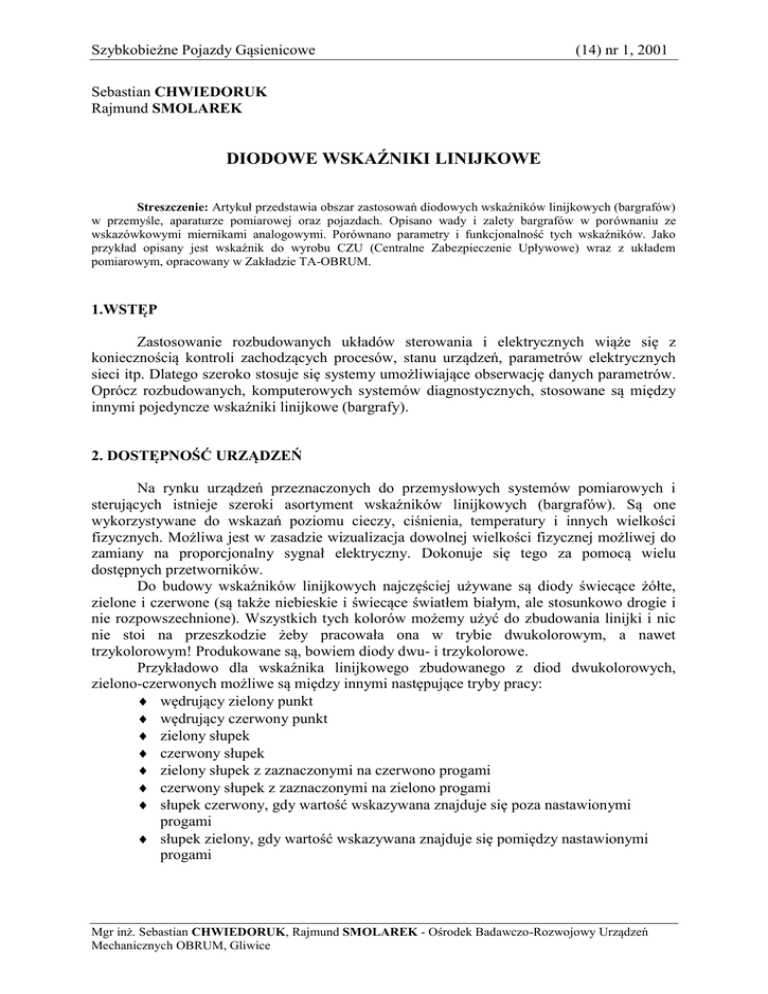 Szybkobieżne Pojazdy Gąsienicowe (14) nr 1, 2001 Sebastian CHWIEDORUK Rajmund SMOLAREK DIODOWE WSKAŹNIKI LINIJKOWE Streszczenie: Artykuł przedstawia obszar zastosowań diodowych wskaźników linijkowych (bargrafów) w przemyśle, aparaturze pomiarowej oraz pojazdach. Opisano wady i zalety bargrafów w porównaniu ze wskazówkowymi miernikami analogowymi. Porównano parametry i funkcjonalność tych wskaźników. Jako przykład opisany jest wskaźnik do wyrobu CZU (Centralne Zabezpieczenie Upływowe) wraz z układem pomiarowym, opracowany w Zakładzie TA-OBRUM. 1.WSTĘP Zastosowanie rozbudowanych układów sterowania i elektrycznych wiąże się z koniecznością kontroli zachodzących procesów, stanu urządzeń, parametrów elektrycznych sieci itp. Dlatego szeroko stosuje się systemy umożliwiające obserwację danych parametrów. Oprócz rozbudowanych, komputerowych systemów diagnostycznych, stosowane są między innymi pojedyncze wskaźniki linijkowe (bargrafy). 2. DOSTĘPNOŚĆ URZĄDZEŃ Na rynku urządzeń przeznaczonych do przemysłowych systemów pomiarowych i sterujących istnieje szeroki asortyment wskaźników linijkowych (bargrafów). Są one wykorzystywane do wskazań poziomu cieczy, ciśnienia, temperatury i innych wielkości fizycznych. Możliwa jest w zasadzie wizualizacja dowolnej wielkości fizycznej możliwej do zamiany na proporcjonalny sygnał elektryczny. Dokonuje się tego za pomocą wielu dostępnych przetworników. Do budowy wskaźników linijkowych najczęściej używane są diody świecące żółte, zielone i czerwone (są także niebieskie i świecące światłem białym, ale stosunkowo drogie i nie rozpowszechnione). Wszystkich tych kolorów możemy użyć do zbudowania linijki i nic nie stoi na przeszkodzie żeby pracowała ona w trybie dwukolorowym, a nawet trzykolorowym! Produkowane są, bowiem diody dwu- i trzykolorowe. Przykładowo dla wskaźnika linijkowego zbudowanego z diod dwukolorowych, zielono-czerwonych możliwe są między innymi następujące tryby pracy: wędrujący zielony punkt wędrujący czerwony punkt zielony słupek czerwony słupek zielony słupek z zaznaczonymi na czerwono progami czerwony słupek z zaznaczonymi na zielono progami słupek czerwony, gdy wartość wskazywana znajduje się poza nastawionymi progami słupek zielony, gdy wartość wskazywana znajduje się pomiędzy nastawionymi progami Mgr inż. Sebastian CHWIEDORUK, Rajmund SMOLAREK - Ośrodek Badawczo-Rozwojowy Urządzeń Mechanicznych OBRUM, Gliwice Sebastian CHWIEDORUK, Rajmund SMOLAREK Bargraf może pracować jako miernik napięcia lub prądu, a także z wejściem typu pętla prądowa 4- 20mA. Często stosowana jest izolacja galwaniczna wejść pomiarowych (tzn. obwody zasilania są oddzielone galwanicznie od wejść pomiarowych). Ze względu na uniwersalność tych modułów, zazwyczaj posiadają one kilka zakresów pomiarowych i skalowane są w procentach zakresu pomiarowego. Często możliwe jest ustawianie progu alarmu, a także regulacja wartości 0 i 100% w obrębie wybranego zakresu (ustawianie dolnego i górnego progu). 3. CZY BARGRAFY SĄ LEPSZE OD ANALOGOWYCH MIERNIKÓW? W celu wizualizacji stanu jakiegoś parametru fizycznego najdogodniejsze jest użycie wskaźnika analogowego (czyli skala i wskazówka) lub bargrafu. Człowiek łatwiej dostrzega obecność stanu niż wskazanie liczbowe dostępne na wyświetlaczu cyfrowym. Wyświetlanie cyfrowe np. za pomocą wyświetlacza siedmiosegmentowego, wprawdzie daje dokładny cyfrowy wynik, jednak wymaga odczytania wyniku oraz przetworzenia (przez mózg), w celu oceny parametru (między innymi z tego powodu mamy w naszych samochodach na ogół prędkościomierze oraz obrotomierze wskazówkowe, a nie cyfrowe). Możliwe jest to przy monitorowaniu kilku wielkości, ale zaczyna być kłopotliwe przy większej liczbie odczytów. Mając do dyspozycji wskaźniki analogowe bądź diodowe, wystarczy tylko ”rzut okiem” aby ocenić monitorowany czynnik i stwierdzić czy nie przekracza on wartości alarmowych. Dobrym, często stosowanym połączeniem jest użycie zarówno bargrafu jak i wyświetlacza cyfrowego. W takim układzie mamy zapewniony zarówno dokładny odczyt cyfrowy, jak i wskazanie poziomu sygnału (np. w relacji do nastawionych progów alarmowych). Rys. 1 przedstawia przykład takiego miernika. Rys.1. Tablicowy miernik programowalny LIN26N (firma SEM-Warszawa)[2] Współczesne zastosowanie elektromechanicznych mierników wskazówkowych, nie jest na ogół usprawiedliwione względami technicznymi ani ekonomicznymi, a raczej ergonomicznymi [1], co opisano powyżej. Jako miernik wskazówkowy obecnie używany jest Diodowe wskaźniki linijkowe przetwornik elektromechaniczny działający na zasadzie magnetoelektrycznej. Może występować on jako miernik tablicowy do pomiaru różnych wielkości, aparatowy (jako miernik kontrolny) lub jako miernik przetwornikowy przenośny (tzn. miernik do pomiarów różnych wielkości). Dokładność tych urządzeń na ogół nie przekracza 1% (im miernik jest dokładniejszy tym droższy) [1]. Z punktu widzenia zastosowań w pojazdach, a szczególnie pojazdach wojskowych, bardzo ważne jest zapewnienie odpowiedniej odporności mechanicznej na wstrząsy. Przetwornik magnetoelektryczny jest układem mechanicznym. Wskazówka wraz z cewką tworzą organ ruchomy. Z organem ruchomym połączone są sprężyny spiralne, których głównym zadaniem jest utrzymywać wskazówkę w położeniu zerowym. Jeżeli organ ruchomy nie jest dokładnie statycznie wyważony, jest on podatny na zmiany położenia, które powodują przemieszczanie się wskazówki (działanie siły ciężkości oraz wstrząsów). Dlatego miernik powinien być ustawiony w normalnym położeniu dla danego urządzenia zgodnie z symbolem umieszczonym na podzielni. Nadmierne wstrząsy czy udary mogą spowodować trwałe uszkodzenie części mechanicznych ustroju lub zmieniać położenie wskazówki. Tego problemu nie ma 