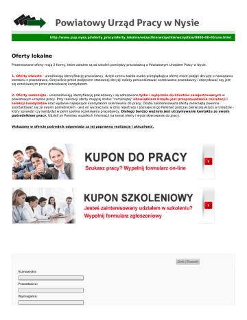 http://www.pup.nysa.pl/oferty_pracy/oferty_lokalne/wszystkie/wszystkie/wszystkie/0000-00-00/u/w.html Oferty lokalne Prezentowane oferty mają 2 formy, które zależne są od ustaleń pomiędzy pracodawcą a Powiatowym Urzędem Pracy w Nysie. 1. Oferty otwarte - umożliwiają identyfikację pracodawcy, dzięki czemu każda osoba przeglądająca ofertę może podjąć decyzję o nawiązaniu kontaktu z pracodawcą. Oczywiście przed podjęciem stosownej decyzji należy przeanalizować oczekiwania pracodawcy i zdecydować czy jest się oczekiwanym przez pracodawcę kandydatem. 2. Oferty zamknięte - uniemożliwiają identyfikację pracodawcy i są adresowane tylko i wyłącznie do klientów zarejestrowanych w powiatowym urzędzie pracy. Przy realizacji oferty mającej status "zamkniętej" obowiązkiem Urzędu jest przeprowadzenie rekrutacji i selekcji kandydatów oraz wydanie najlepszym kandydatom skierowania do pracy. Osoba zainteresowana ofertą zamkniętą powinna skontaktować się ze swoim pośrednikiem - jest on wyznaczany w dniu rejestracji i poznajecie go Państwo podczas pierwszej wizyty w Urzędzie który sprawdzi czy kandydat w pełni spełnia oczekiwania pracodawcy. Dlatego bardzo ważnym jest utrzymywanie kontaktu ze swoim pośrednikiem pracy. Udzieli on Państwu wszelkich informacji na temat oferty i wyda skierowanie do pracy. Wskazany w ofercie pośrednik odpowiada za jej poprawną realizację i aktualność. Oferty zamieszczone na tej stronie są aktualizowane raz dziennie. Wszystkie zmiany i nowe oferty zgłoszone do PUP w danym dniu, ukażą się na stronie następnego dnia roboczego. ostatnia aktualizacja: 03.03.2017 Wyszukiwarka ofert: Stanowisko: Pracodawca: Wymagania: ( kliknij aby pokazać / ukryć ) Ważne od (rrrr-mm-dd): Kategoria: wszystkie ▼ Wyszukaj oferty: - Wszystkie - Oferty lokalne - Dla niepełnosprawnych - Staże - Prace interwencyjne - Roboty publiczne - Oferta konkursowa - Doposażenie stanowiska pracy X znaleziono ofert: 104 (strona 1/6) ● ● ● ● ● ● 1 2 3 4 5 6 Stanowisko Referent ds. transportu Asystent Zarządu Sprzedawca Nr oferty Lokalizacja Ważna od HLT sp. z o.o. StPr/17/0619 48-340 Głuchołazy, ul. Grunwaldzka 2a 2017-03-03 HLT sp. z o.o. StPr/17/0618 48-340 Głuchołazy, ul. Grunwaldzka 2a 2017-03-03 Oferta zamknięta. Dane pracodawcy dostępne w urzędzie StPr/17/0611 Nysa 2017-03-02 Pracownik działu handlowego Sprzątaczka Pracodawca Majewski Fensterfabrik Sp. z o.o StPr/17/0614 48-300 Nysa, ul. SAPERSKA 9 2017-03-02 Finance & Property Management StPr/17/0612 48-300 Skorochów, ul. 21k 2017-03-02 Nauczyciel Kucharz Kamieniarz Zespół Placówek Specjalnych StPr/17/0615 48-300 Nysa, ul. GRODKOWSKA 54 2017-03-02 Finance & Property Management StPr/17/0613 48-300 Skorochów, ul. 21k 2017-03-02 Oferta zamknięta. Dane pracodawcy dostępne w urzędzie StPr/17/0610 Otmuchów 2017-03-02 Kierowca autobusu Kierowca ciągnika siodłowego Monter zabudowy do pojazdów samochodowych EDBUS Edward Stencel StPr/17/0624 56-300 Sułów, ul. Żmigrodzka 28 2017-03-01 PTHU Lider Henryk Gąsiorek StPr/17/0601 48-330 Nowy świętów, ul. 97 2017-03-01 Auto-Profi-Studio Sp.C. Halina Szubert, Jan Szubert StPr/17/0597 48-300 Hanuszów, ul. Hanuszów 25 Pracownik wykończenia wnętrz Sprzedawca/kelner FHU Bestbud Andrzej Bronka StPr/17/0587 48-330 Wilamowice Nyskie, ul. Wilamowice Nyskie 18 2017-02-28 Oferta zamknięta. Dane pracodawcy dostępne w urzędzie StPr/17/0584 Gryżów 2017-02-28 Specjalista ds jakości Specjalista ds technicznych Szwaczka Mechanik pojazdów samochodowych 2017-03-01 Fabryka Armatur Głuchołazy s.a. StPr/17/0589 48-340 Głuchołazy, ul. Wrocławska 1A 2017-02-28 Fabryka Armatur Głuchołazy s.a. StPr/17/0588 48-340 Głuchołazy, ul. Wrocławska 1A 2017-02-28 FHU Apis Joanna Adamczyk StPr/17/0550 48-340 Głuchołazy, ul. Kolejowa 8 2017-02-27 Oferta zamknięta. Dane pracodawcy dostępne w urzędzie StPr/17/0561 Nysa 2017-02-27 Sprzedawca Oferta zamknięta. Dane pracodawcy dostępne w urzędzie StPr/17/0557 Goświnowice 2017-02-27 Oczyszczacz konstrukcji stalowych Monter konstrukcji stalowych Montażysta Oferta zamknięta. Dane pracodawcy dostępne w urzędzie StPr/17/0555 Konradowa 2017-02-27 Oferta zamknięta. Dane pracodawcy dostępne w urzędzie StPr/17/0537 Nysa 2017-02-23 Oferta zamknięta. Dane pracodawcy dostępne w urzędzie StPr/17/0385 Jelcz-Laskowice 2017-02-23 Szwacz Tetris Elżbieta Frankiewicz StPr/17/0531 48-321 Wyszków Śląski, ul. Wyszków Śląski 34 A 2017-02-23 Koordynator do spraw rozwoju sieci POLSKA SIEĆ HANDLOWA "PIONIER" SP. Z O.O. StPr/17/0544 48-300 Nysa, ul. Otmuchowska 46 Pomoc kuchenna PHU Agnieszka Żurakowska Dębowe Wzgórze StPr/17/0536 48-267 Pokrzywna, ul. Pokrzywna 48 2017-02-23 Pracownik Gospodarczy Doradca - kasjer Konstruktor PHU Agnieszka Żurakowska Dębowe Wzgórze StPr/17/0539 48-267 Pokrzywna, ul. Pokrzywna 48 2017-02-23 PKO BANK POLSKI SA StPr/17/0533 48-370 Paczków, ul. SIENKIEWICZA 2b 2017-02-23 Oferta zamknięta. Dane pracodawcy dostępne w urzędzie StPr/17/0532 Paczków 2017-02-23 Kierowca samochodu ciężarowego Pracownik magazynowy 2017-02-23 Transport Towarowy Import-Export Mario StPr/17/0516 48-303 Nysa, ul. Pomorska 8 2017-02-22 Oferta zamknięta. Dane pracodawcy dostępne w urzędzie StPr/17/0515 Bielany Wrocławskie 2017-02-22 Szlifierz kamienia Oferta zamknięta. Dane pracodawcy dostępne w urzędzie StPr/17/0528 Kałków 2017-02-22 Pracownik składu opału Kontroler jakości Doradca Klienta Oferta zamknięta. Dane pracodawcy dostępne w urzędzie StPr/17/0529 Kałków 2017-02-22 Oferta zamknięta. Dane pracodawcy dostępne w urzędzie StPr/17/0512 Nysa 2017-02-22 Oferta zamknięta. Dane pracodawcy dostępne w urzędzie StPr/17/0484 Nysa 2017-02-21 Kierowca ciągnika siodłowego Mechanik pojazdów samochodowych Tłumacz języka niemieckiego Opiekunka w żłobku Doradca - kasjer mechanik Sprzedawca Kosmetyczka Recepcjonista Transport Towarowy Franciszek Raczyński StP
