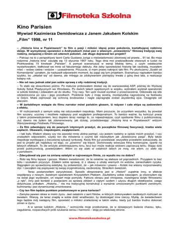 Kino Parisien Wywiad Kazimierza Demidowicza z Janem Jakubem Kolskim „Film” 1998, nr 11 – „Historia kina w Popielawach” to film o pasji i mi oci idcej przez pokolenia, kszta tujcej rodzinne dzieje. W wymylonej opowieci o Andryszkach mówi pan o w asnym „zniewoleniu” filmow tradycj swej rodziny, zwizanej z kinem od czterech pokole. Jak d ugo dojrzewa ten projekt? – Patrzc na to z perspektywy teorii Carla Gustawa Junga o niewiadomoci zbiorowej od prawie... 91 lat. Bo moja rodzinna „historia kina” zacza si 13 stycznia 1907 roku. Tego dnia moi pradziadkowie otworzyli w odzi na Piotrkowskiej 15 kinoteatr „Parisien”. A pomys scenariusza w wersji bliskiej temu, z czym ostatecznie wystartowaem, kiekowa we mnie od fabularnego debiutu. Ale eby opowiedzie histori tak osobist, musiaem mie – wobec siebie i widzów – uzasadnienie. Poczucie, i mam prawo nakrci taki film. Po ukoczeniu „Szabli od Komendanta” uznaem, e nadszed odpowiedni moment, by zaj si tym projektem. Scenariusz napisaem bardzo szybko, bo „ukada si” od dawna, ale mitrga ze zdobywaniem pienidzy trwaa z gór dwa lata, a realizacja kolejny rok. – Nie od razu jednak zda pan sobie spraw z si y rodzinnej tradycji. – To stao si stosunkowo póno. Po maturze próbowaem dosta si do warszawskiej ASP, póniej do Wyszej Szkoy Sztuk Plastycznych we Wrocawiu. Po dwóch latach spdzonych w wojsku, wybraem wydzia operatorski w szkole ódzkiej i zdawaem a do skutku. Trzy razy. Ten upór musia wynika z przeznaczenia. Odezwaa si sia odziedziczona po ojcu i jego przodkach. Podobnie byo z moj siostr, montaystk nagrodzon na festiwalu w Gdyni. Miaa zajmowa si ochron rodowiska i nagle zapragna zosta asystentk ojca. Osigna cel paczem. – W artobliwym wstpie do filmu narrator mówi paskim g osem, i reyser i ca a ekipa s zadowoleni z efektu. – W rozliczeniach z samym sob nie odczuwaem niepokoju. Mam poczucie, e uczyniem wszystko, by powsta film szczery, uczciwy i moliwie najlepszy pod wzgldem profesjonalnym. To bardzo wane, by koczy prac z takim przewiadczeniem, lecz dopiero teraz nastpi to, co najwaniejsze, czyli spotkanie filmu z publicznoci. Ju dawno nie byem tak zdenerwowany, jak dzisiaj, przedstawiajc „Histori kina w Popielawach” widzom Warszawskiego Festiwalu Filmowego. – Za film odwo ujcy si do pewnych intymnych przey, do pocztków filmowej fascynacji, trzeba wiele zap aci. Obawami, niepokojami, zwtpieniami. – I tak byo. Miaem obawy czy nie zawodzi mnie ulotna pami, czy jestem rzetelny w opisie moich przey. I czy znalazem odpowiedni, czysty ton dla mówienia o czym tak niezwykym jak „dziedziczna pasja”. Byy take niepokoje wynikajce z ówczesnej sytuacji rynkowej. Kiedy film ju powstawa, wszystkie przesanki wskazyway, e jest to projekt jak najdalszy od tego, co „powinno” si krci. Dominoway wówczas filmy komercyjne, oparte na atwych efektach. To le wróyo ambitniejszemu kinu, lecz by moe reakcje widowni zaprzecz temu. Stajc dzi przed publicznoci, powiedziaem: Wiem co si stao w ostatnich latach ze mn, nie wiem, co stao si z pastwem. – Zdecydowa si pan na zmian estetyki w najnowszym filmie, co wysz o mu na dobre? – Robi si filmy lepsze i gorsze. Miaem wiadomo, e te ostatnie s sabsze od poprzednich. Przyjem to bez bólu i szukaem przyczyn. Zdaem sobie spraw, i z obawy o utrat wiernych mi widzów, zaniechaem ryzyka. Signem po sprawdzon estetyk, by potwierdzi, e – jak mówiono i pisano – Kolski ma wasny rozpoznawalny styl. I zaczem si popisywa t swoj oryginalnoci, osobnoci. Straciem wieo. Teraz postanowiem zaryzykowa. Sposób obrazowania jest w „Historii” zupenie inny, w efekcie wspópracy z nowym, wietnym operatorem Krzysztofem Ptakiem. Zaufalimy sobie nawzajem, ja otworzyem si na wiat jego wyobrani, on wspar moje pomysy. Faktura obrazu jest chropawa, rozedrgana dziki filmowaniu „z rki”, inny jest kontakt z postaciami za spraw zblie z citym czoem i uyciu dugich obiektywów, czego dotychczas unikaem. „Historia...” nie ma tradycyjnej konstrukcji z wyranie umocowanymi punktami zwrotnymi, kulminant i jest dynamiczniej zmontowana. – Czy ten film bdzie punktem prze omowym w pana karierze? – Zamyka pewien okres w moim yciu. Jest ostatnim z serii filmów, w których dokonywaem osobistych rozlicze ze wiatem. Wierz, e teraz znajd w sobie do wraliwoci, by dostrzega inne rzeczy. Myl, e wiadectwem tego bdzie mój nastpny film, opowie o mioci znalezionej w takim wieku, kiedy ju bardzo trudno dokona zmian w yciu. A w sensie ludzkim „Historia...” wzmocnia moje przekonanie, e w dzisiejszym wiecie chaosu, lku, zagubienia, rozpaczliwych prób szukania sensu i harmonii – stoj po waciwej stronie. www.filmotekaszkolna.pl